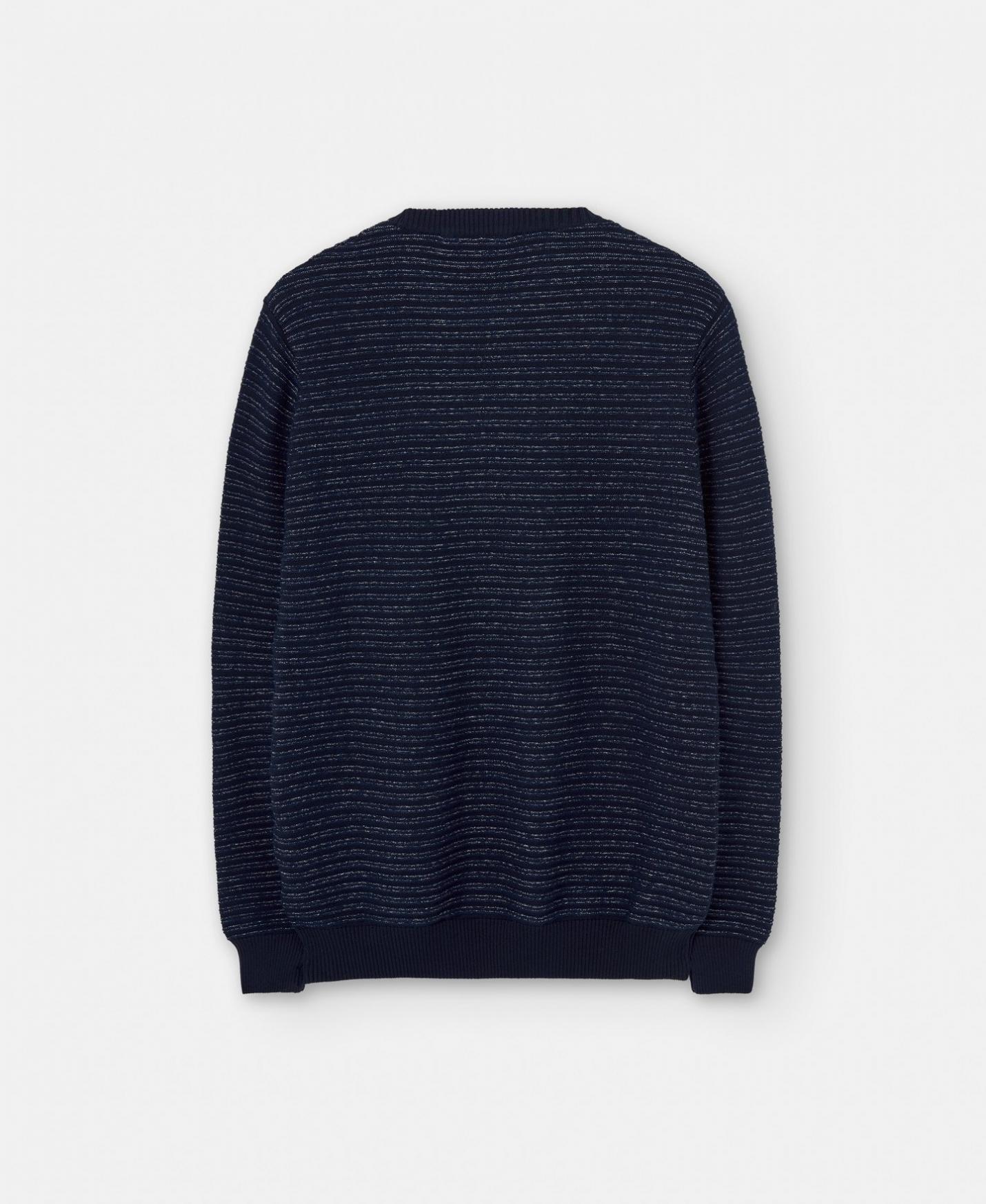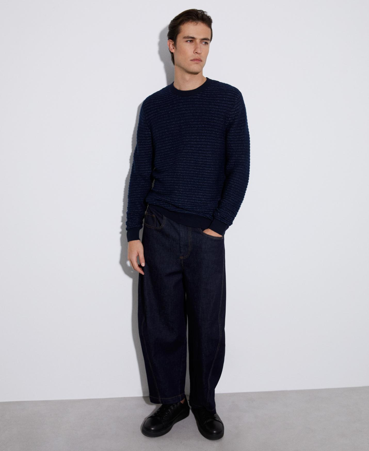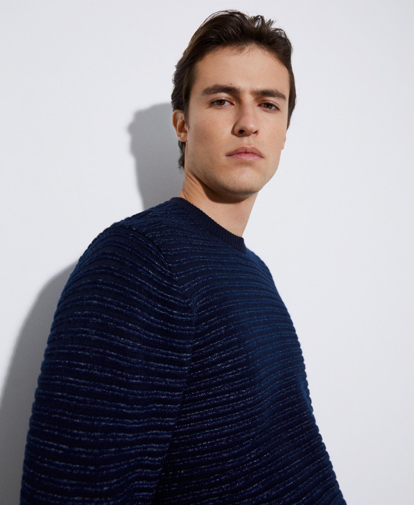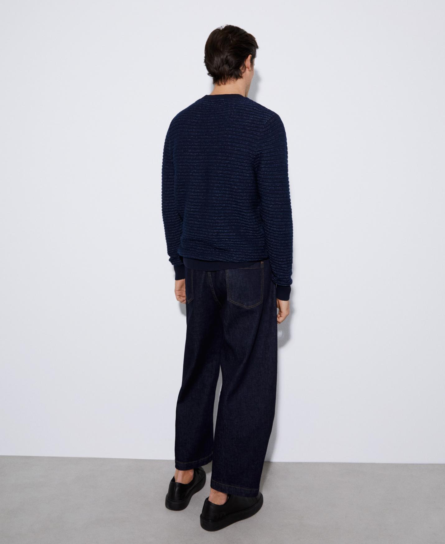 Jersey con estructura horizontal en algodón responsable. Tiene cuello redondo, estructura en punto horizontal y remates en rib.
