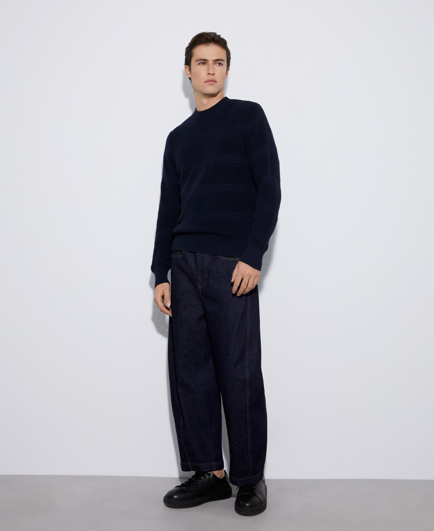 DescripciónRef.153141312121 Jersey con estructura horizontal en algodón responsable. Tiene cuello redondo, estructura en punto horizontal y rem…