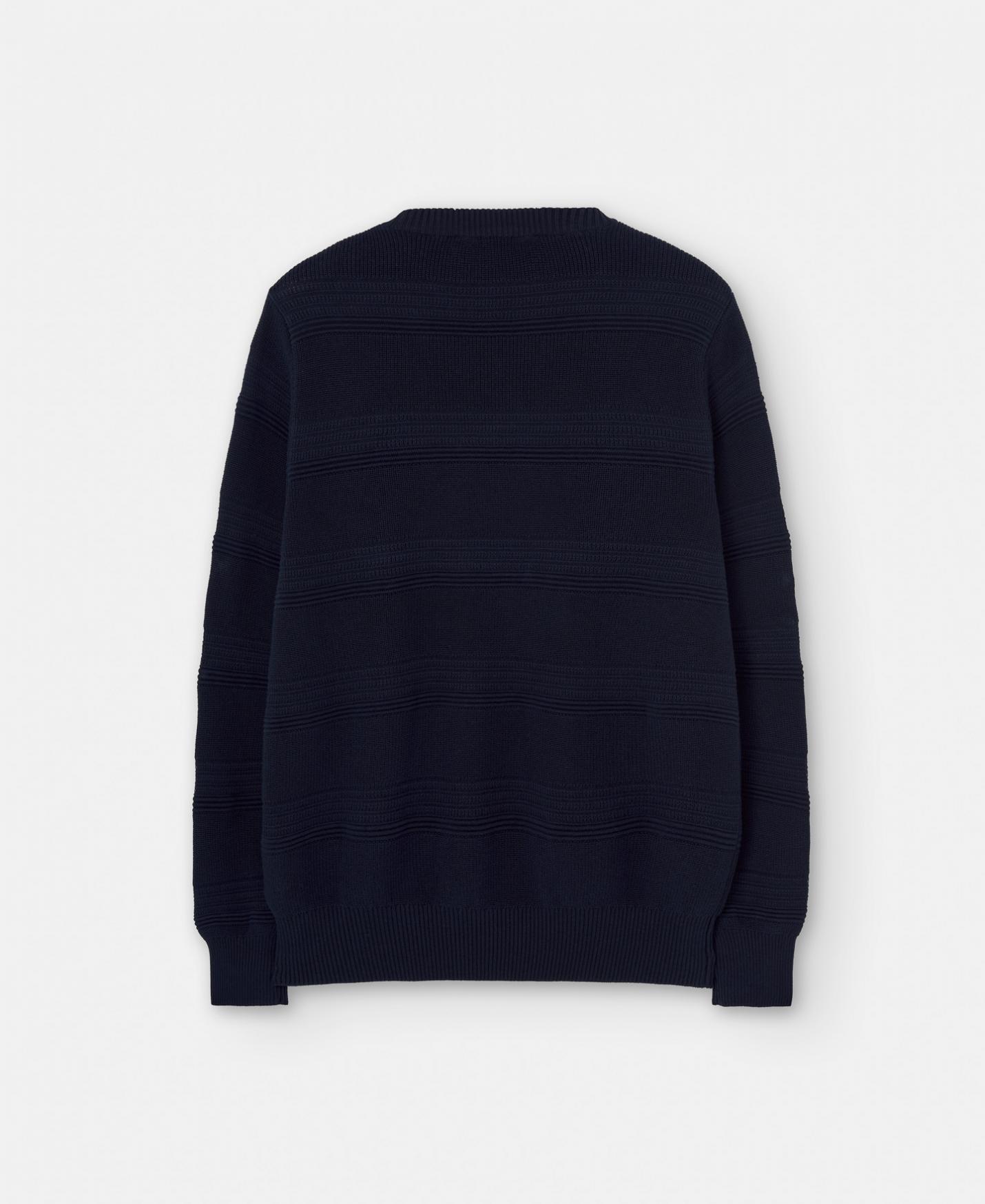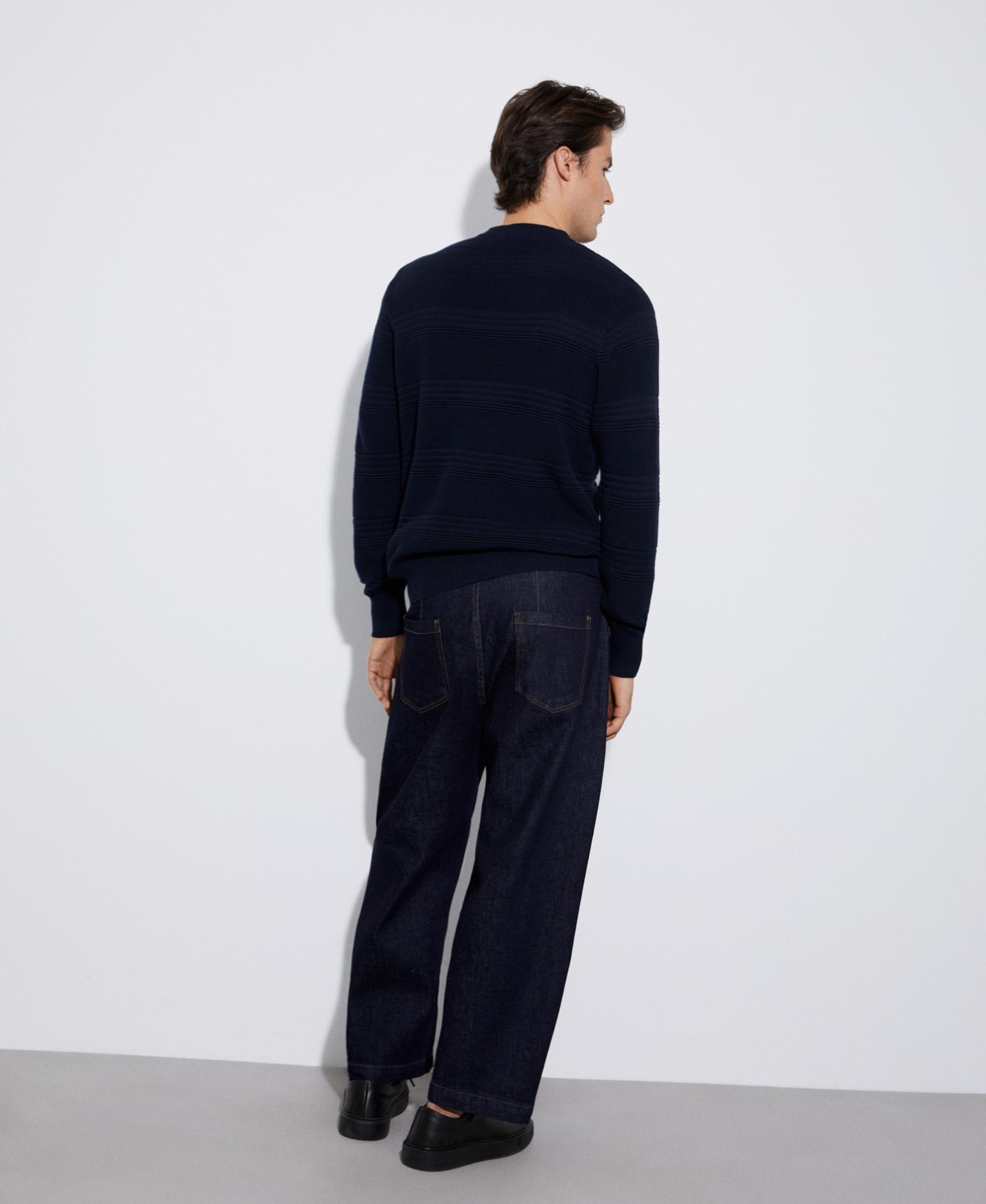 Jersey con estructura horizontal en algodón responsable. Tiene cuello redondo, estructura en punto horizontal y remates en rib.