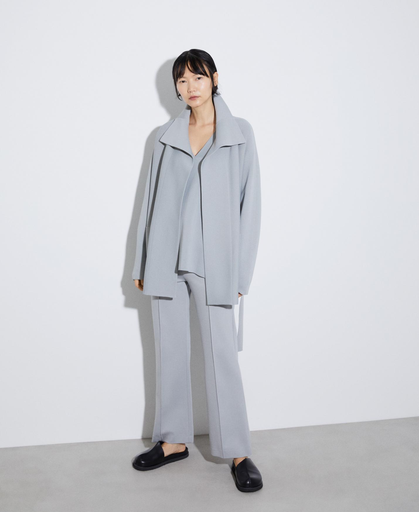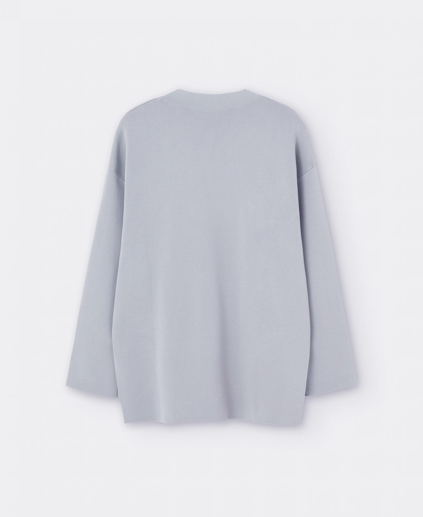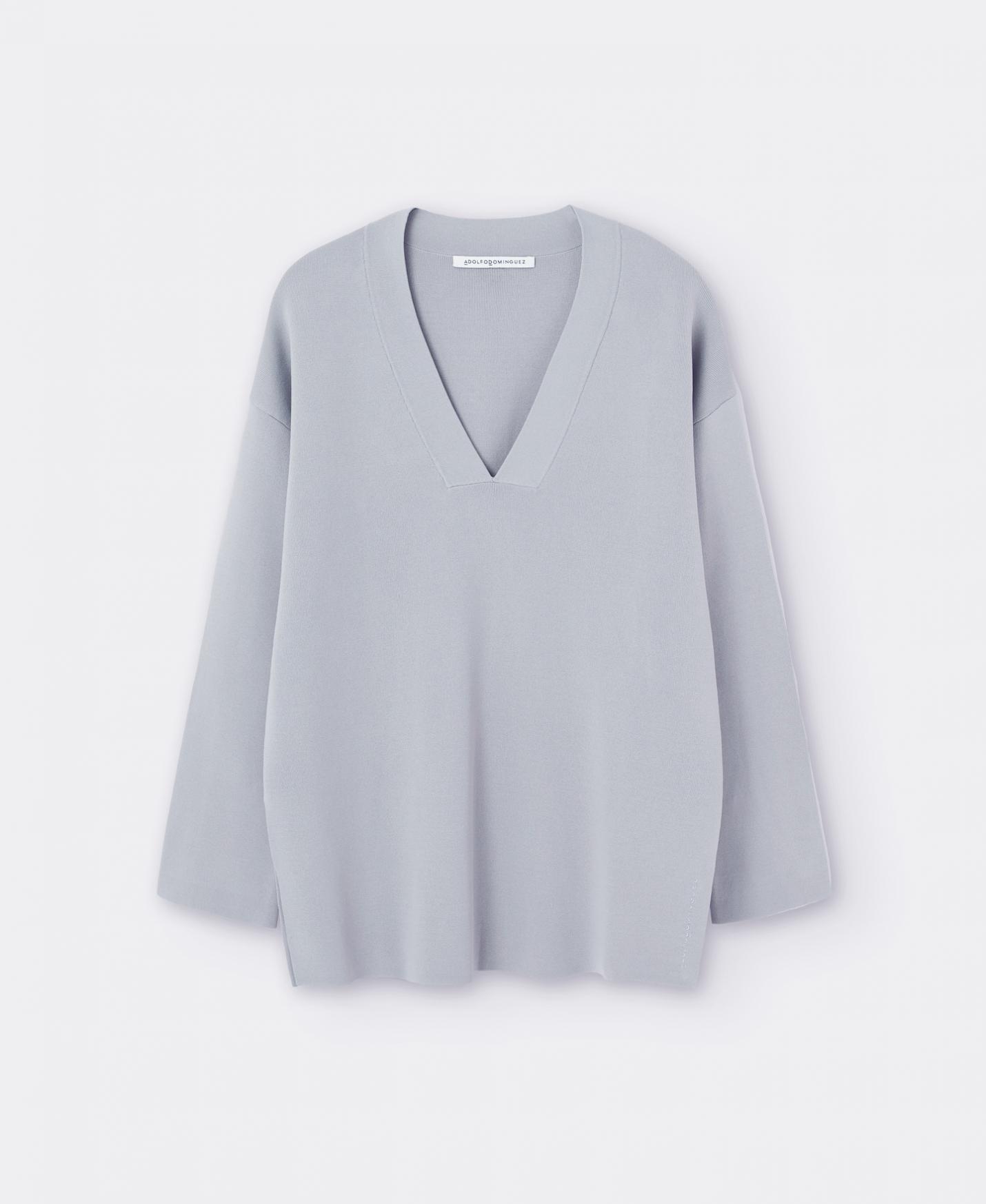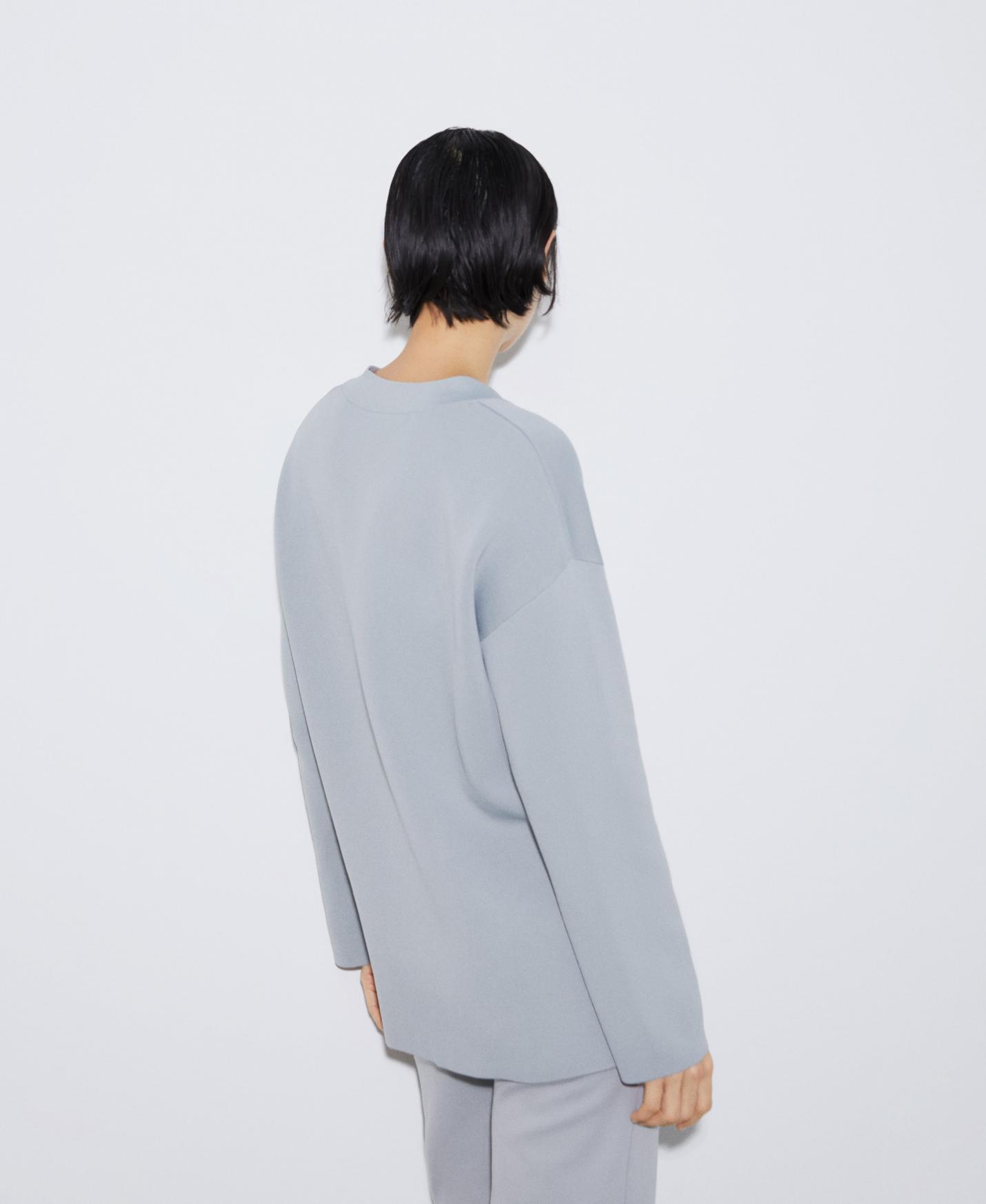 Jersey escote pico en nylon reciclado. En punto estructurado de doble frontura y escote con tiras tubulares. Manga larga y bajo recto.