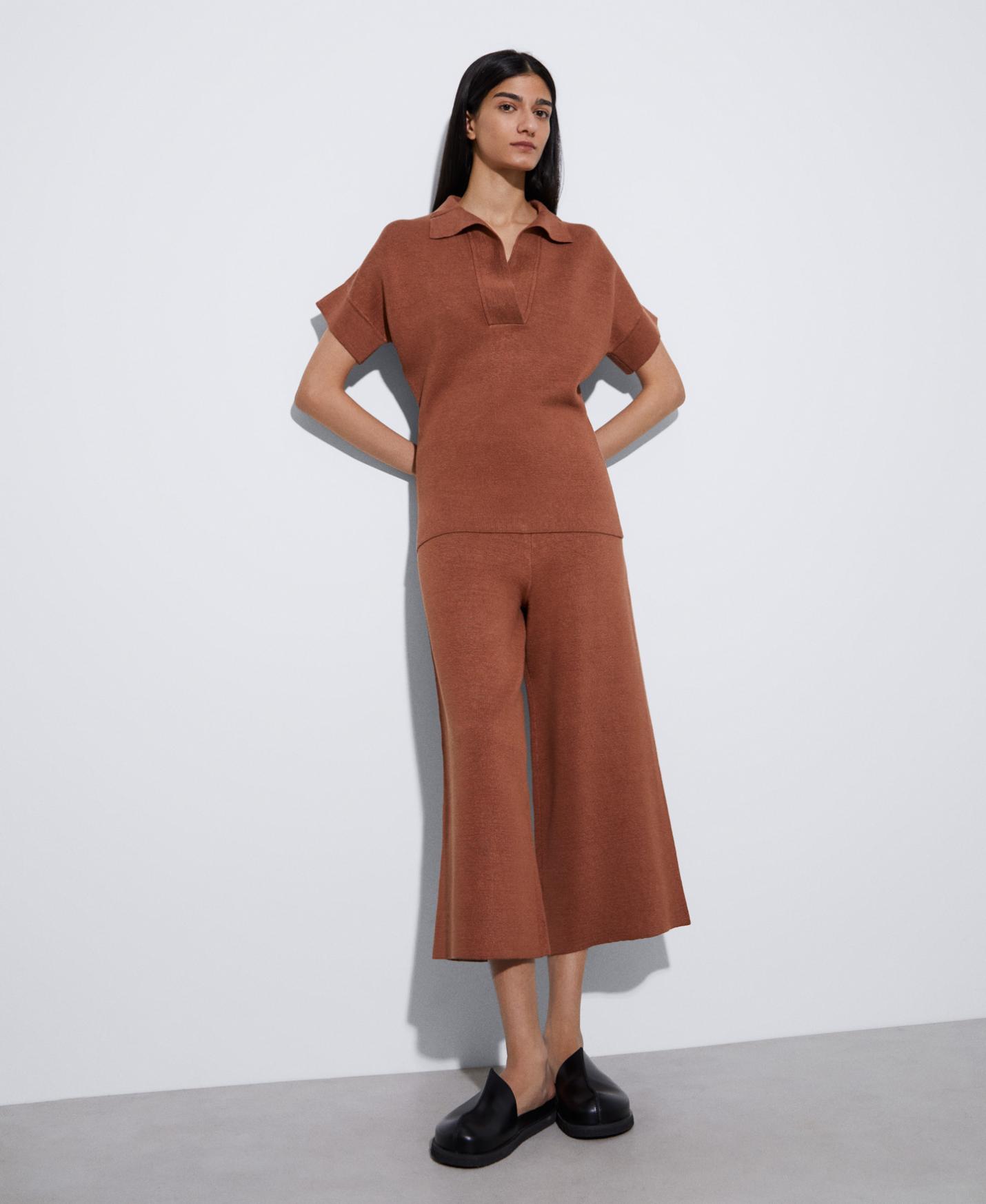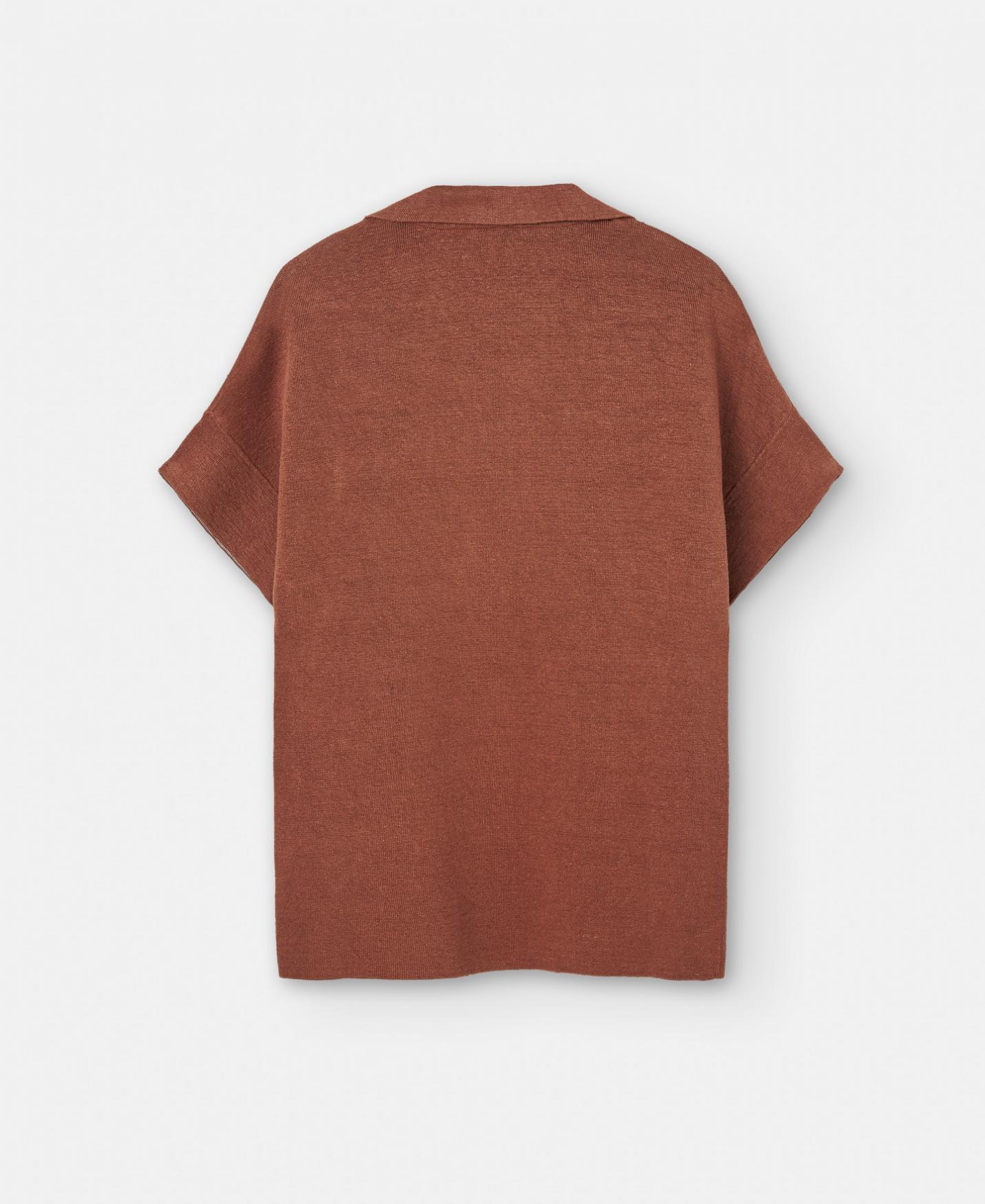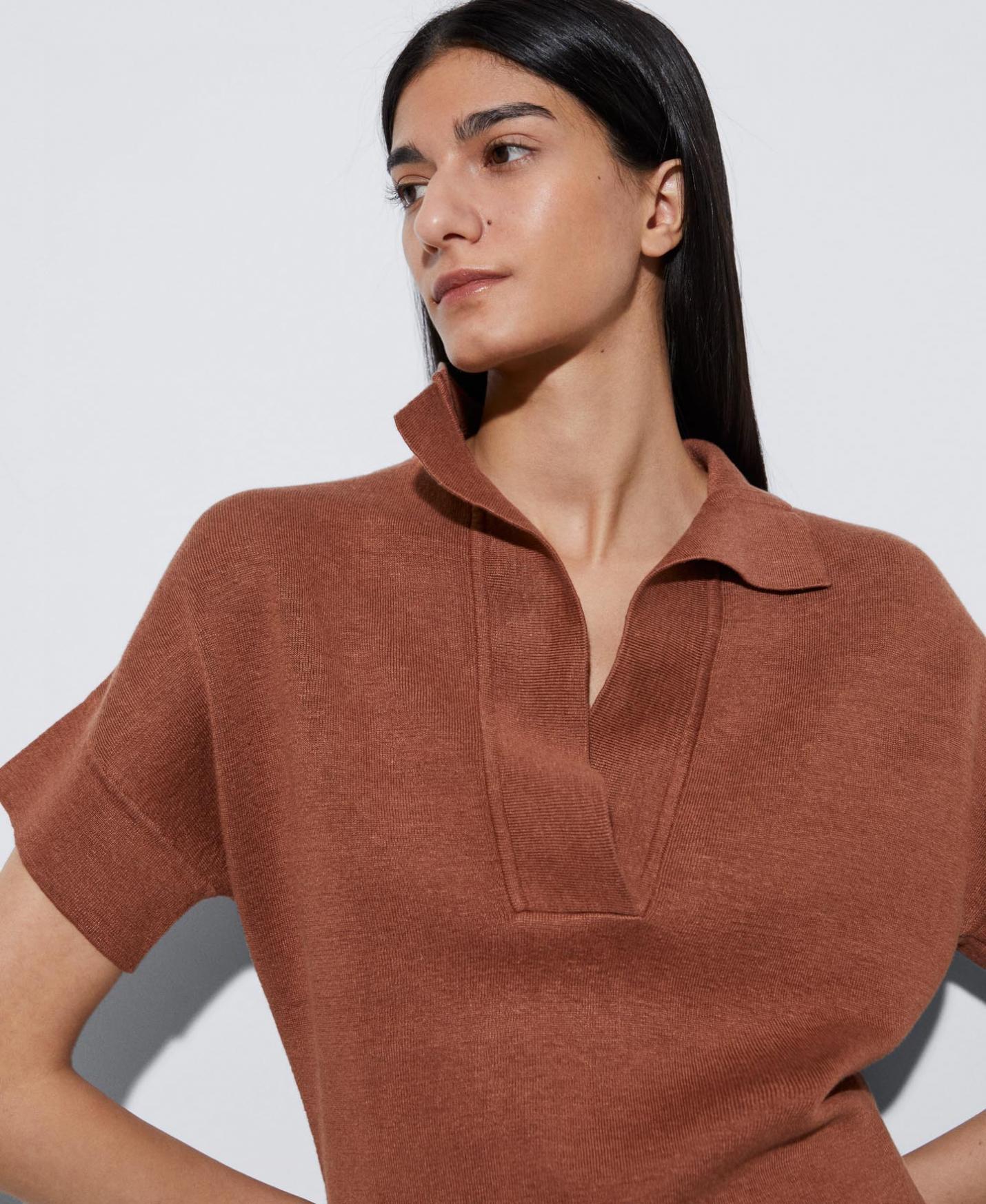 Jersey manga corta en punto de lino, viscosa y nylon. Tiene escote pico con cuello polo y manga corta.