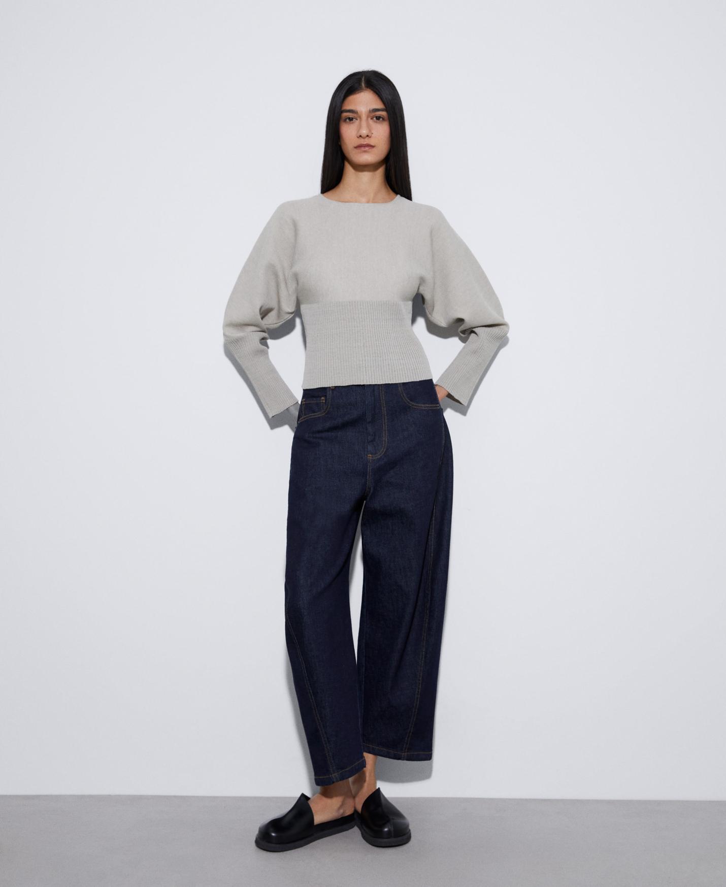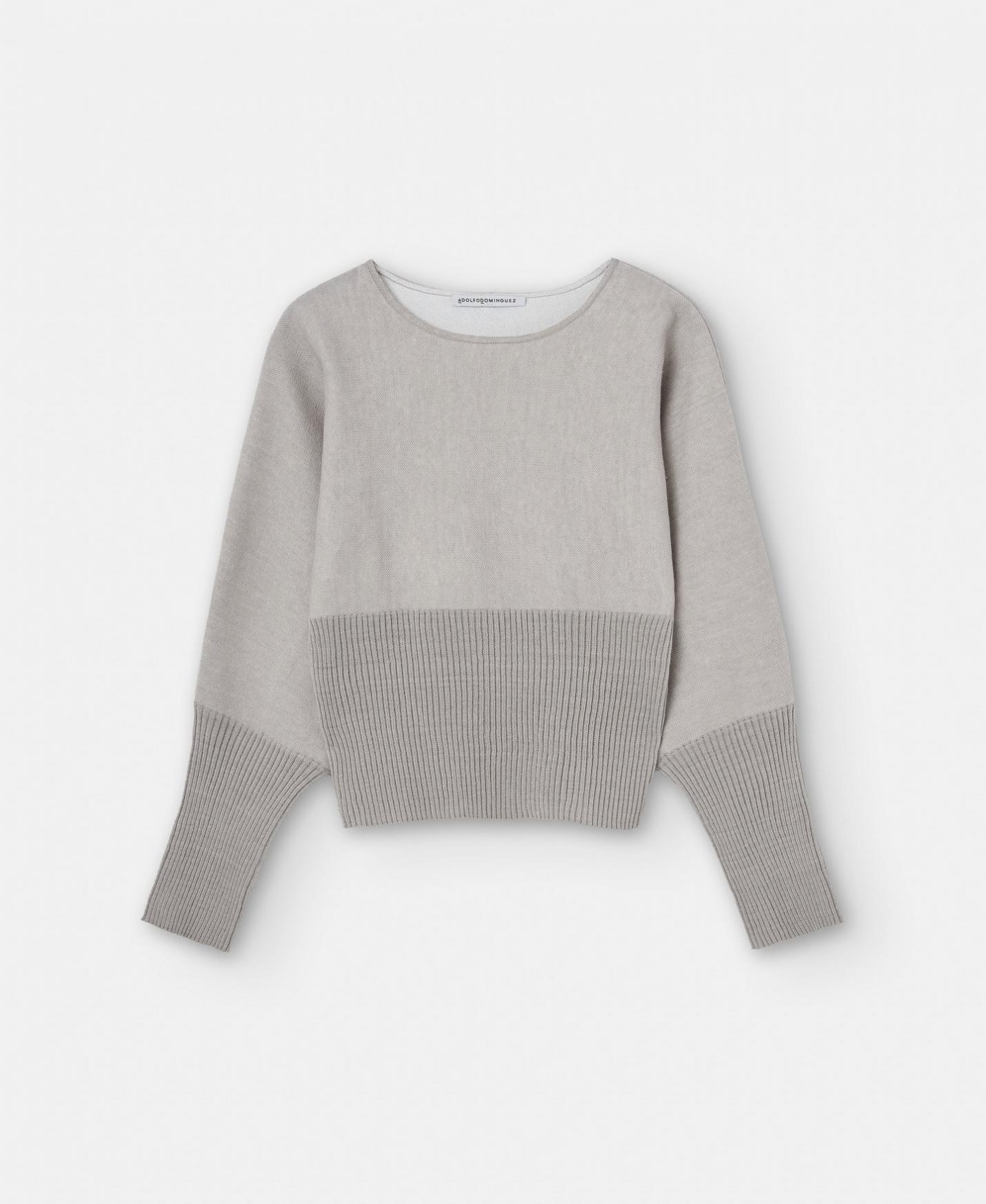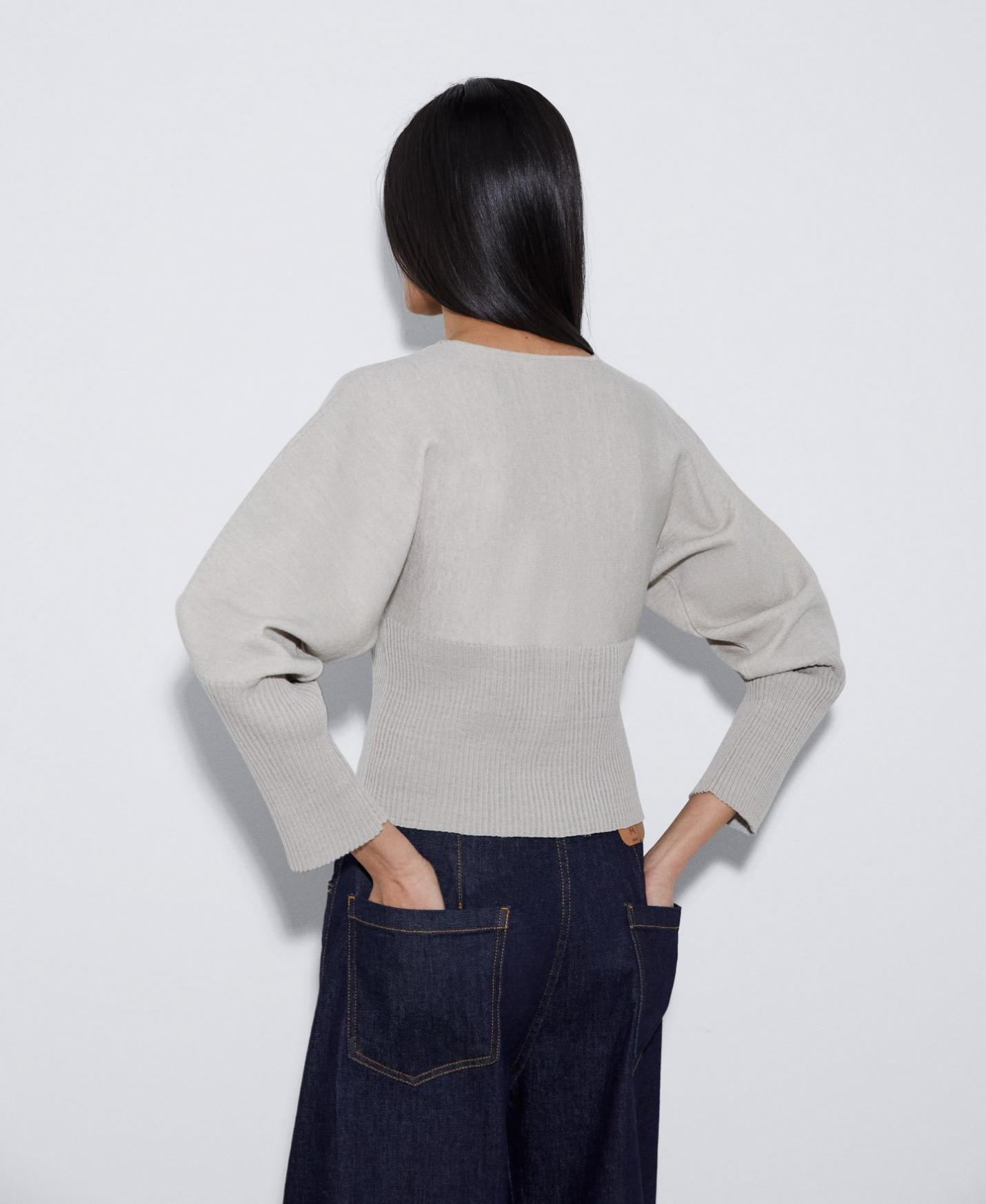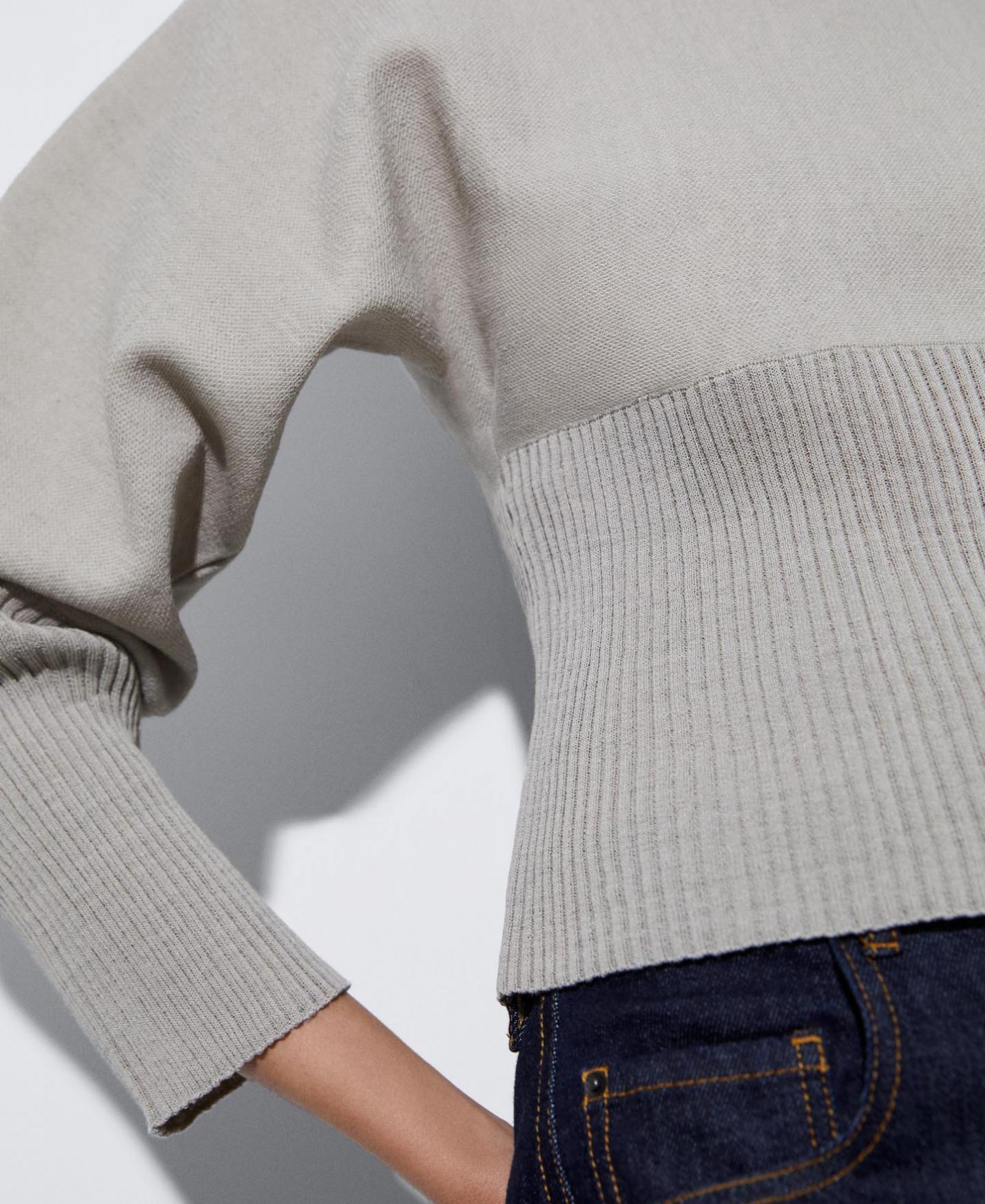 Jersey de doble frontura en lino, viscosa y nylon. Tiene cuello redondo, manga larga y rib ancho en puños y mangas.