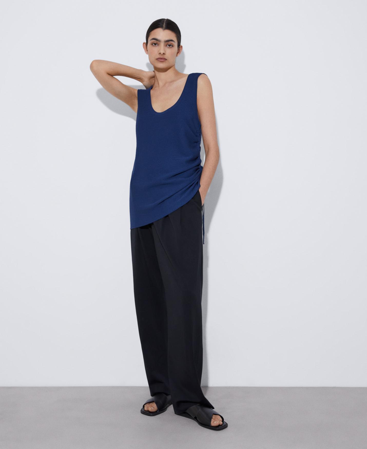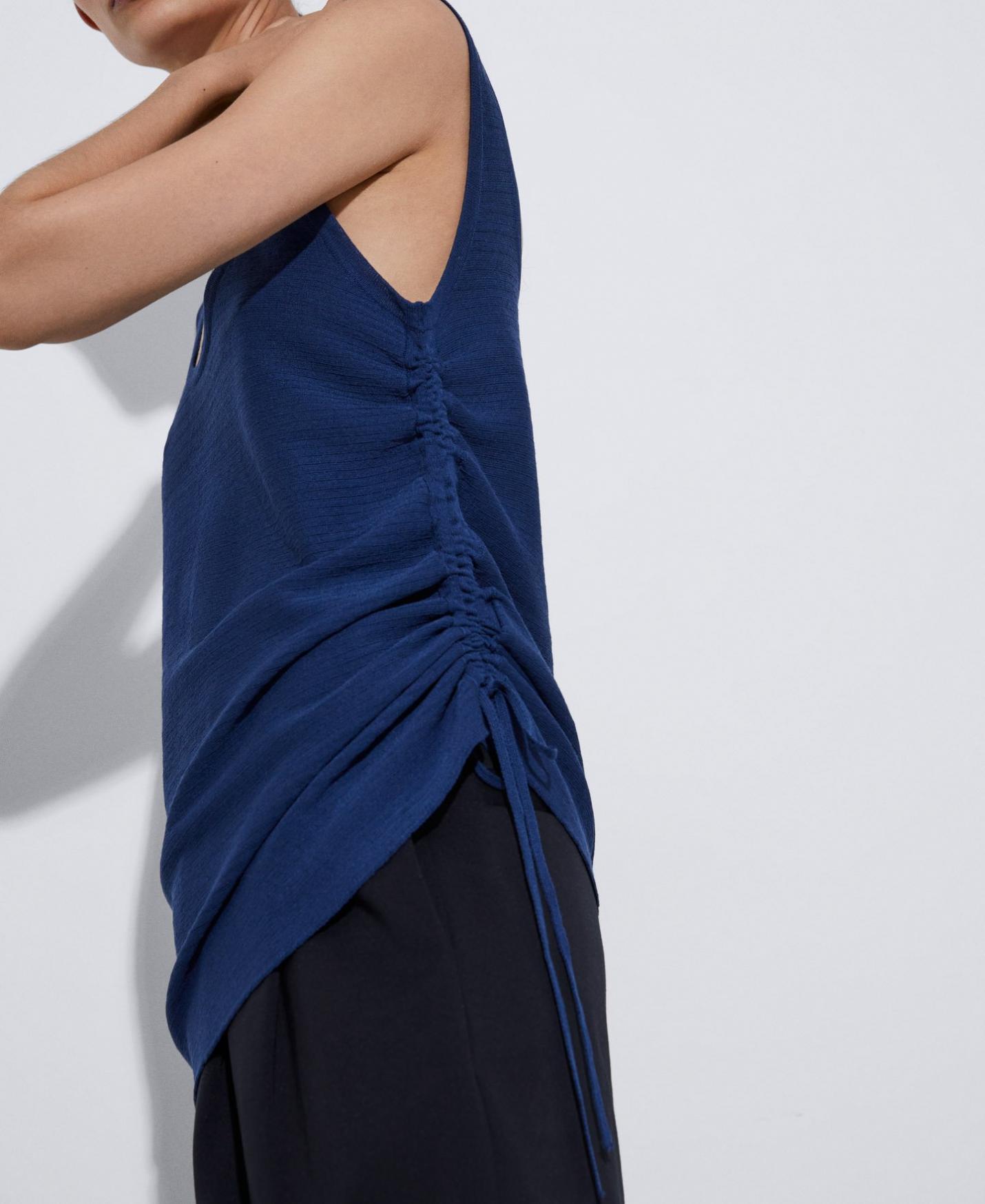 Top liso en punto de viscosa. Doble frontura. Frunce en lateral.