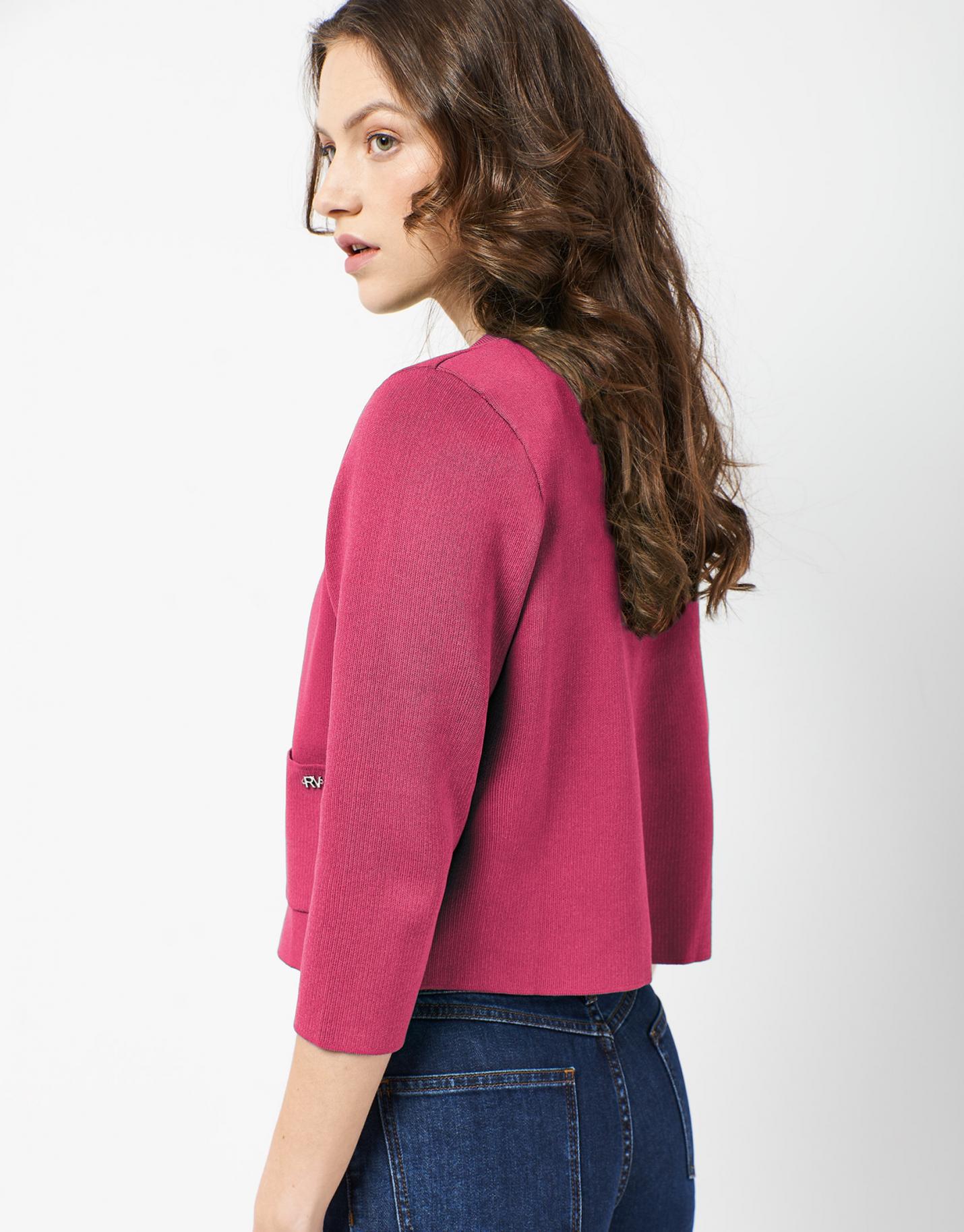 Chaqueta corta confeccionada en un punto fucsia. Cuello camisero, cierre con botón en parte superior y delantero con dos bolsillos.