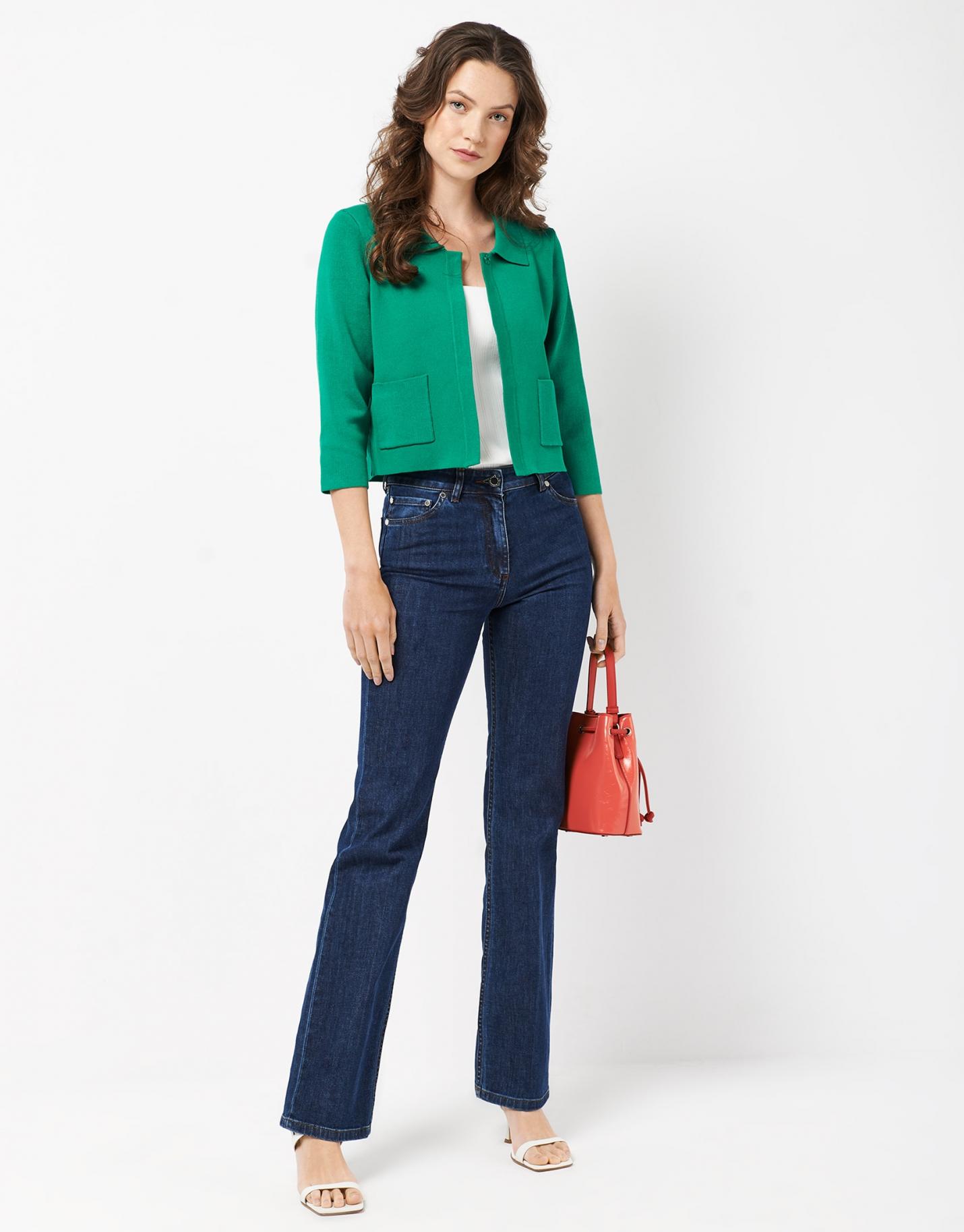 Chaqueta corta confeccionada en un punto verde. Cuello camisero, cierre con botón en parte superior y delantero con dos bolsillos. …