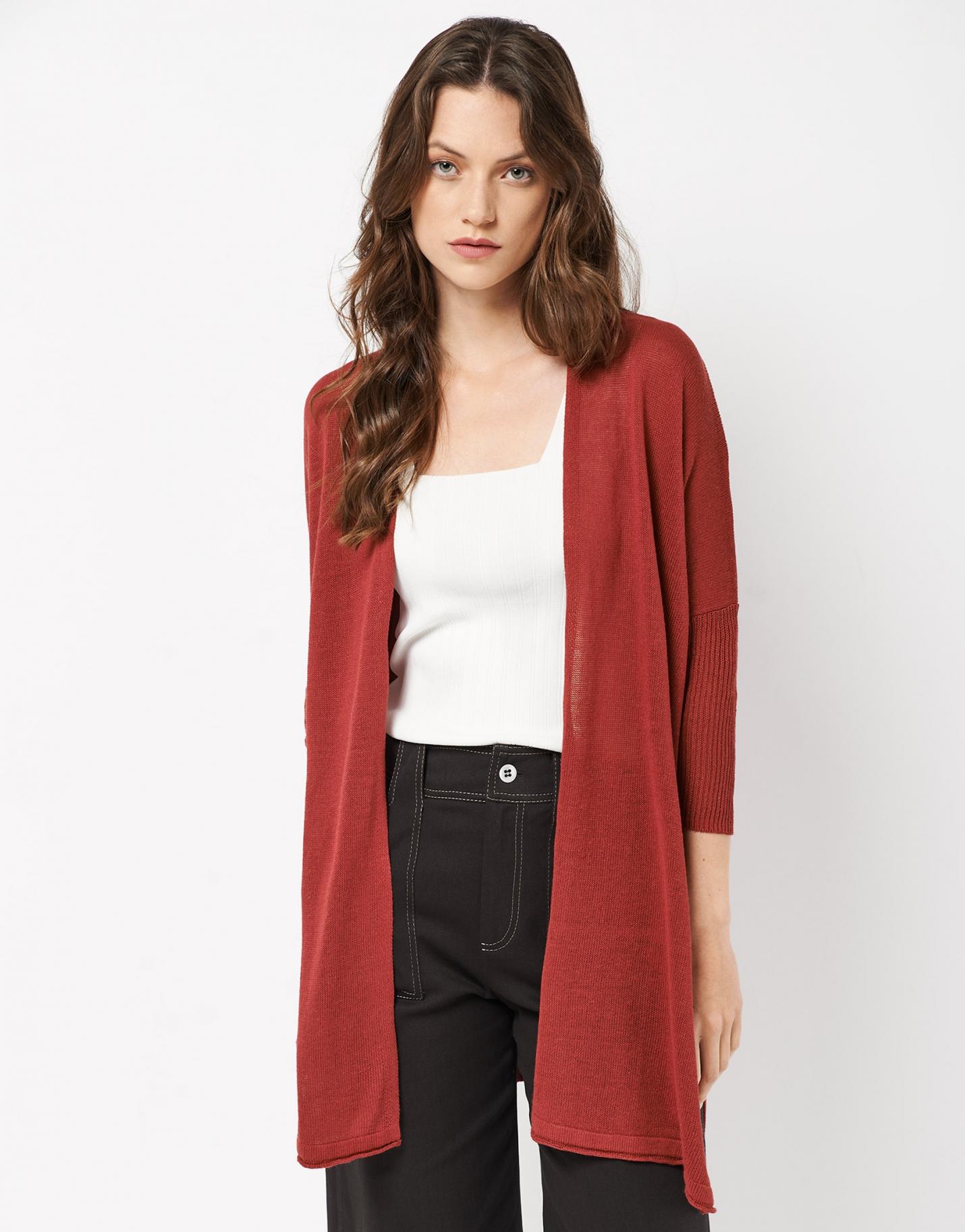 Chaqueta larga confeccionada en un punto color rojo, sin cierres ni cuello y con aberturas laterales. Manga murciélago ampl…