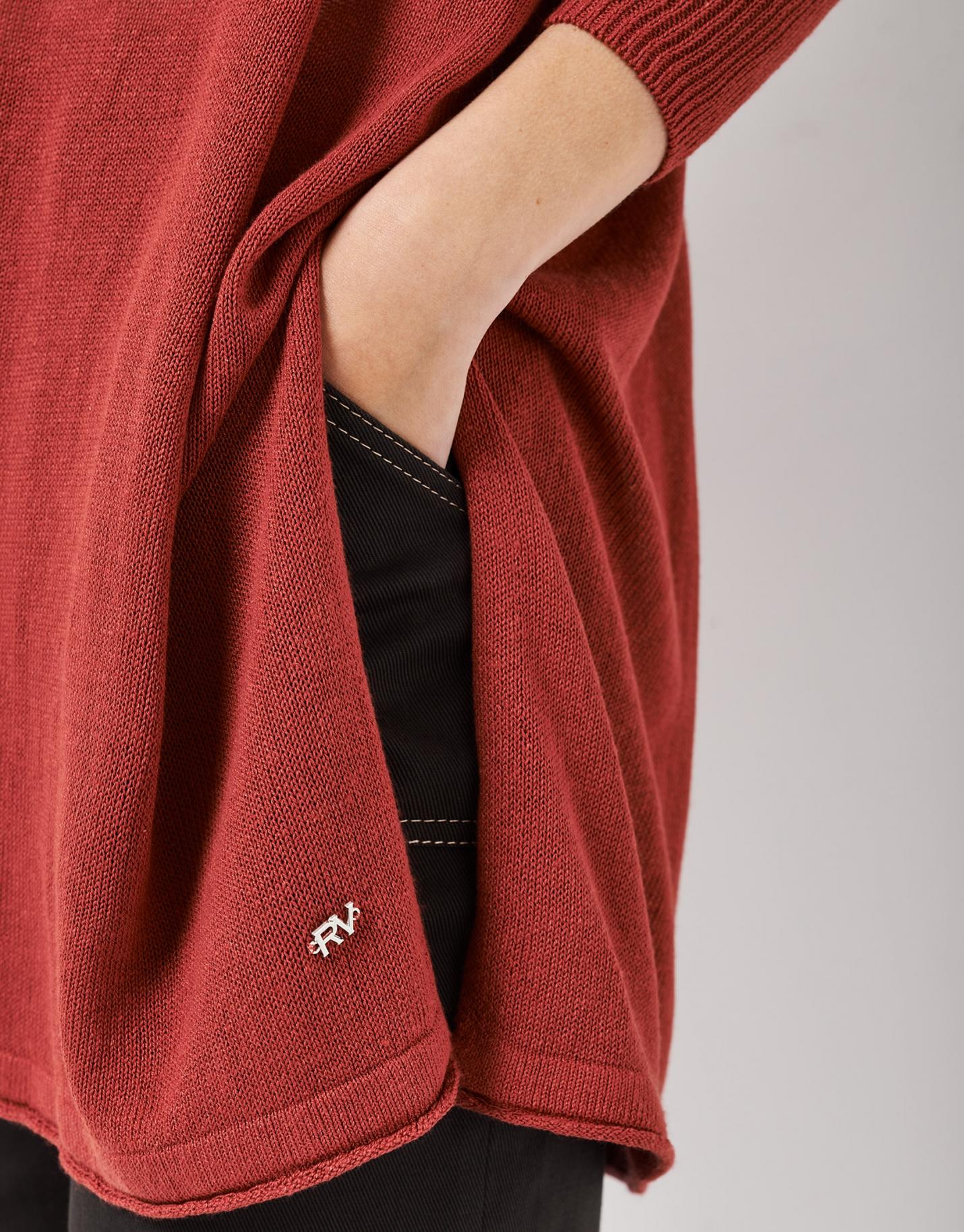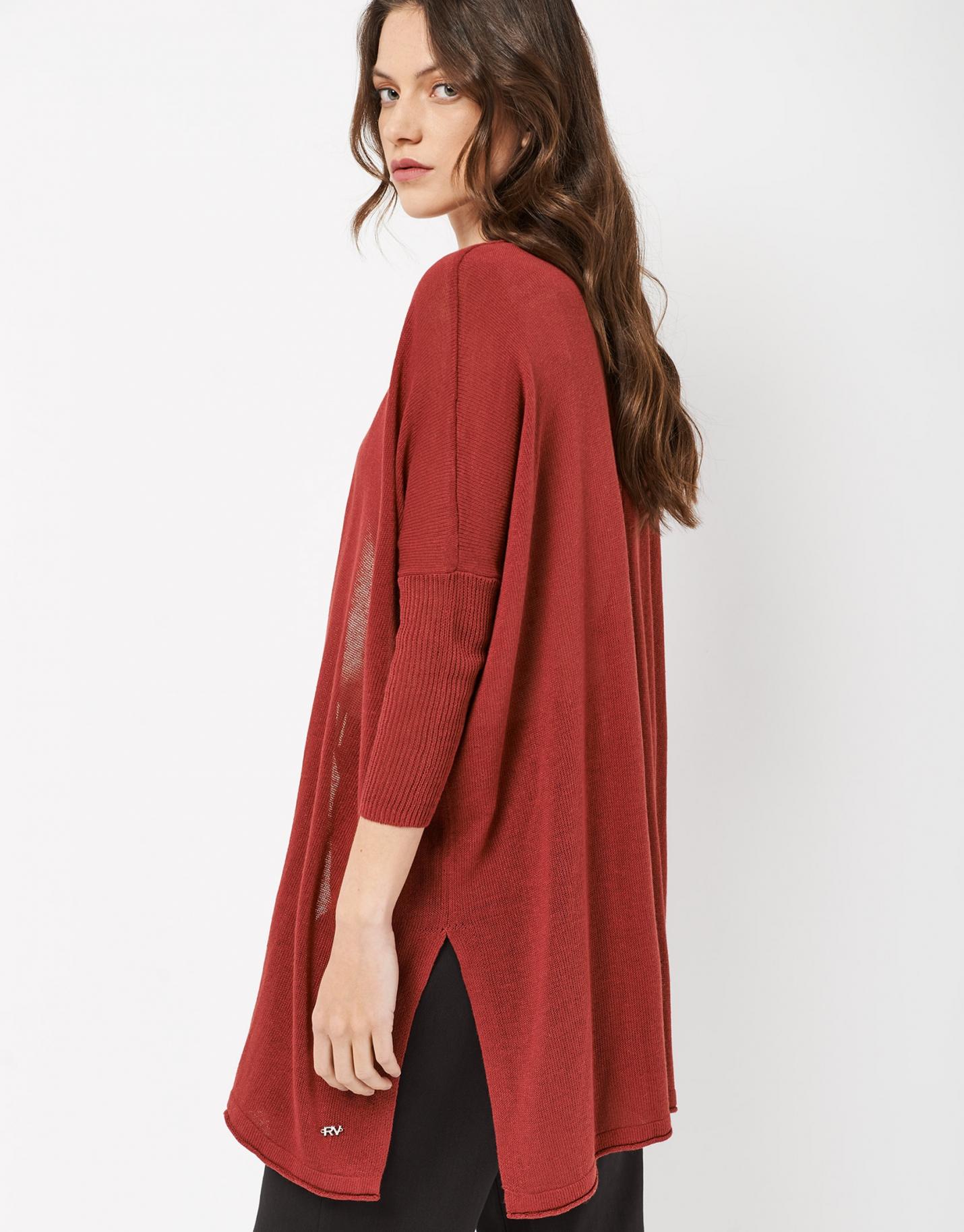 Chaqueta larga confeccionada en un punto color rojo, sin cierres ni cuello y con aberturas laterales. Manga murciélago amplia y ajustada en el bajo.