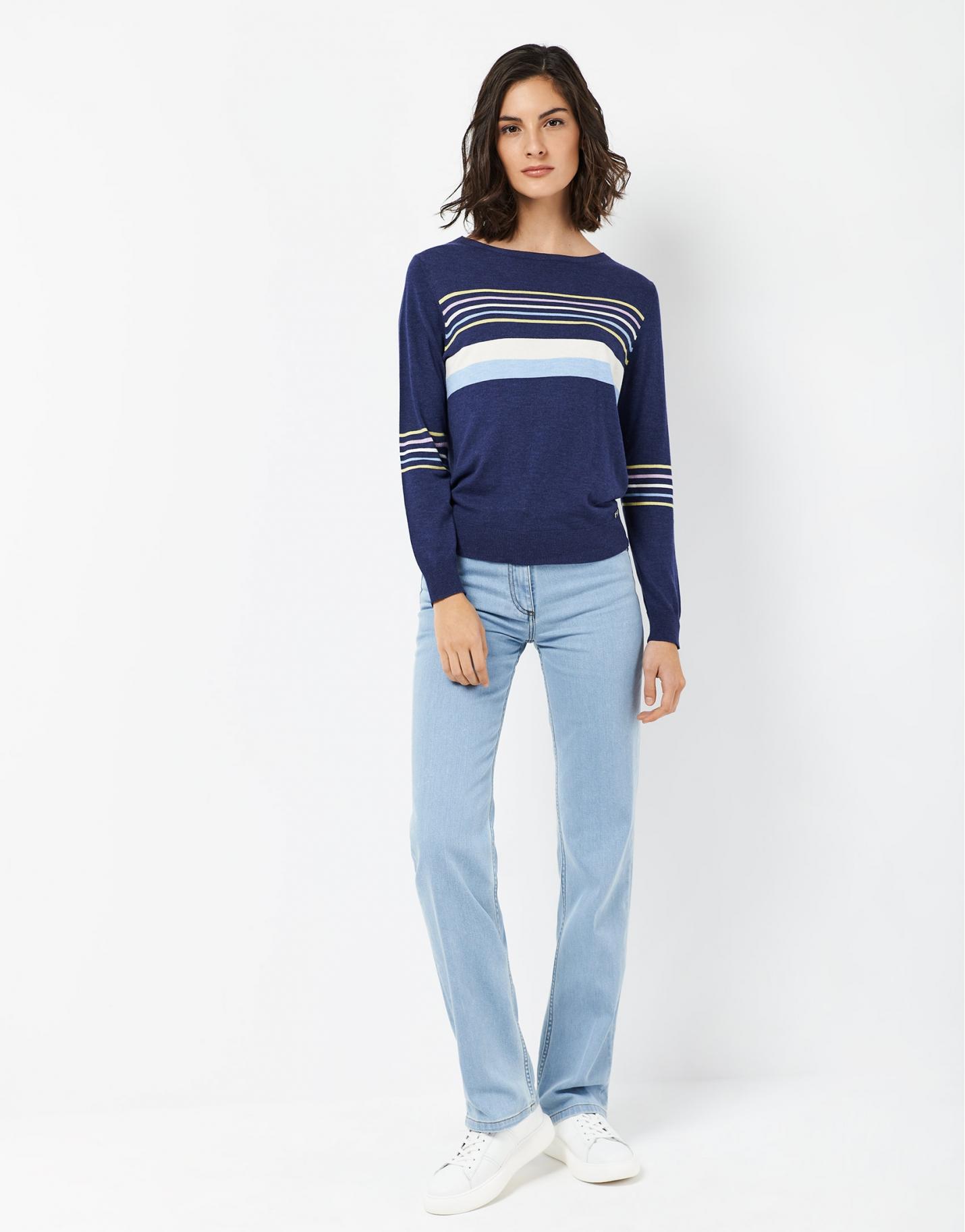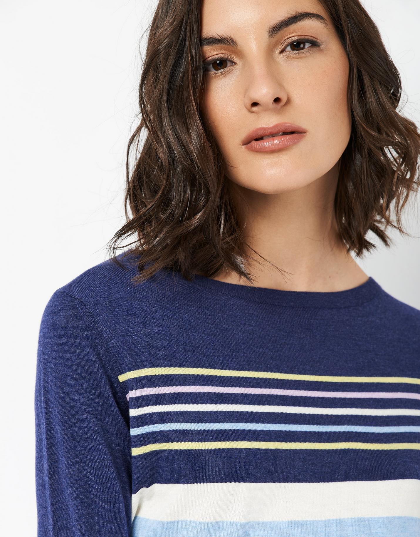 Jersey de manga larga confeccionado en un punto color azul marino con dibujo de rayas de varios colores y grosores en pecho y mangas. Escote barco, mangas y bajo rematados en canalé.