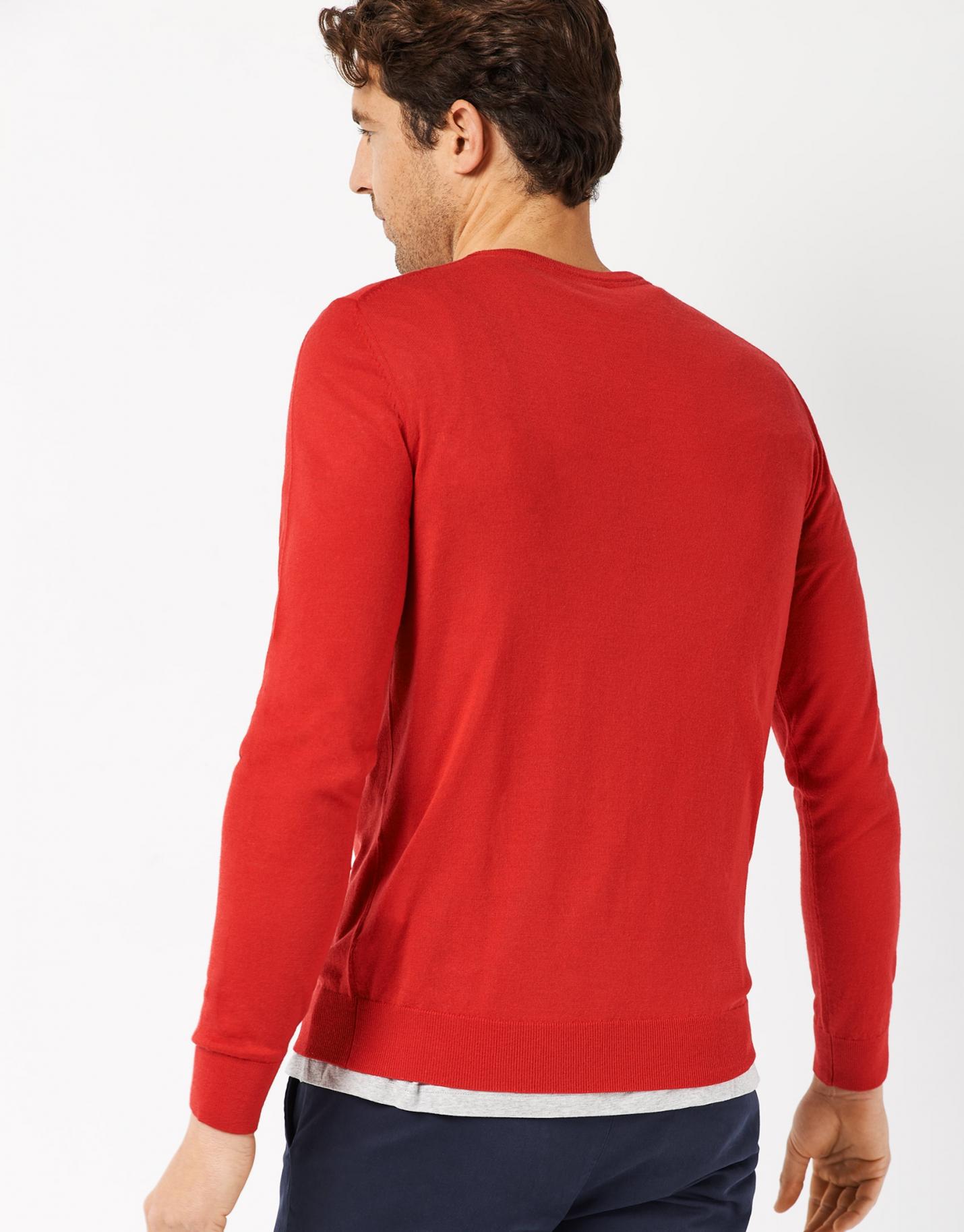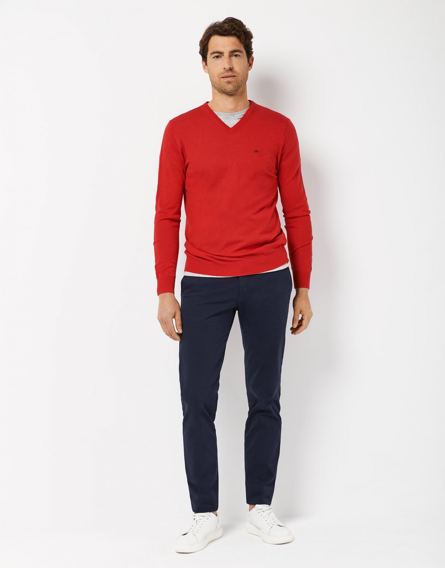 Jersey de cuello pico confeccionado en un punto de lana color rojo con interior de cuello a contraste en blanco. Puños, bajo y…
