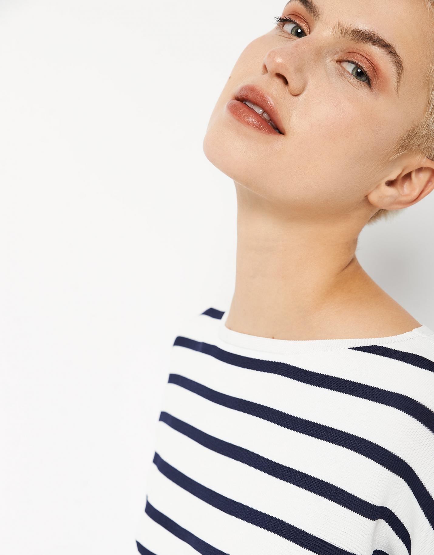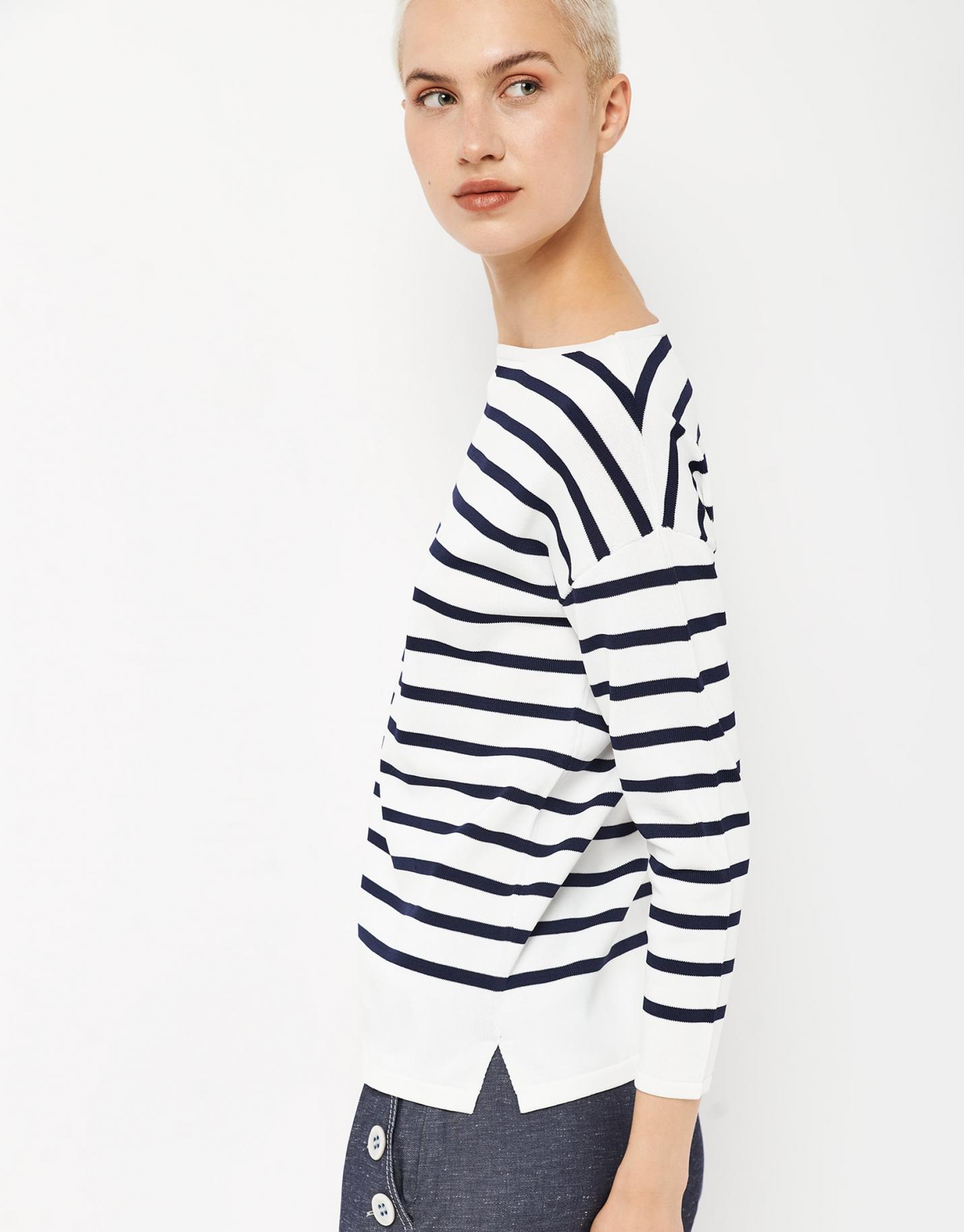 Jersey de manga larga confeccionado en un punto color blanco con listas en azul marino. Escote caja, manga ranglán, corte ancho y bajo con aberturas laterales.