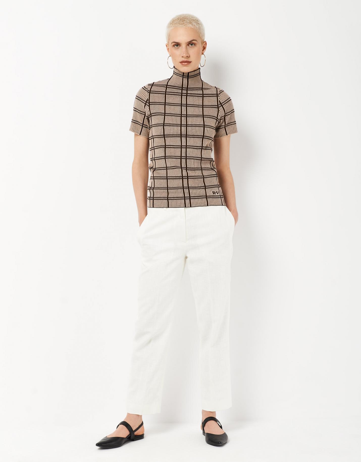 Jersey de manga corta y cuello mao confeccionado en un tejido de punto de canalé en cámel con diseño de líneas marrones en cuadrícula. …