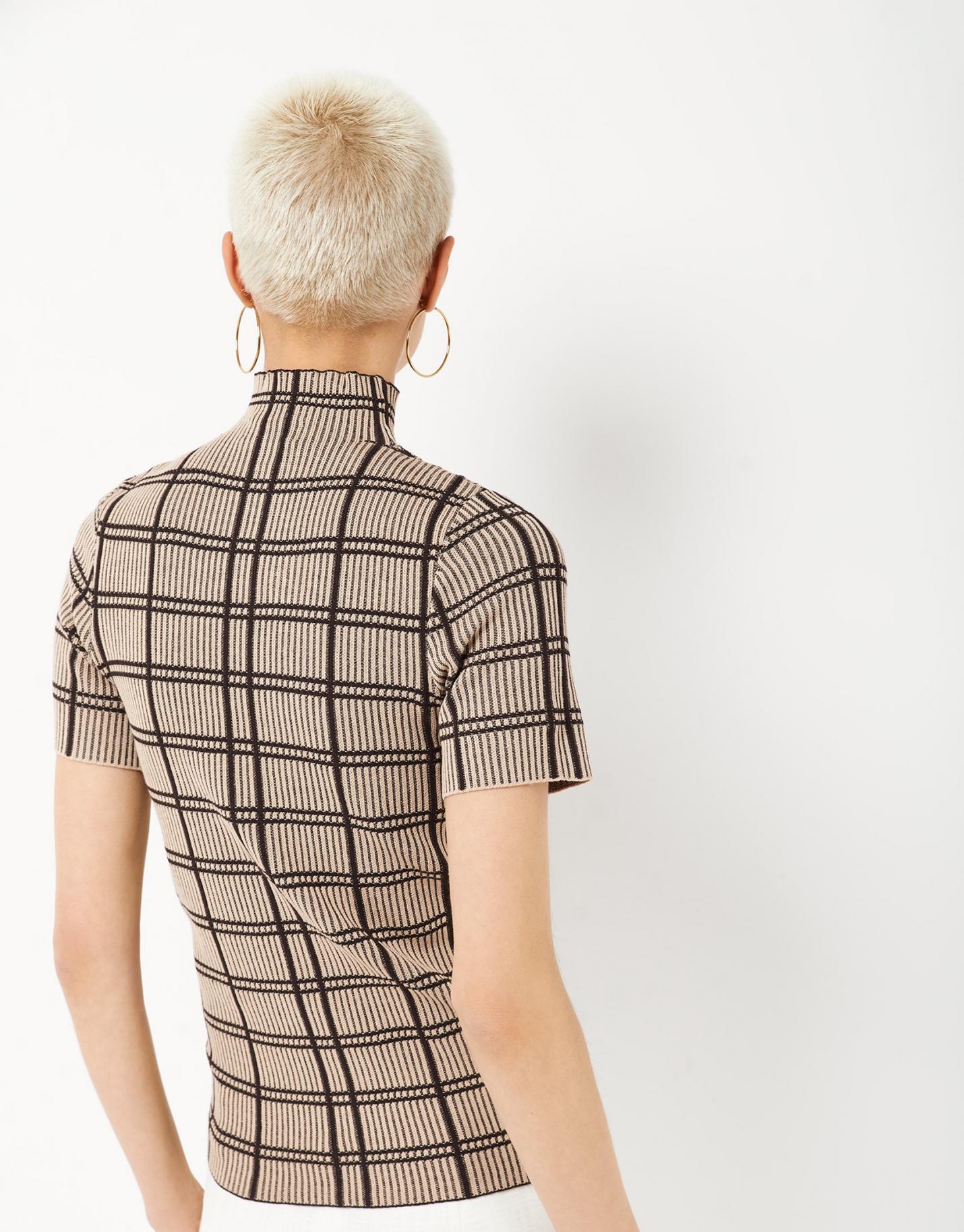 Jersey de manga corta y cuello mao confeccionado en un tejido de punto de canalé en cámel con diseño de líneas marrones en cuadrícula.