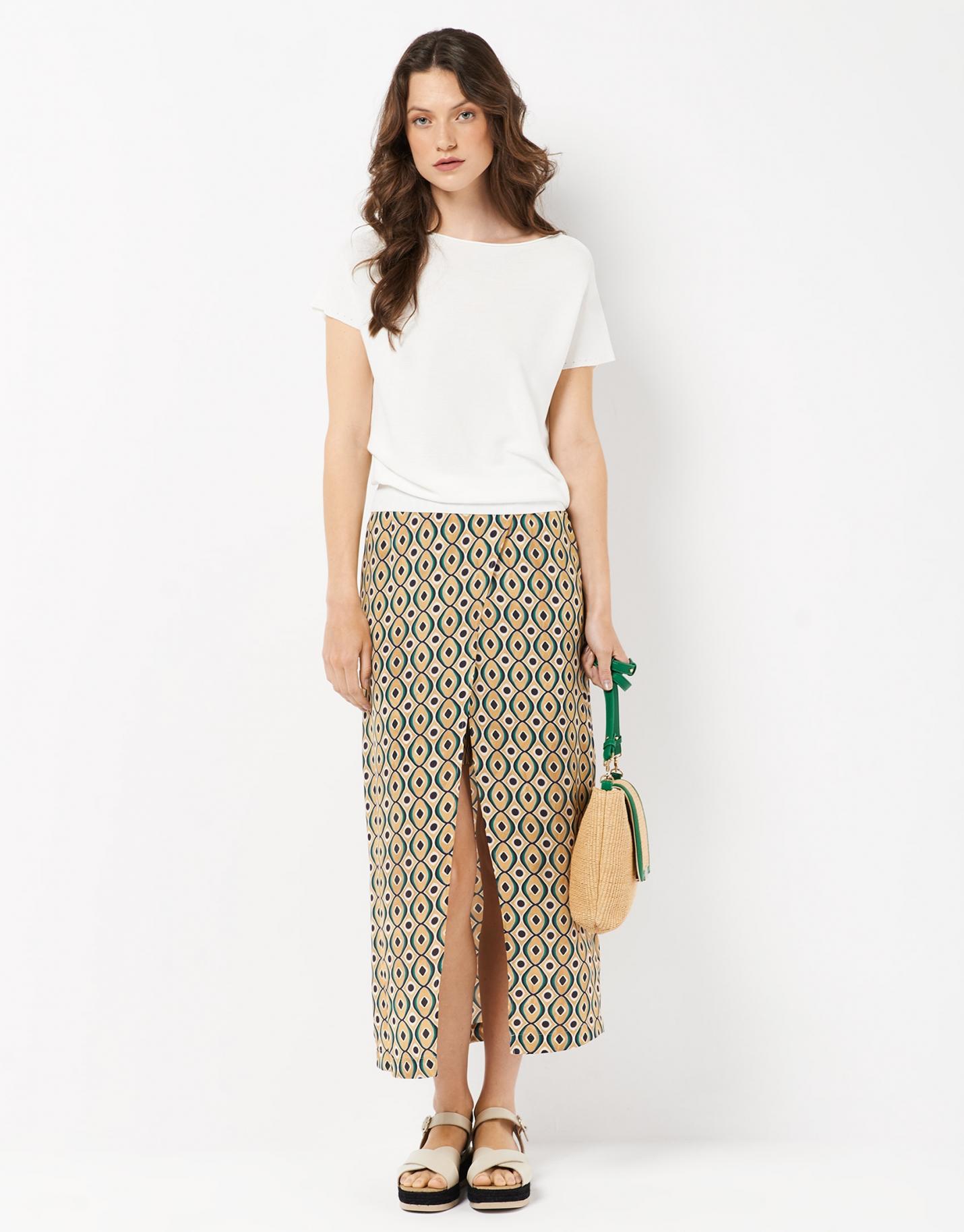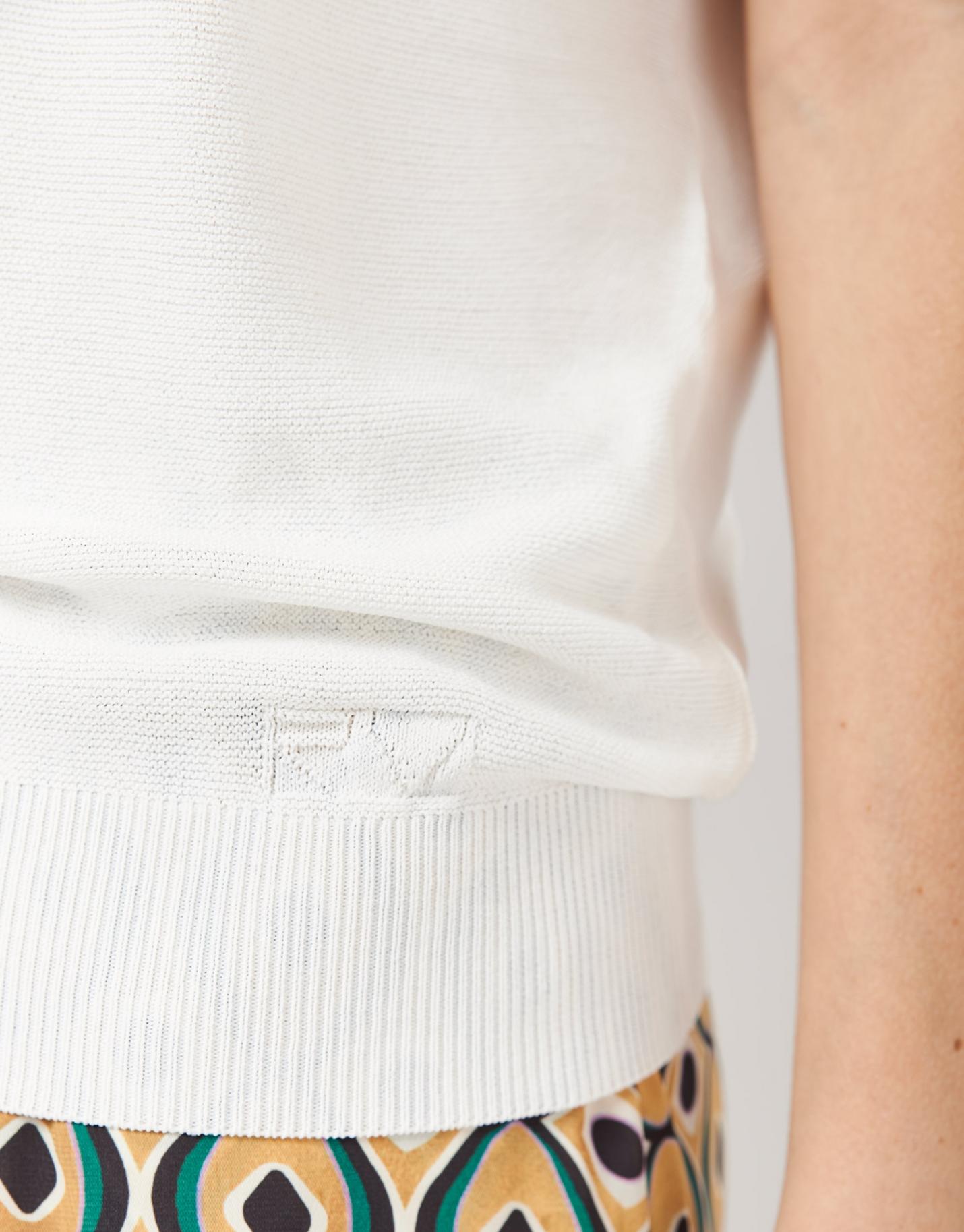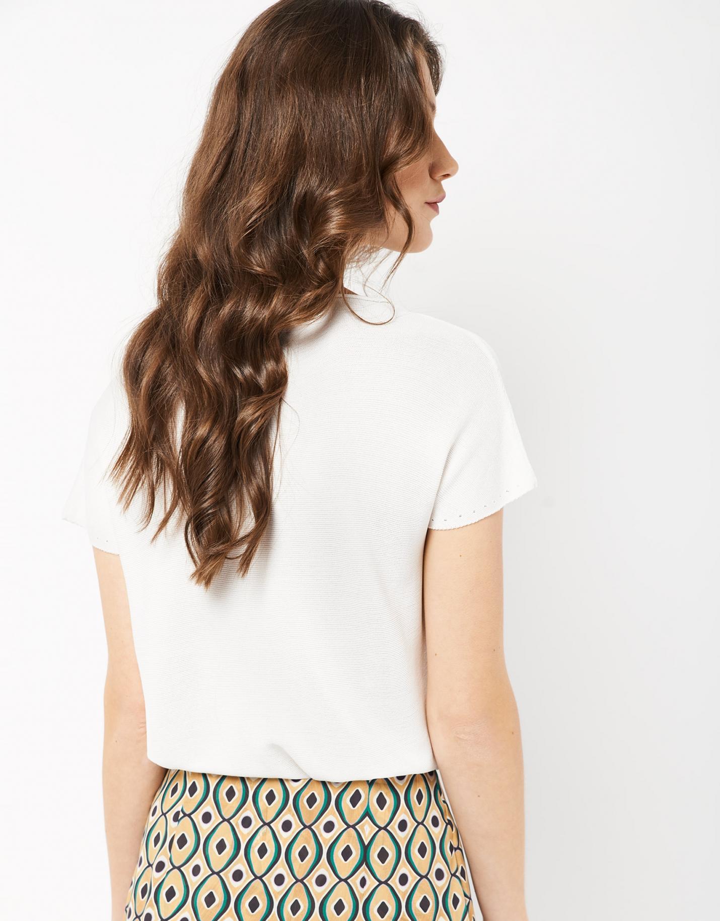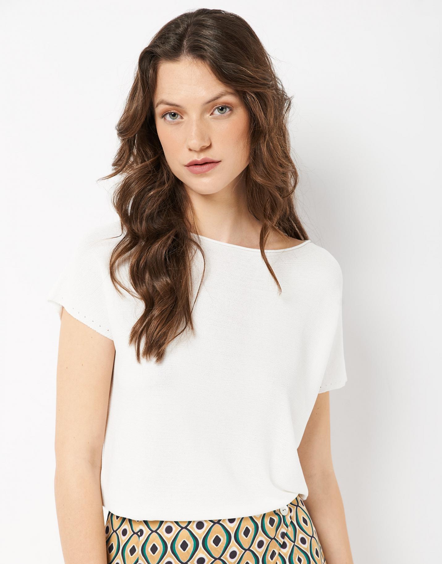 Jersey confeccionado en un punto fino color crudo. Escote barco, manga corta murciélago y canalé en bajos, manga y escote.