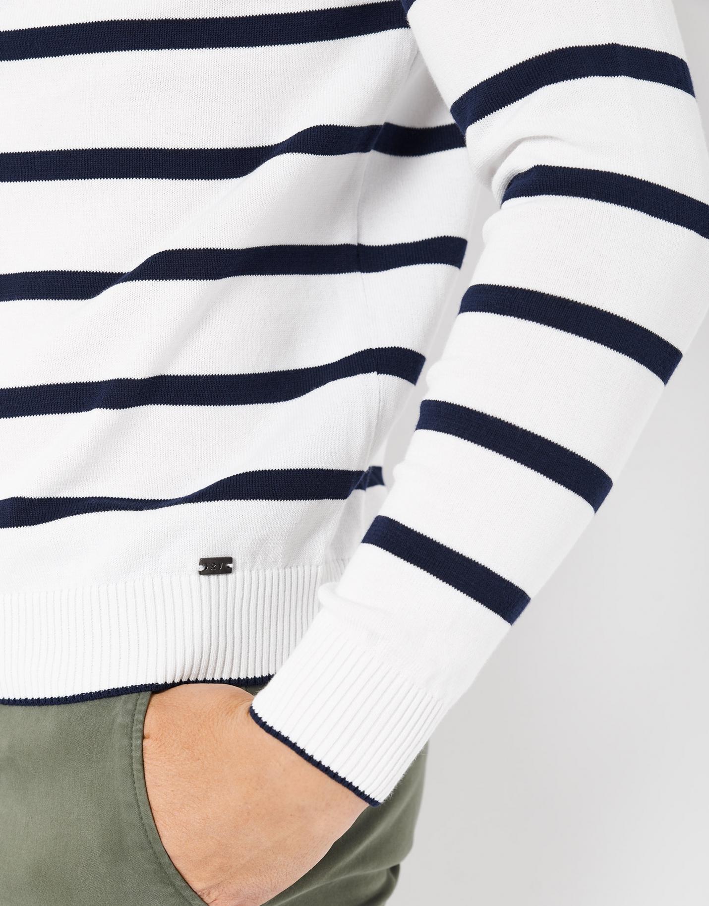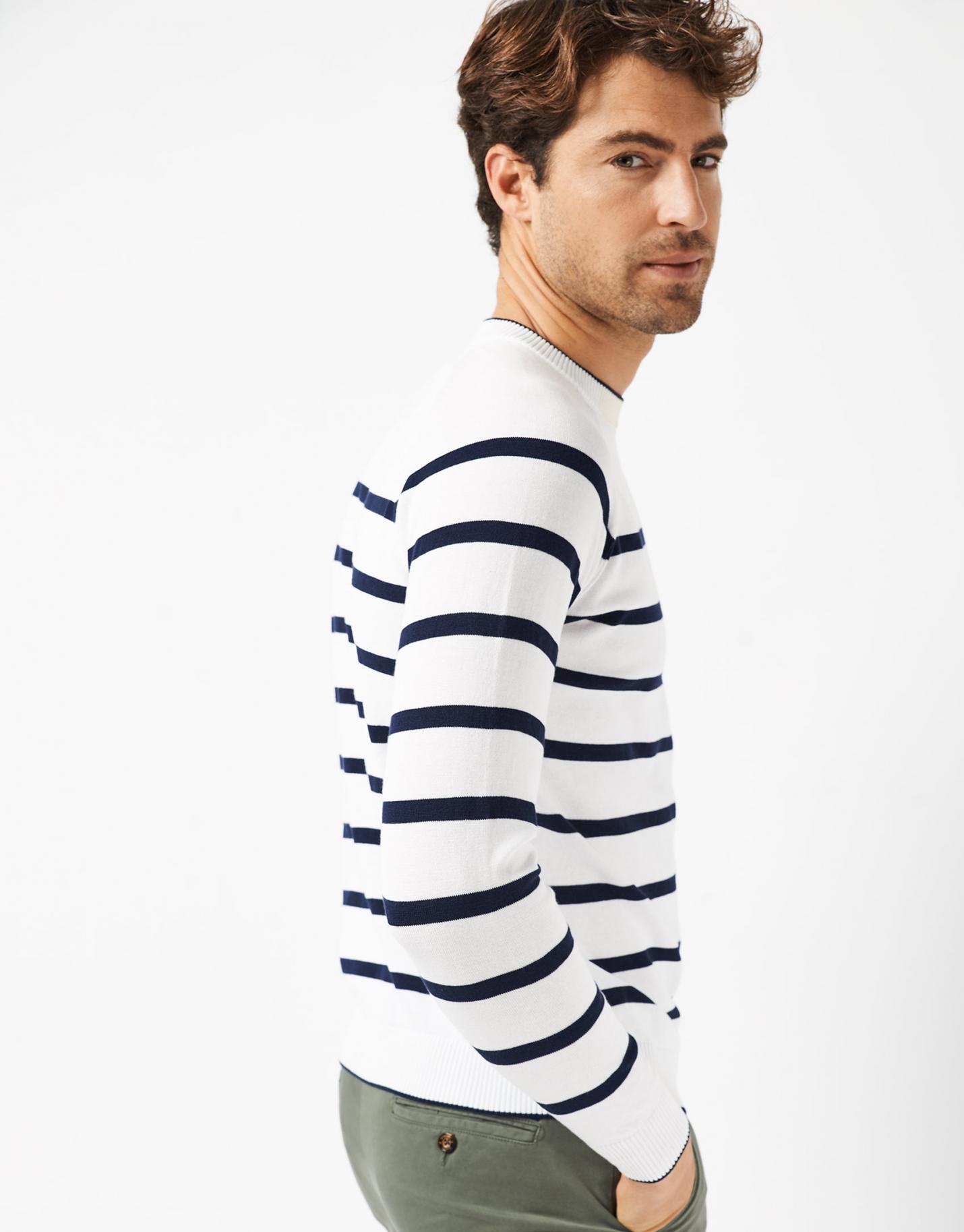 Jersey de manga larga confeccionado en un algodón high twist blanco con rayas marino. Cuello redondo, puños y bajos rematados en rib con franja azul marino.