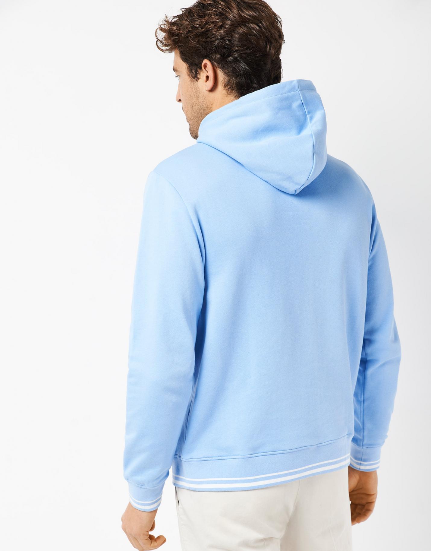 Sudadera de manga larga confeccionada en una felpa americana de algodón color celeste. Cuello con capcuha y cordones blancos para ceñir, serigrafia blanca con logo en relieve en pecho y mangas y bajos rematados con rib y listas blancas a contraste.