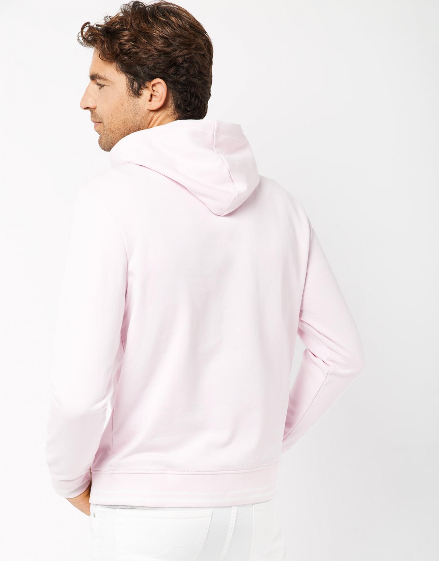 Sudadera de manga larga confeccionada en una felpa americana de algodón color rosa claro. Cuello con capcuha y cordones blancos para ceñir, serigrafia blanca con logo en relieve en pecho y mangas y bajos rematados con rib y listas blancas a contraste.