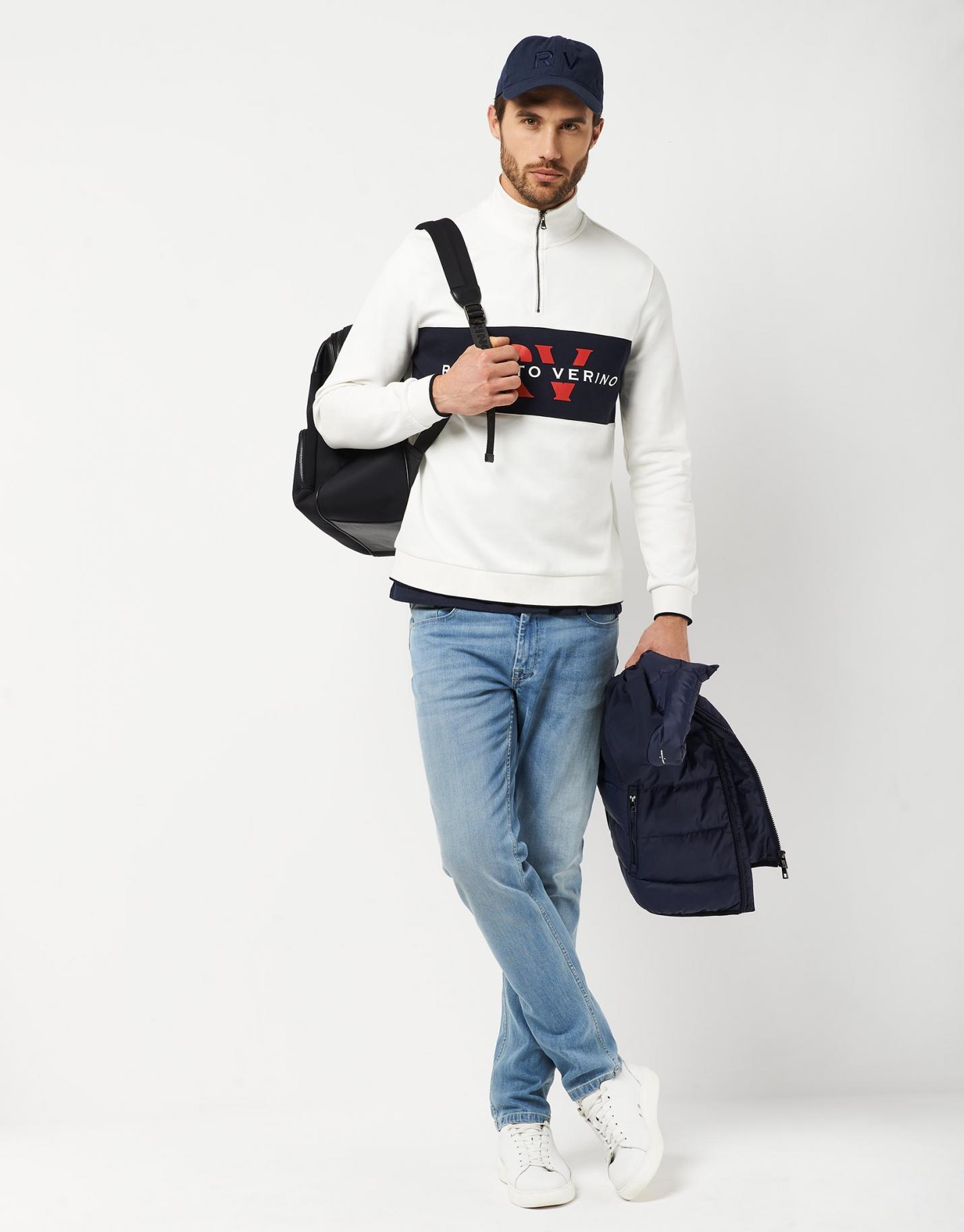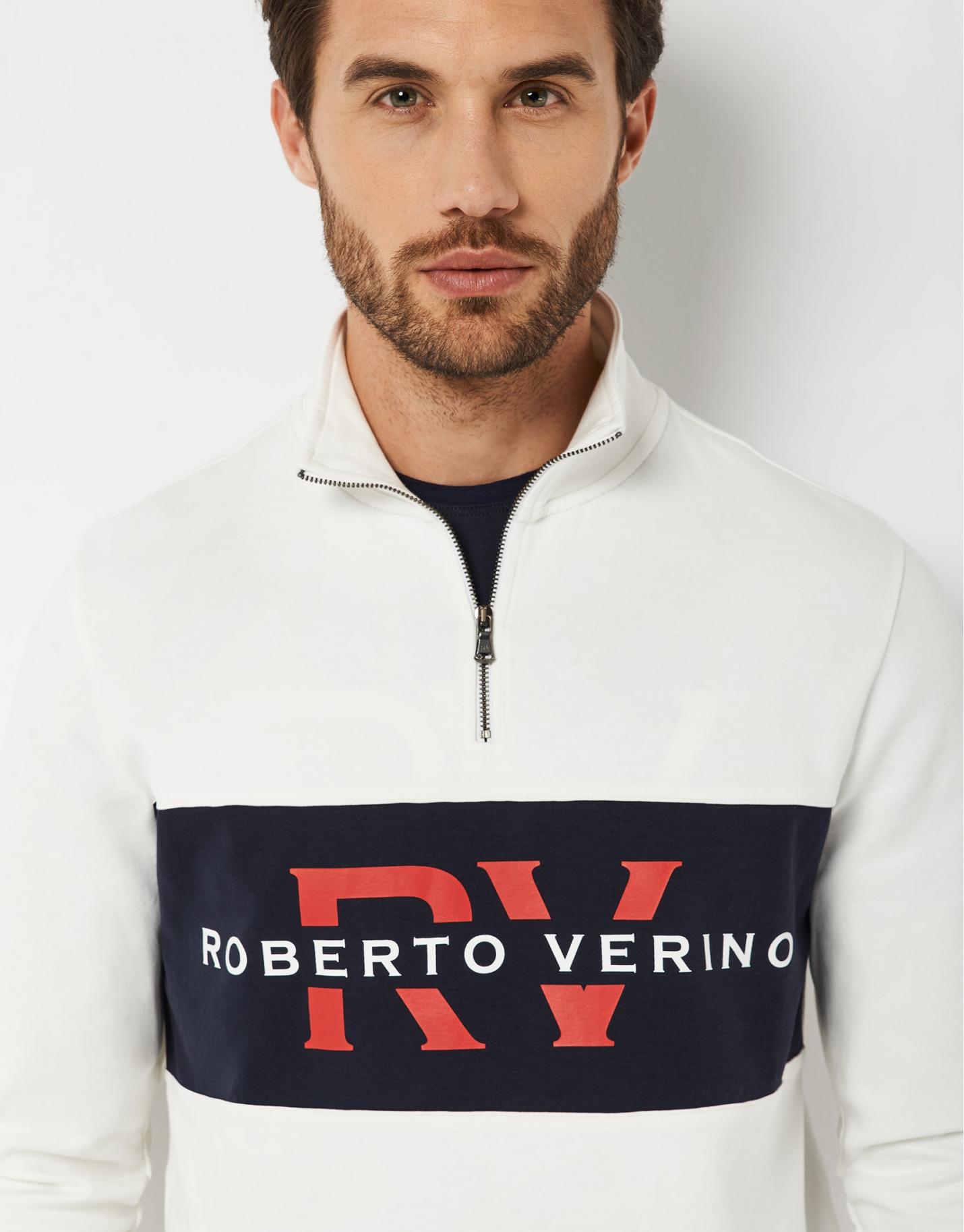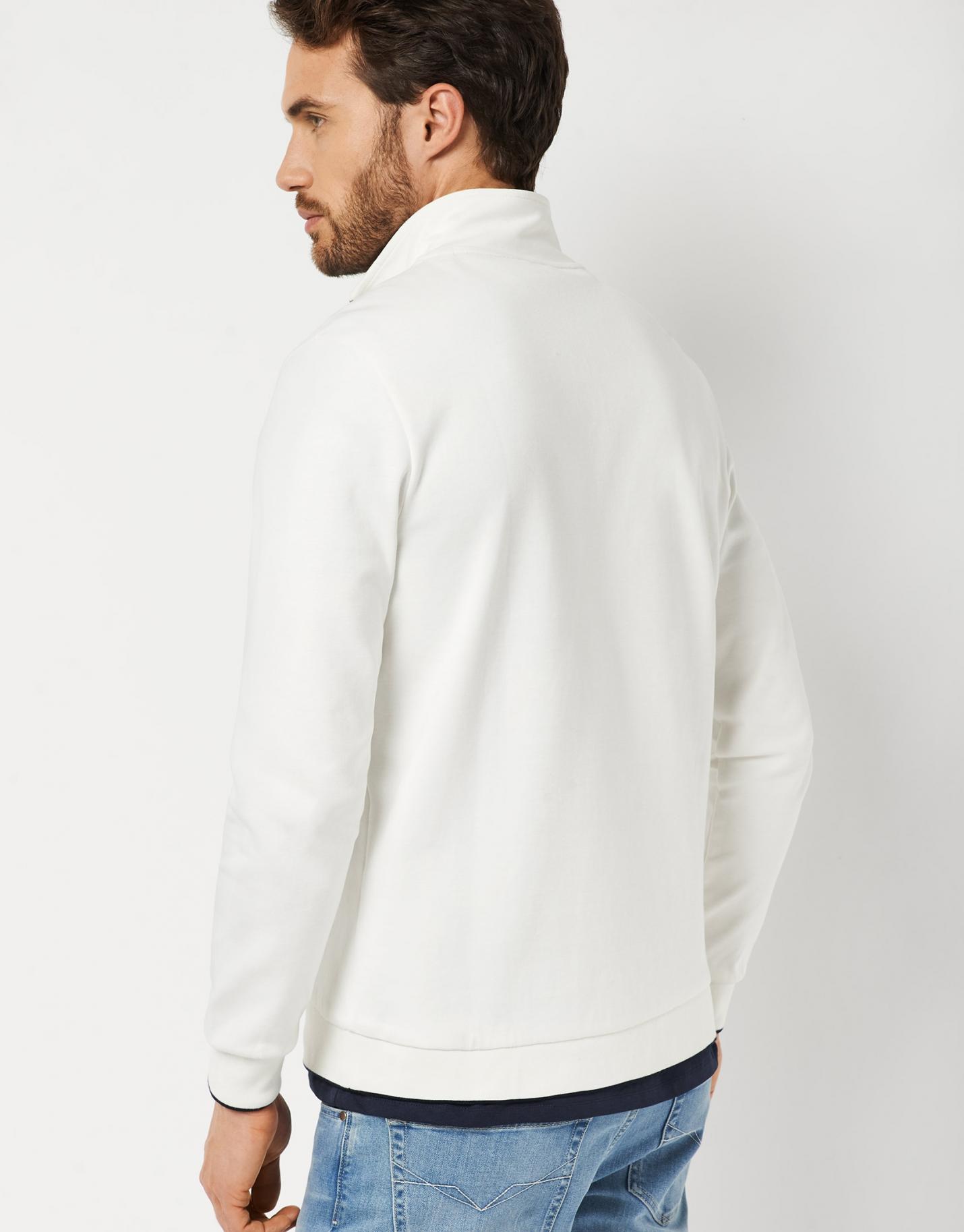 Sudadera de manga larga confeccionada en doble jersey color crudo con franja central marino y logo a contraste. Cuello con cremallera y bajos y puños de rib a tono con franja marina.
