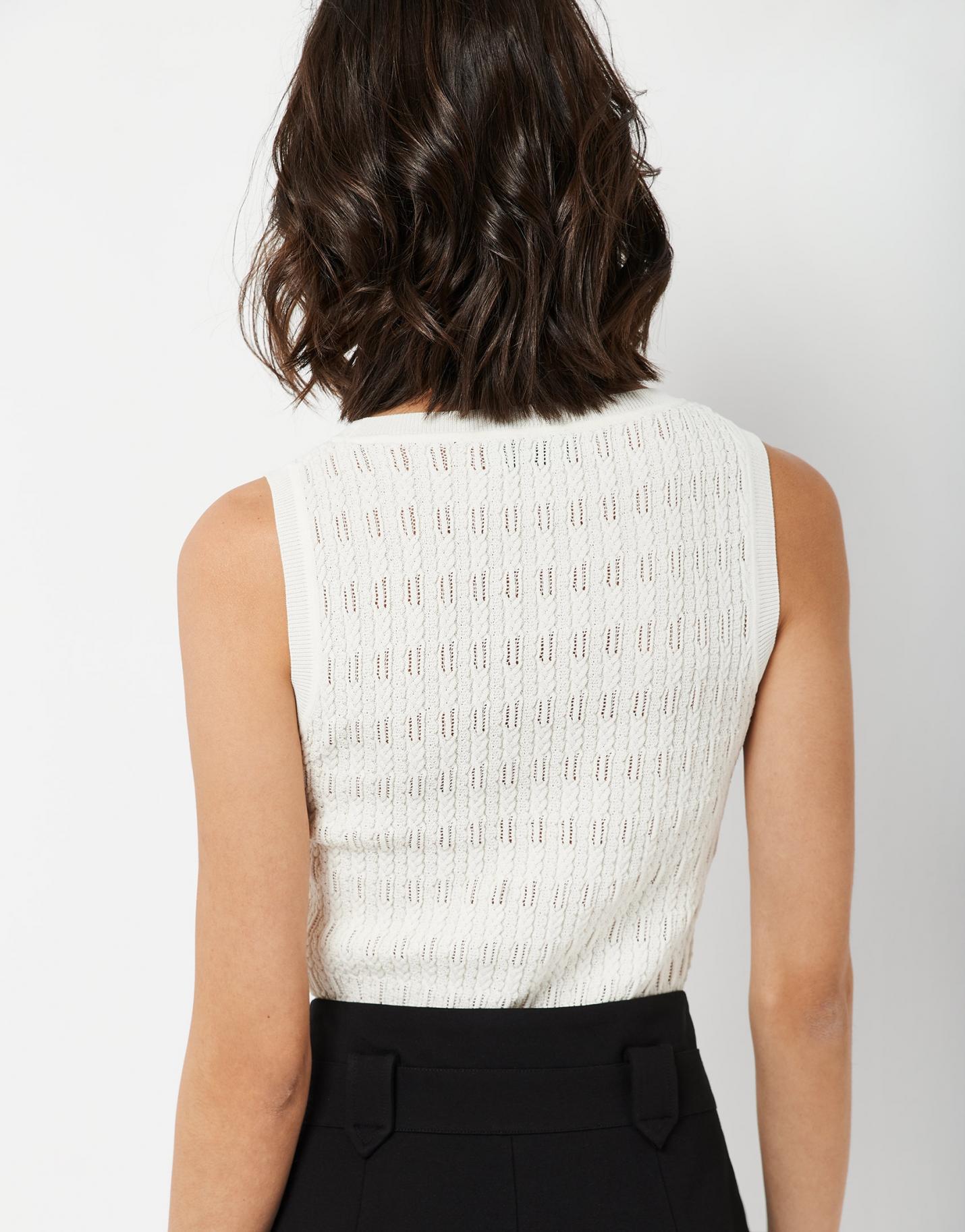 Top sin mangas confeccionado en un punto con trabajado de pequeños ochos calados en color crudo. Cuello caja y remates en canalé.