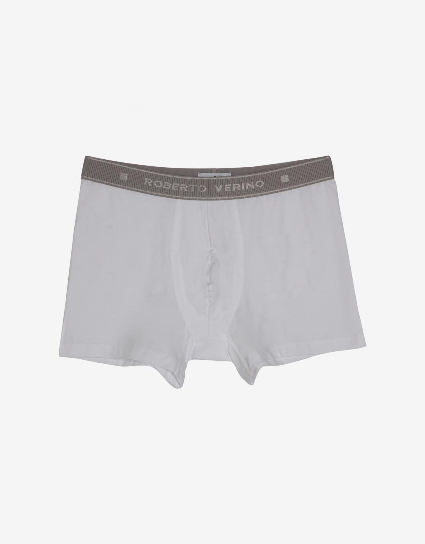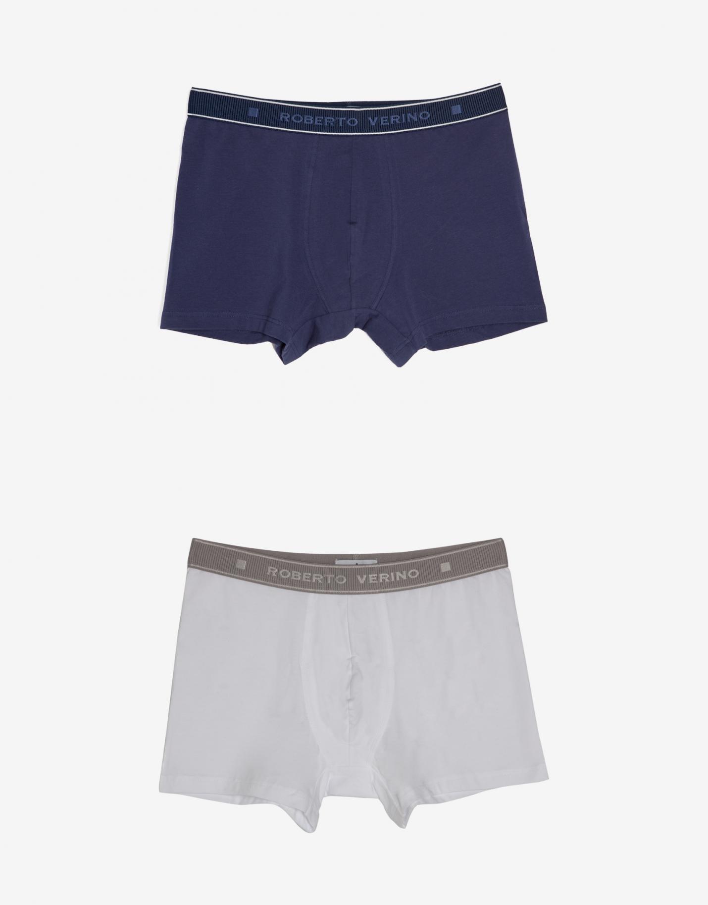 Pack de dos bóxers confeccionados en un algodón ligeramente elástico con cintura personalizada. Un bóxer azul tinta y el otro blanco. Presentación en caja.