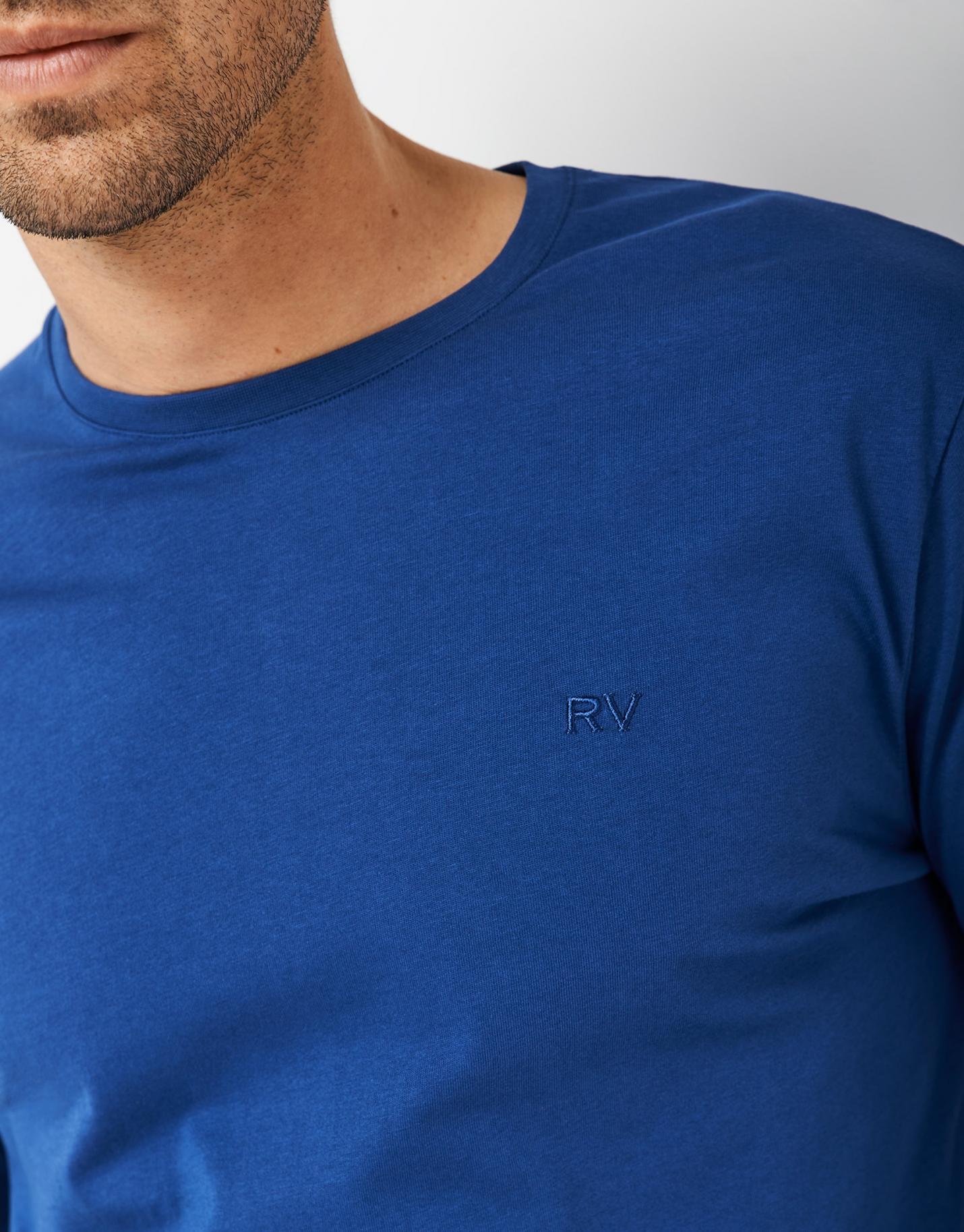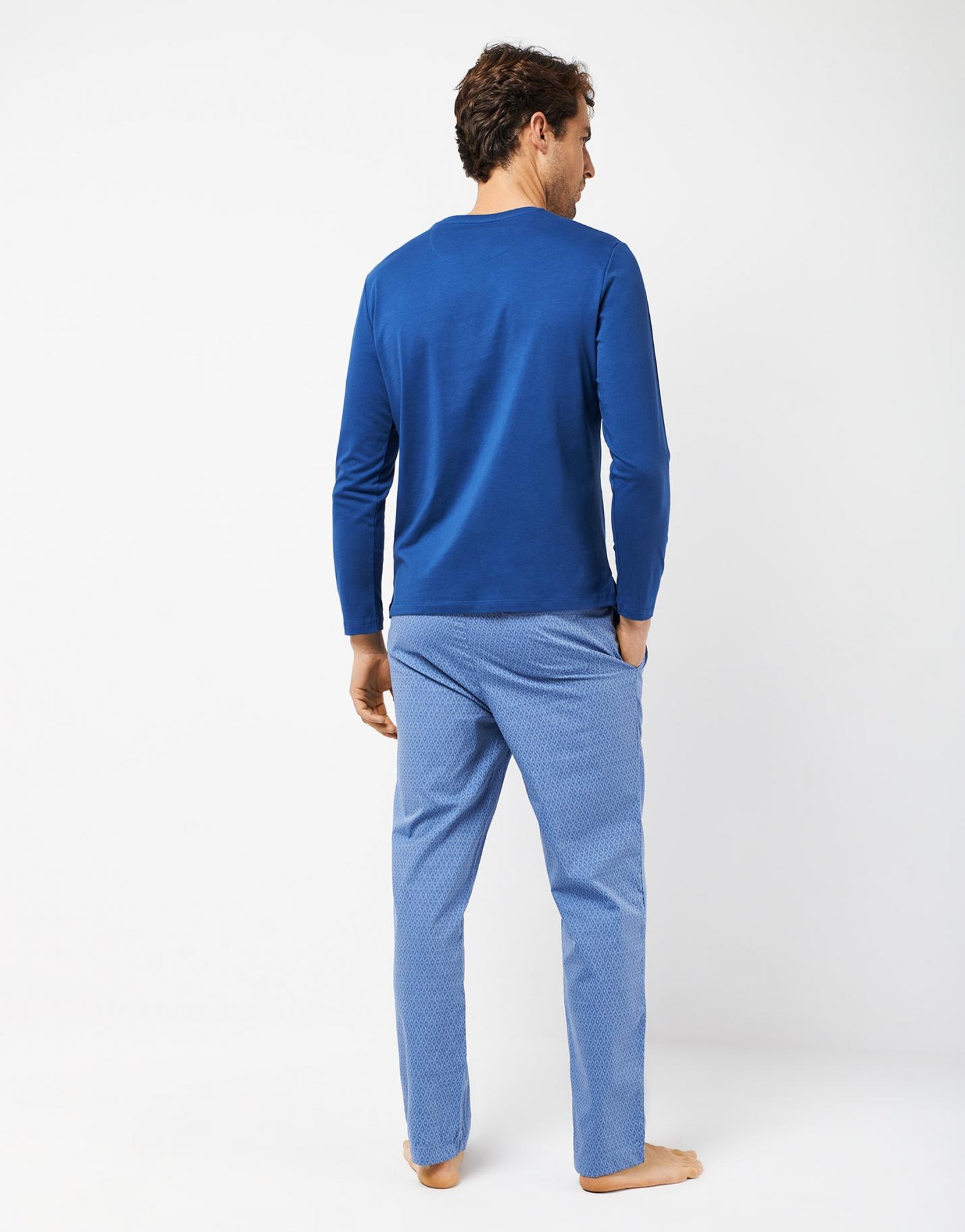 Conjunto de pijama confeccionado en algodón azul medio. Camiseta de manga larga lisa azul con bordado en pecho y pantalón largo en jacquard azul. Presentación en caja.