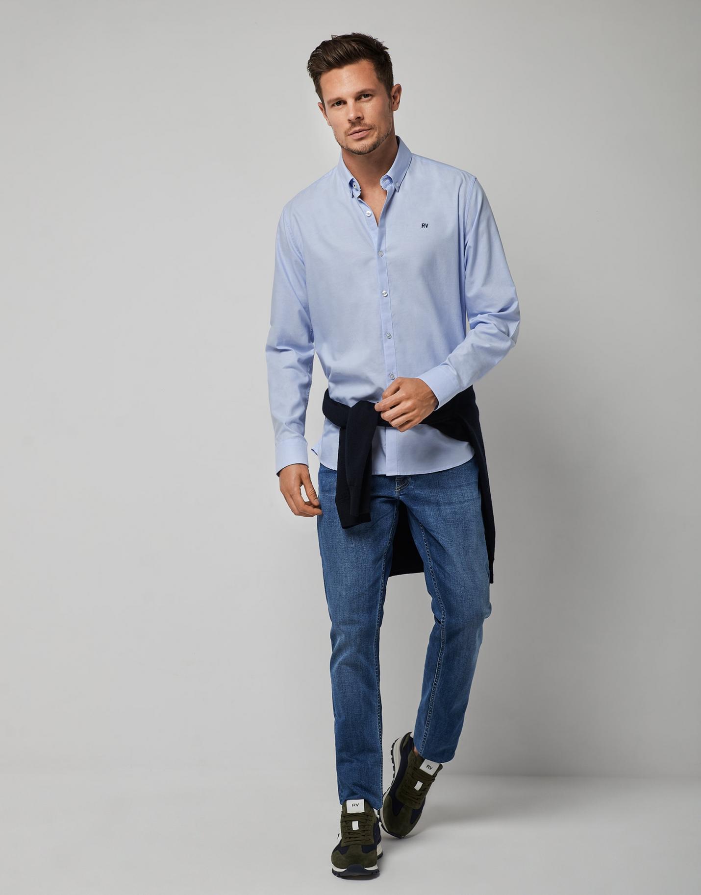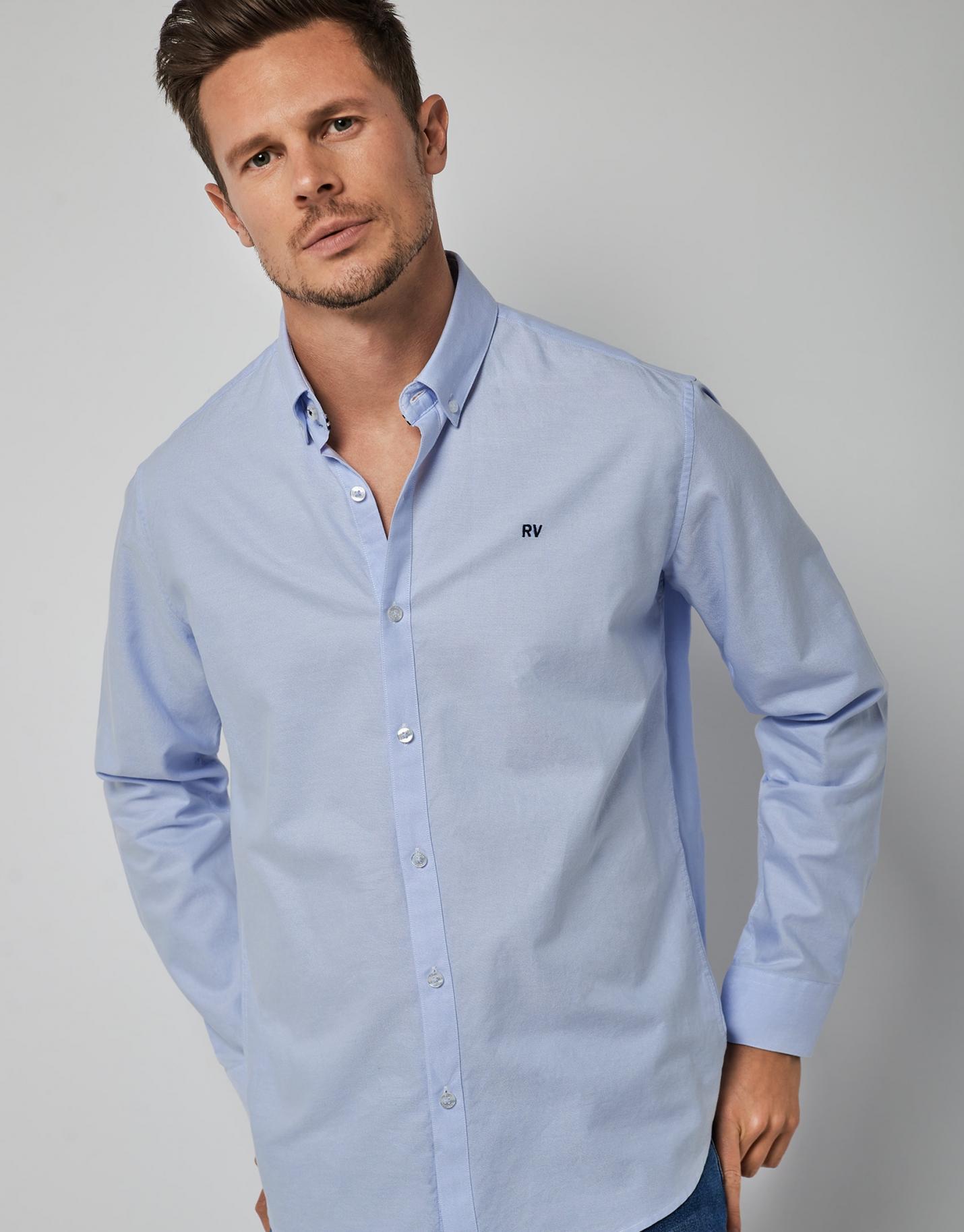 Camisa sport en Oxford de algodón color celeste con cinta color marino en el interior del cuello. Corte regular fit, cuello pico con botón y bordado RV.