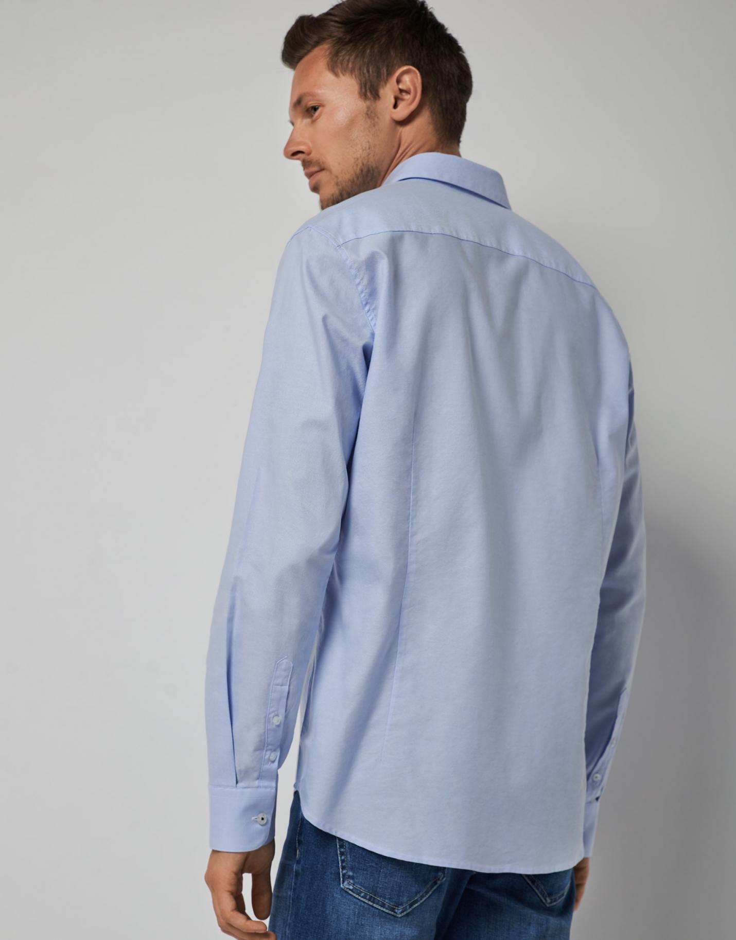 Camisa sport en Oxford de algodón color celeste con cinta color marino en el interior del cuello. Corte regular fit, cuello…