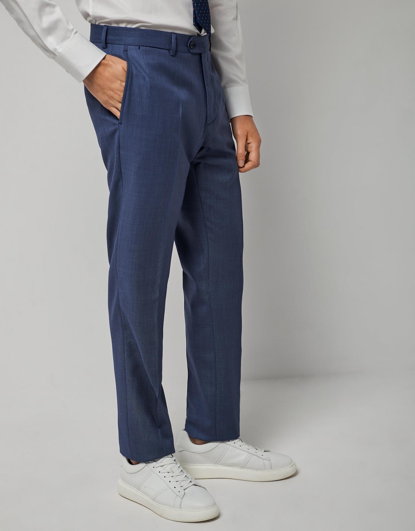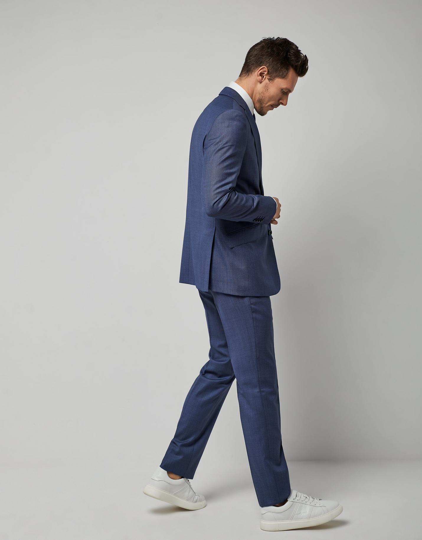 Traje half canvas slim fit en ojo de perdiz de lana en color azul medio. Pantalones de corte clásico y americana con dos bolsillos de tapeta y uno insertado en pecho. Cierre con dos botones y doble abertura en espalda.