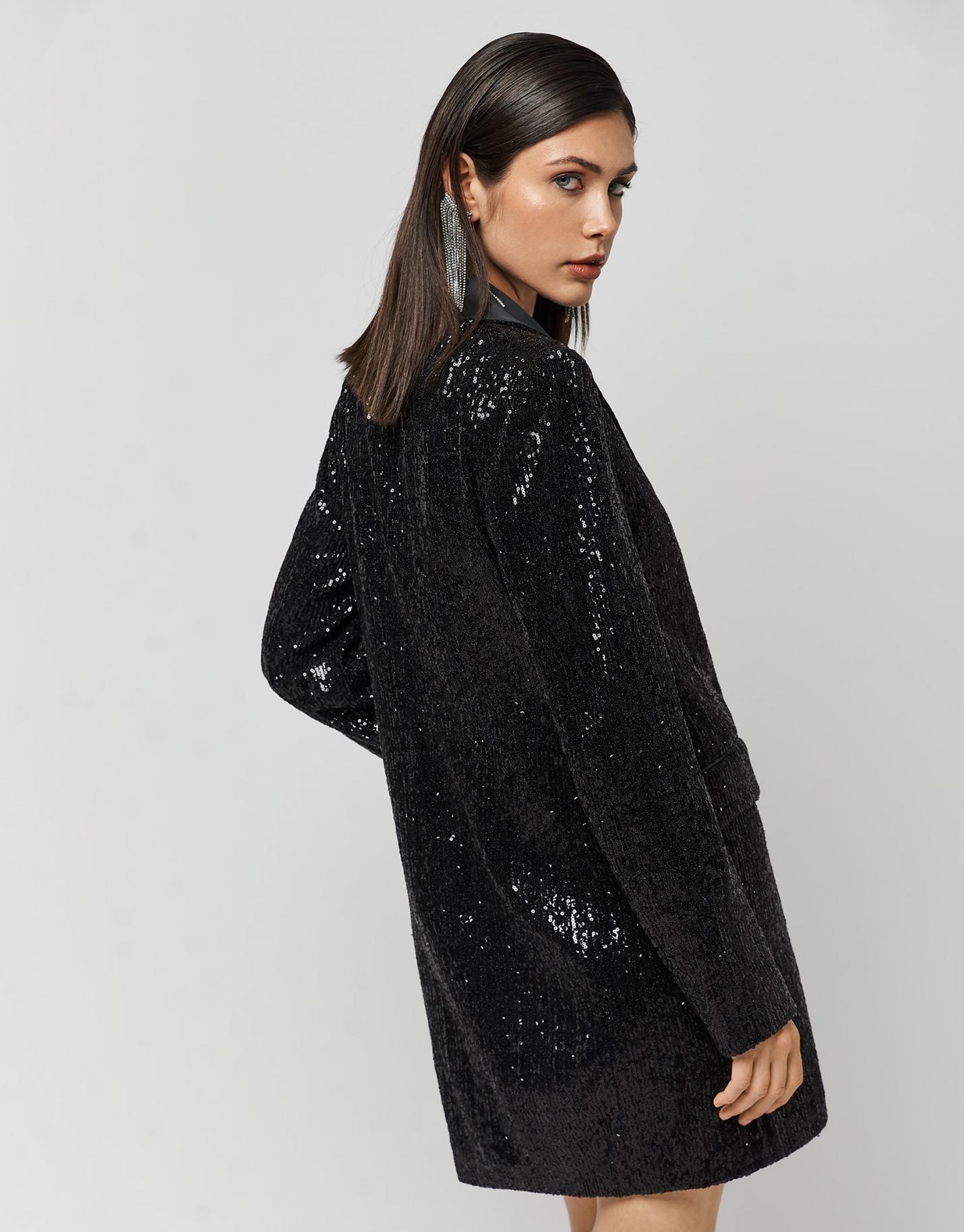 Blazer larga en un tejido fantasía de lentejuelas en color negro y solapas tipo smoking en satén negro. Cierre cruzado con doble abotonadura, escote solapa y dos bolsillos de solapa en delantero y uno insertado en pecho.