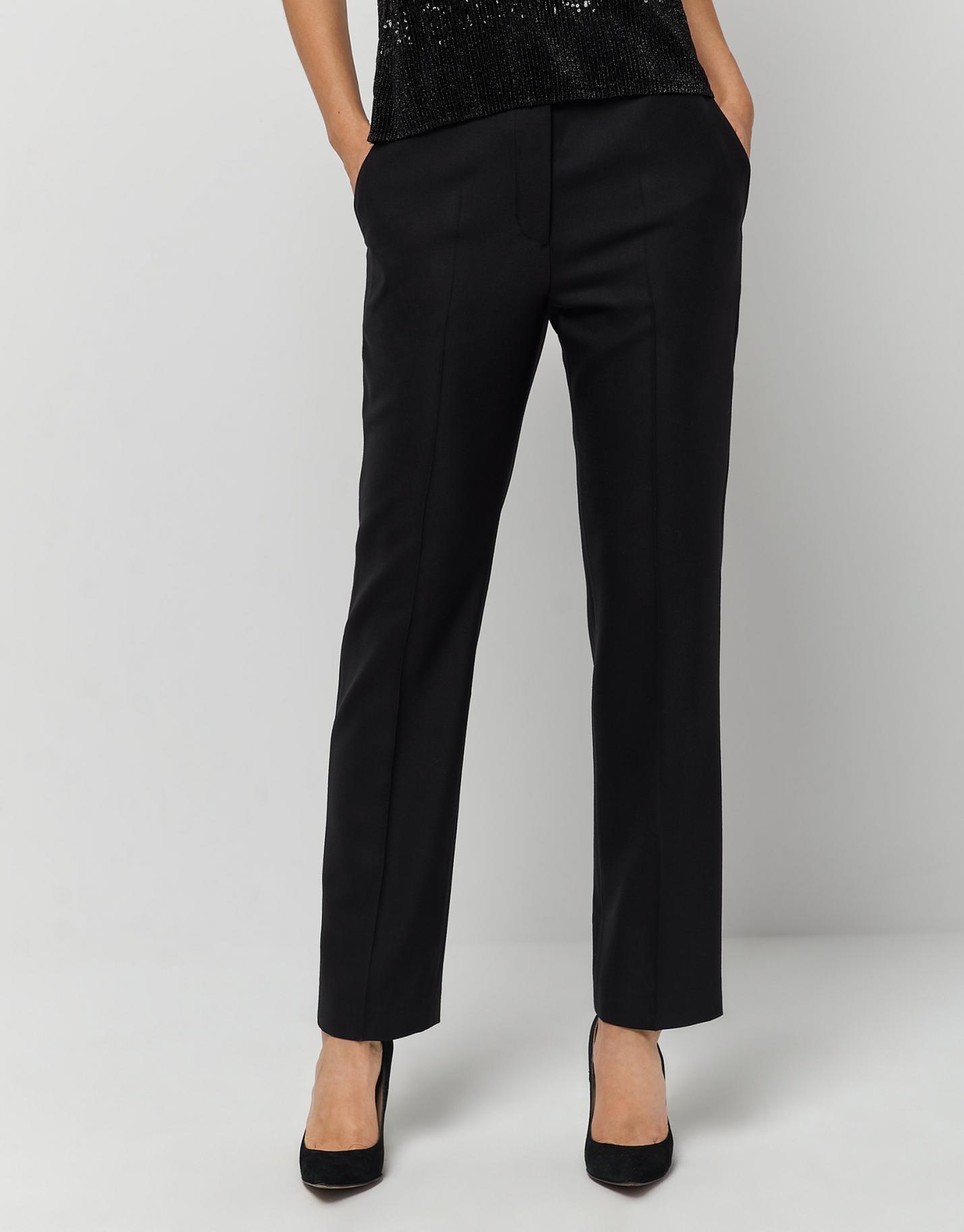 Pantalón sastre de corte recto en lana fría color negro. Cinturilla con traspaso y trabillas, cierre con cremallera oculta y dos bolsillos laterales en delantero.