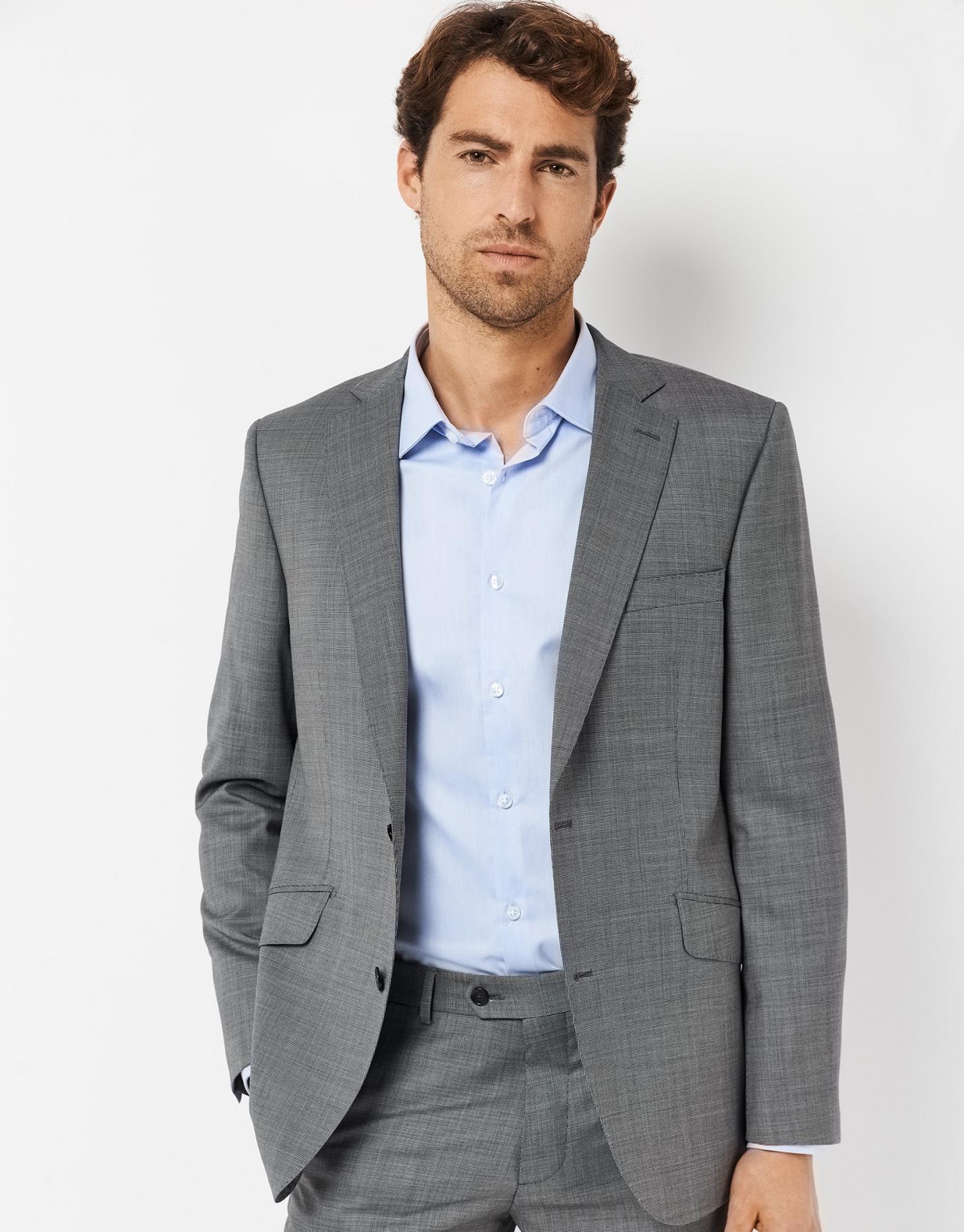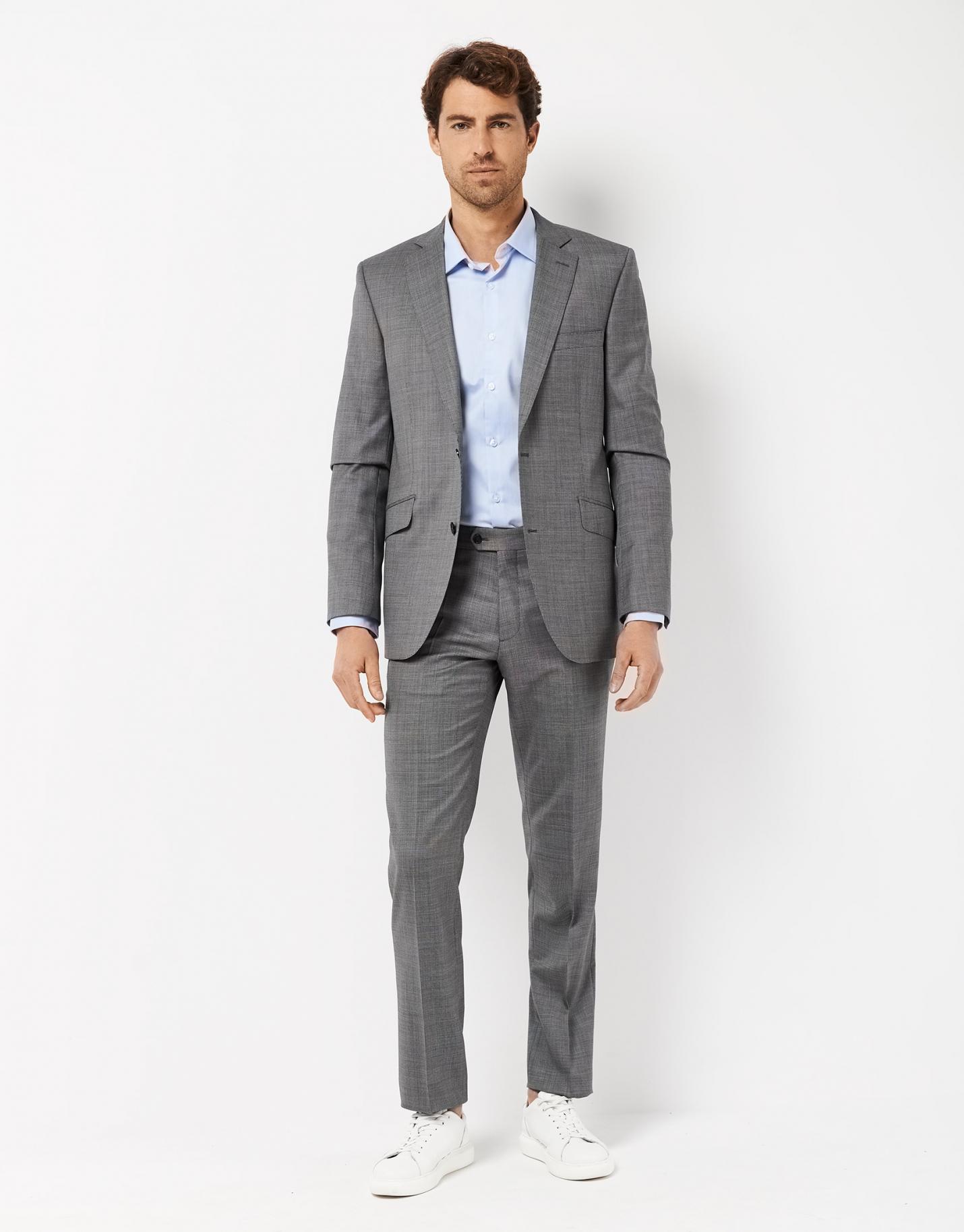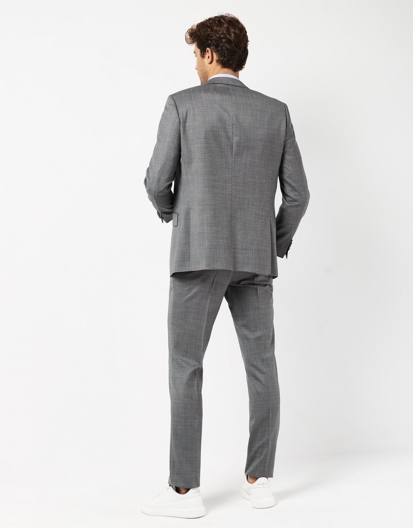 Traje half canvas regular fit confeccionado en una lana con microestructrura bicolor negro y beige. Pantalones de corte clásico y americana con dos bolsillos de tapeta y uno insertado en pecho. Cierre con dos botones y doble abertura en espalda. Corte slim fit