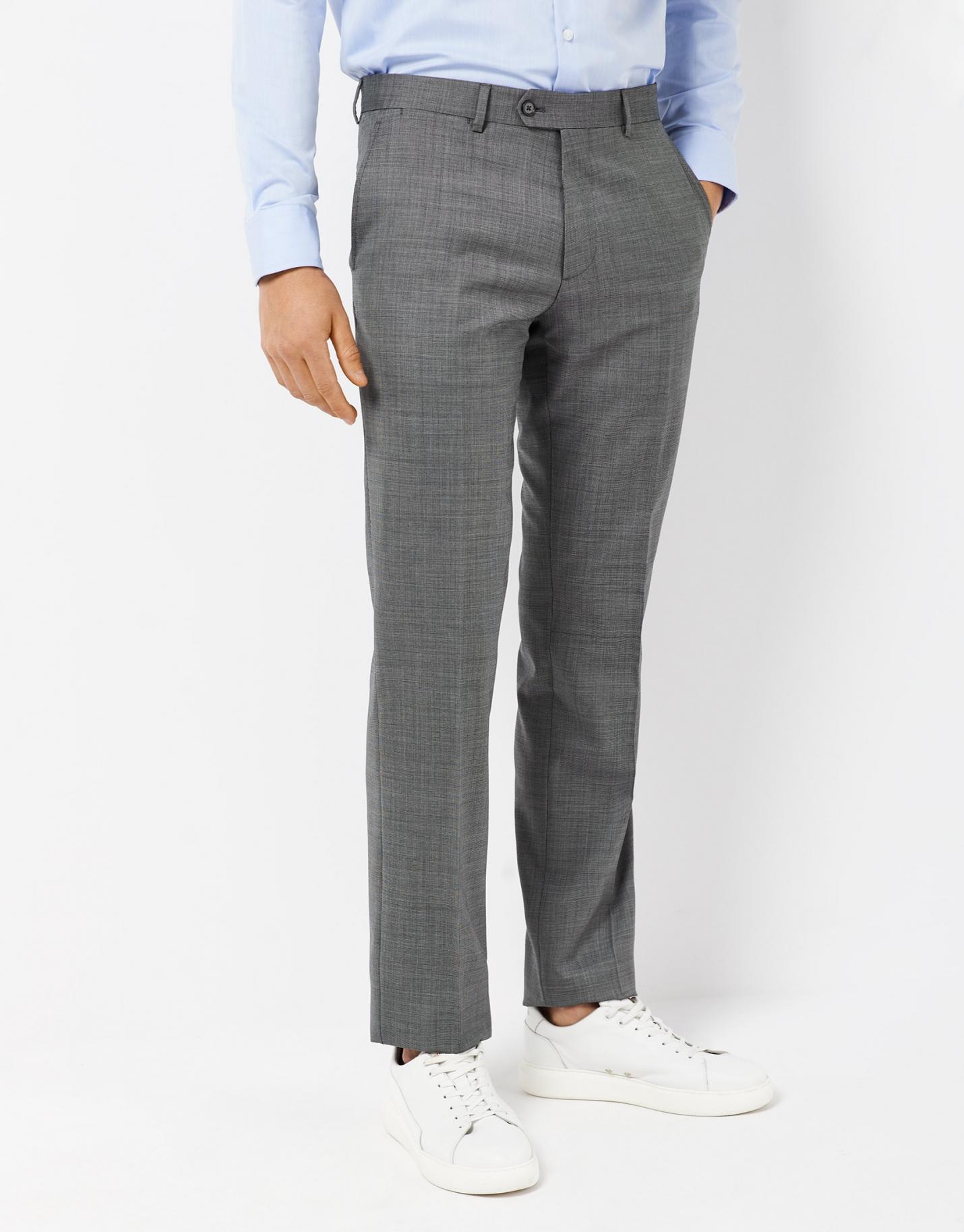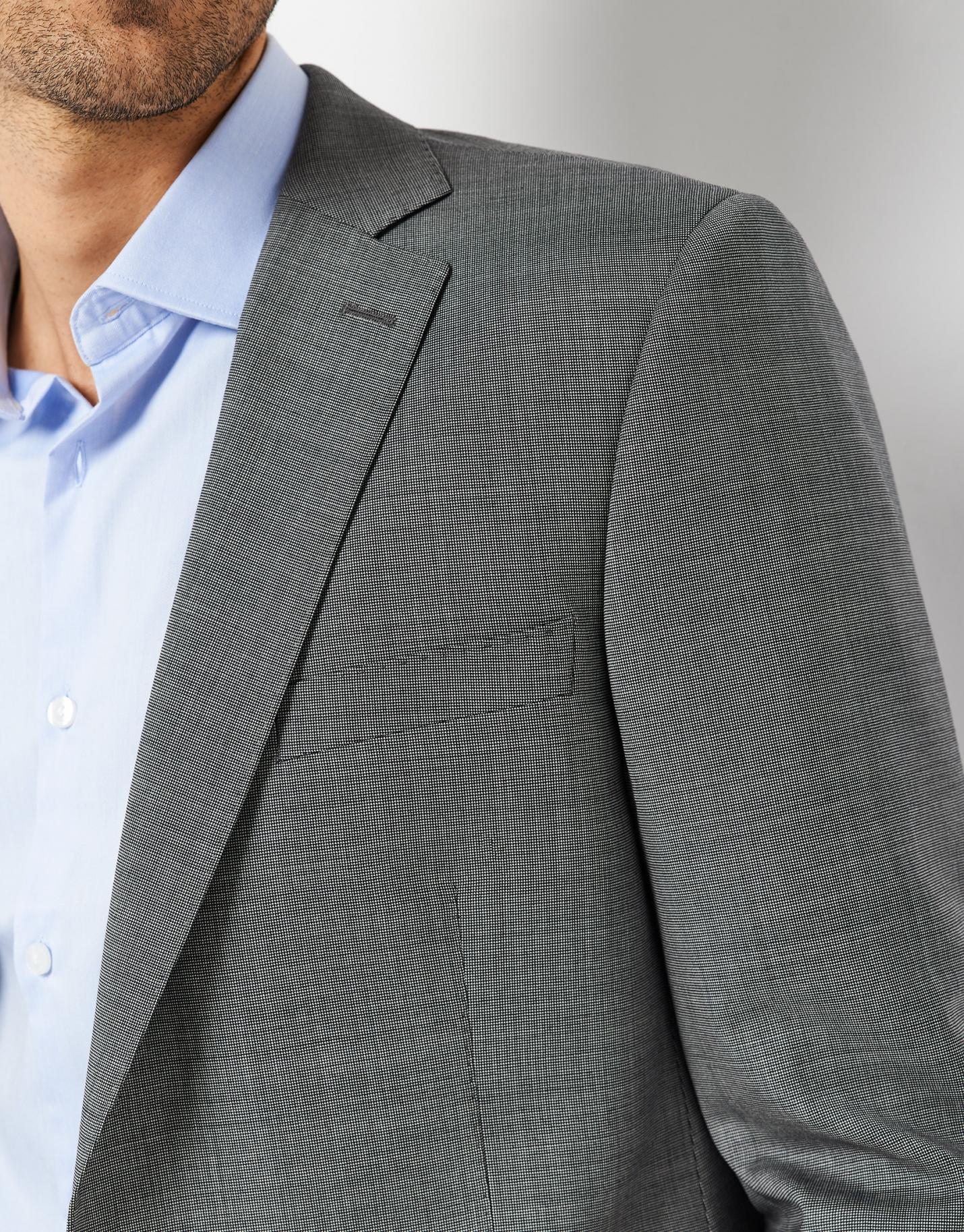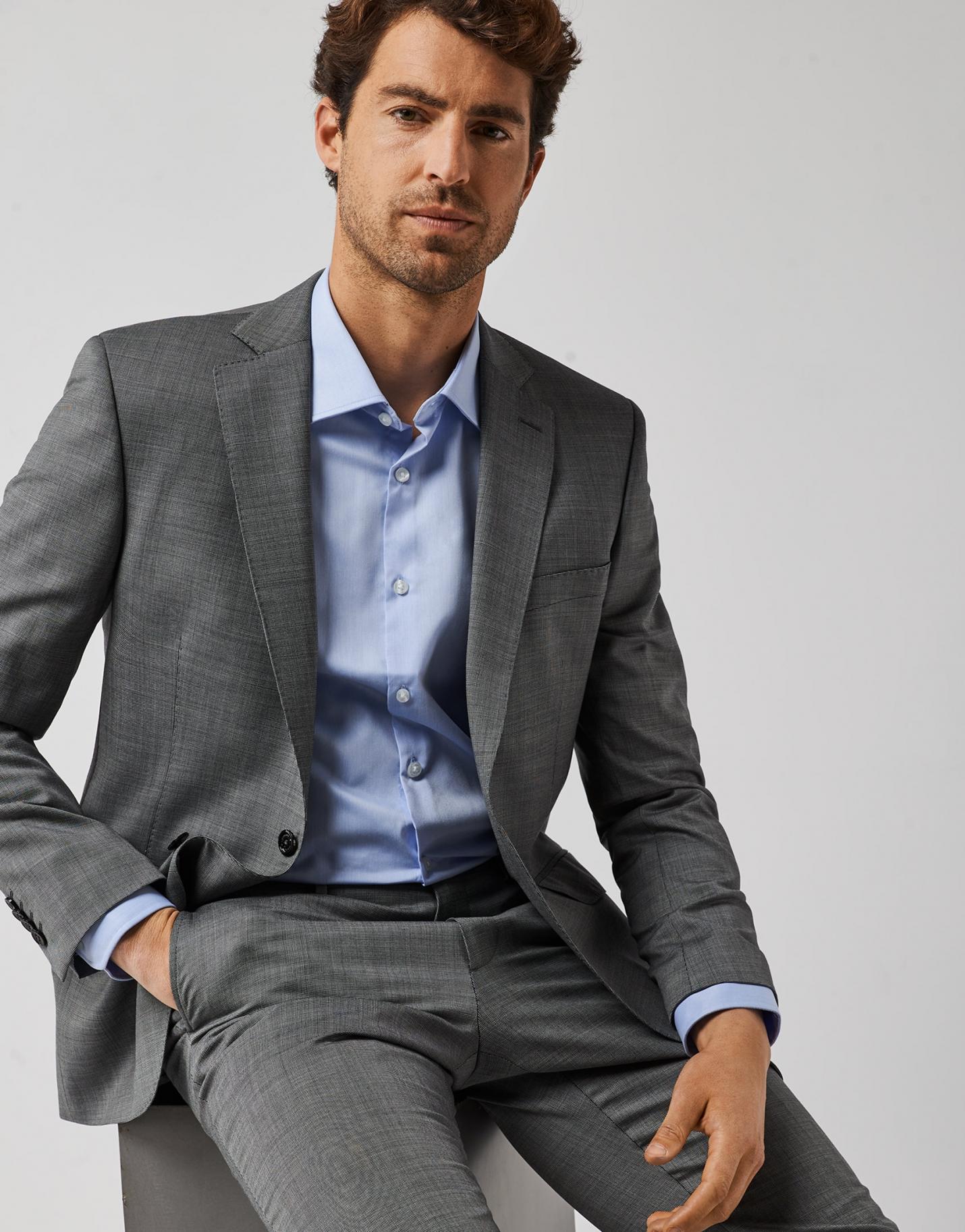 Traje half canvas regular fit confeccionado en una lana con microestructrura bicolor negro y beige. Pantalones de corte clásico y americana con dos bolsillos de tapeta y uno insertado en pecho. Cierre con dos botones y doble abertura en espalda. Corte slim fit