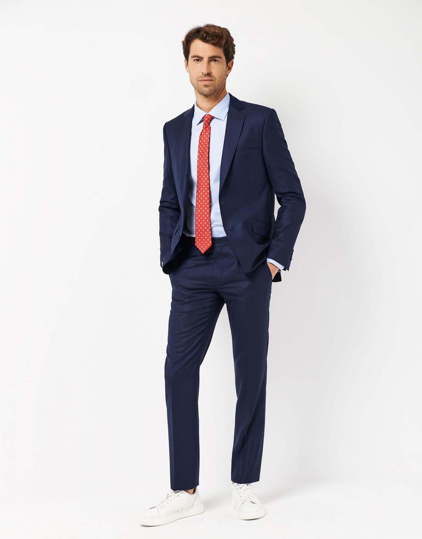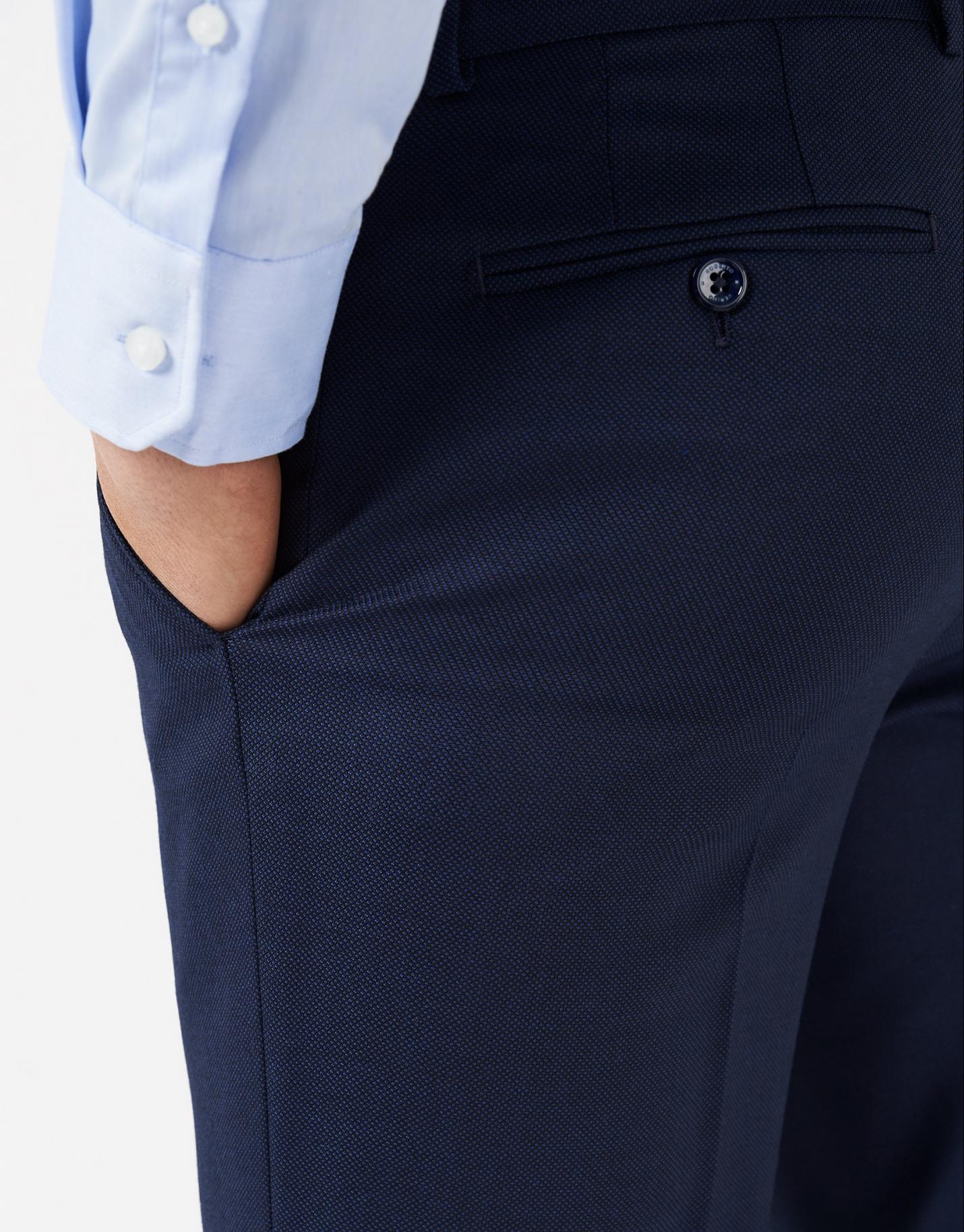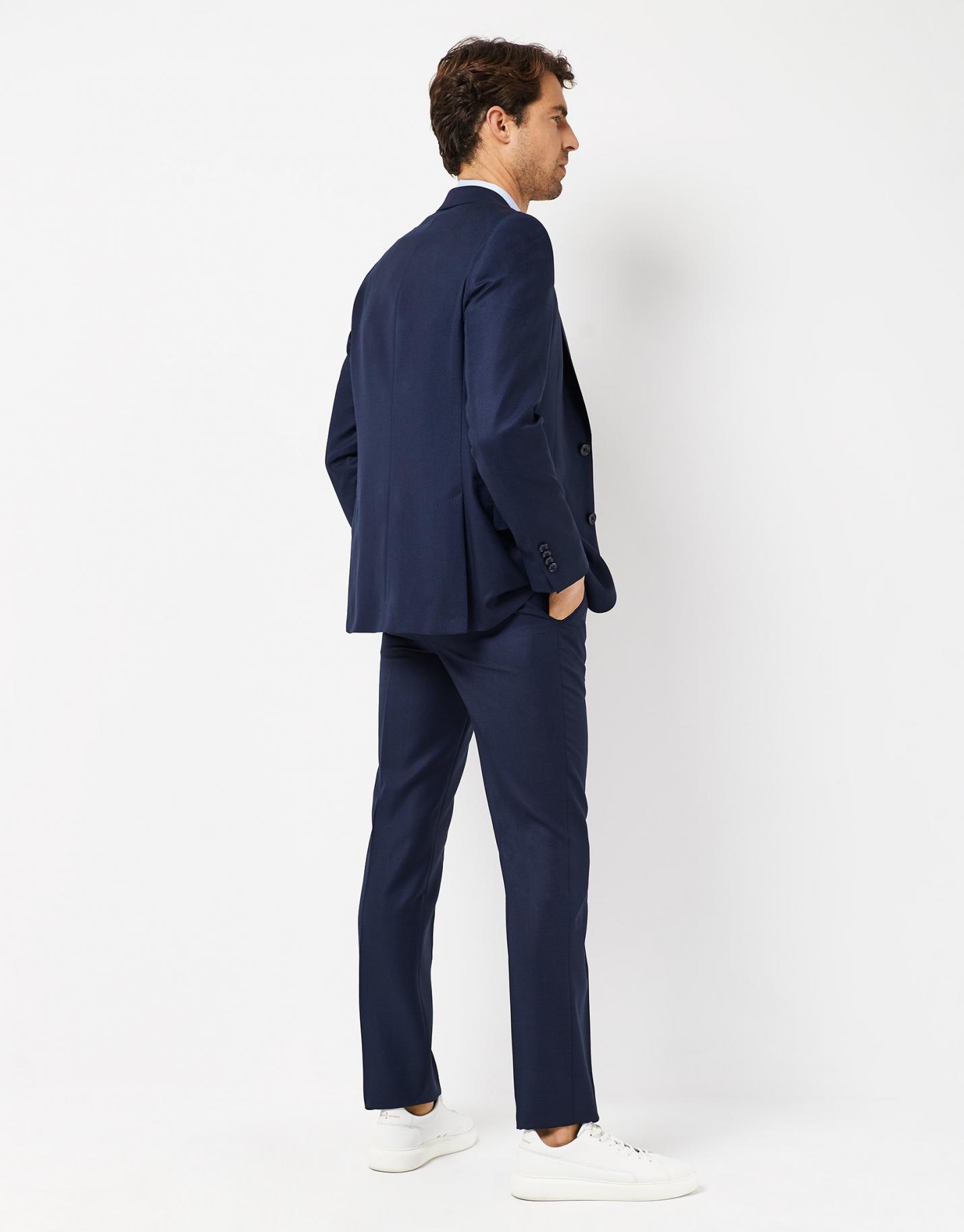 Traje half canvas regular fit confeccionado en una lana con estructrura de panal en color azul marino. Pantalones de corte clásico y americana con dos bolsillos de tapeta y uno insertado en pecho. Cierre con dos botones y doble abertura en espalda. Corte slim fit
