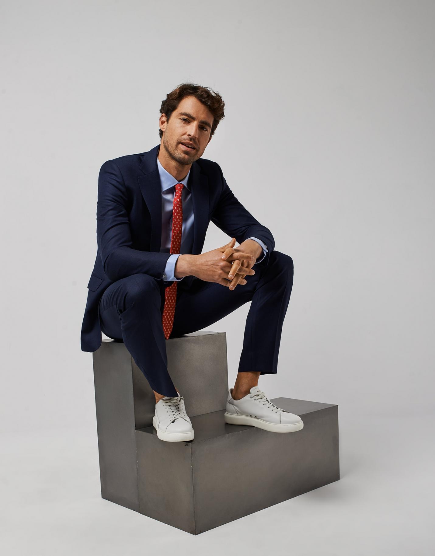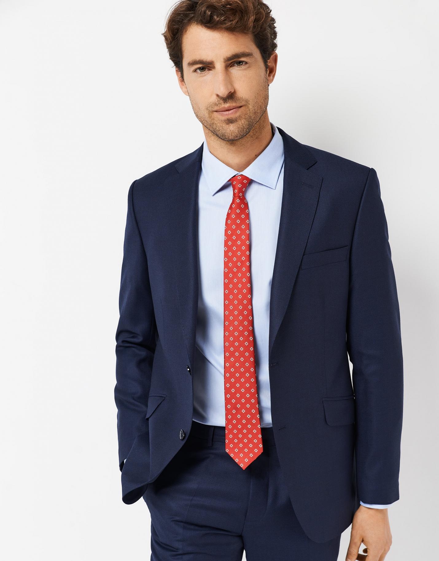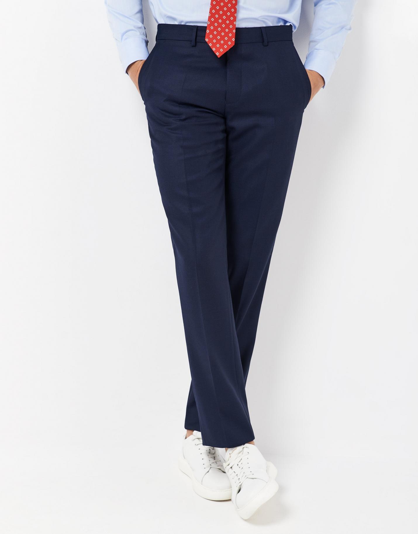 Traje half canvas regular fit confeccionado en una lana con estructrura de panal en color azul marino. Pantalones de corte clásico y americana con dos bolsillos de tapeta y uno insertado en pecho. Cierre con dos botones y doble abertura en espalda. Corte slim fit