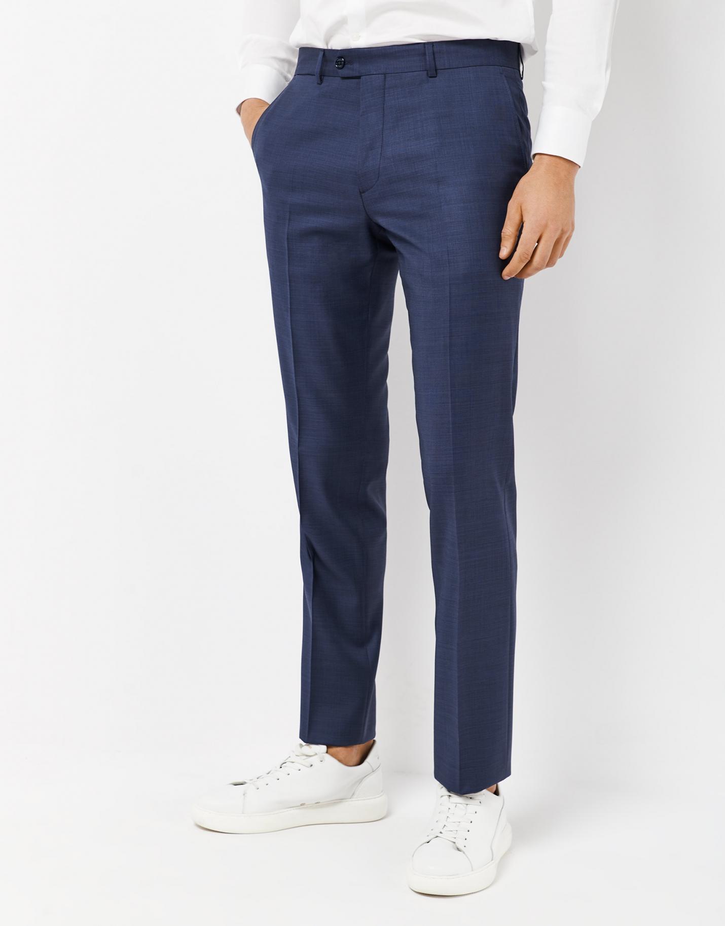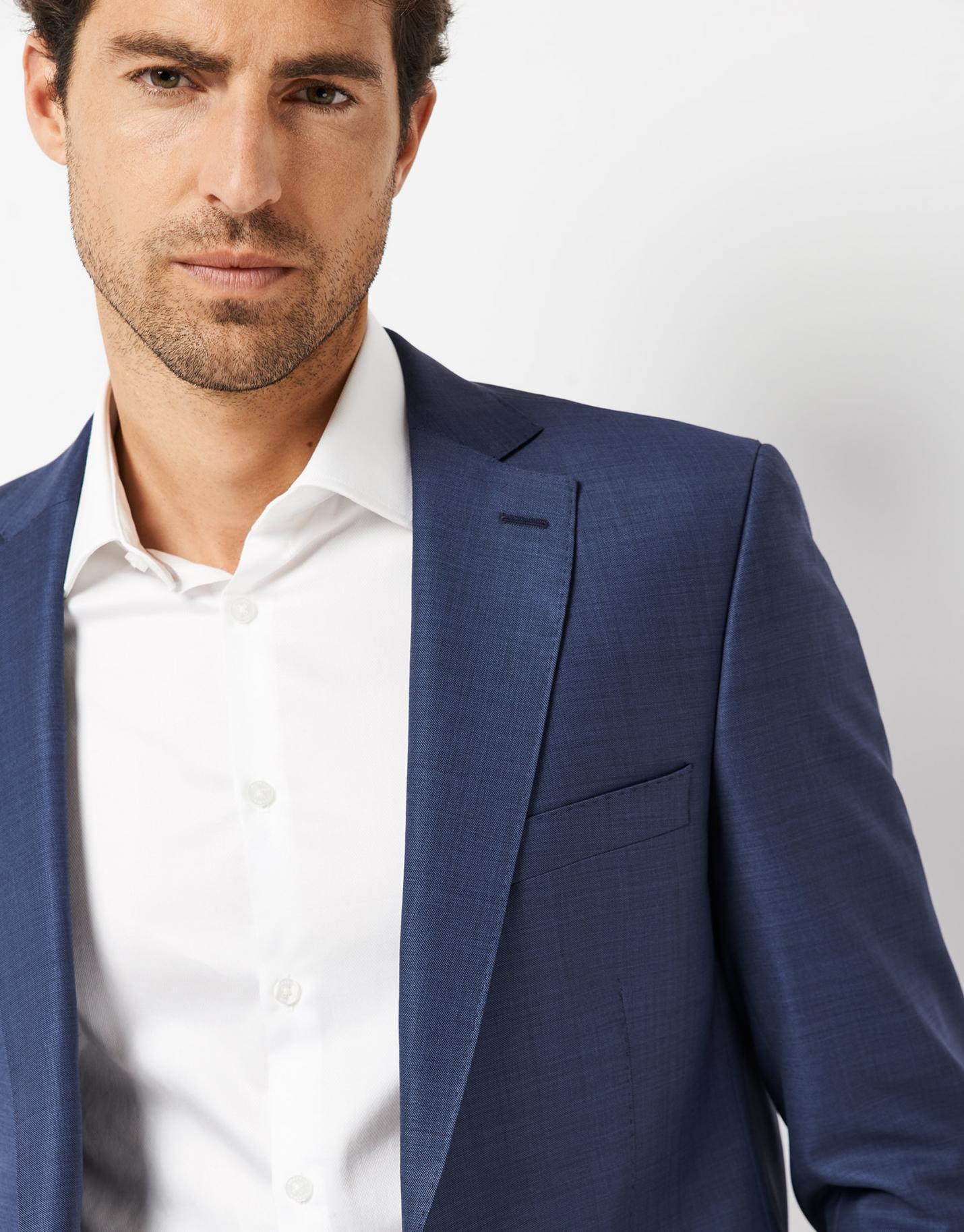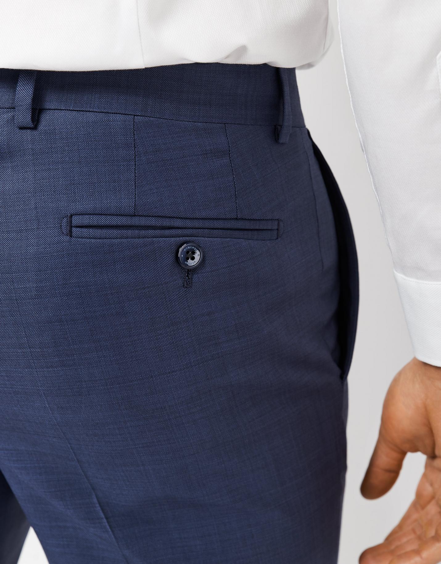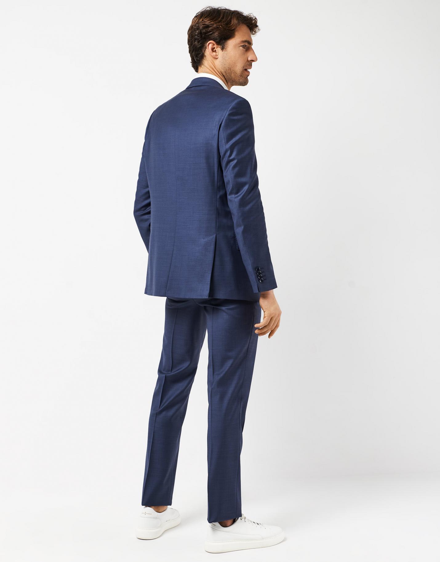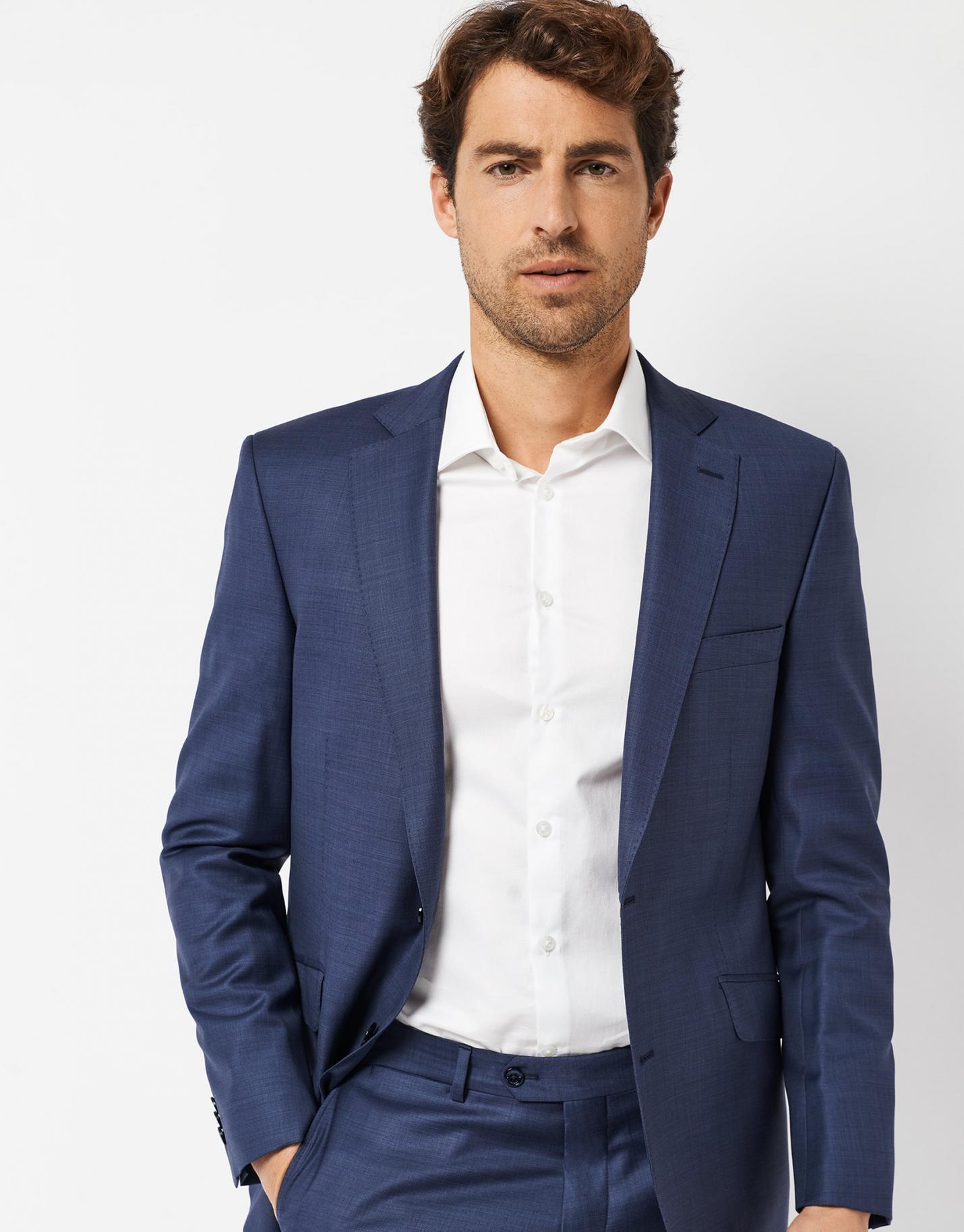 Traje half canvas regular fit confeccionado en una lana lisa color azul oscuro. Pantalones de corte clásico y americana con dos bolsillos de tapeta y uno insertado en pecho. Cierre con dos botones y doble abertura en espalda. Corte slim fit