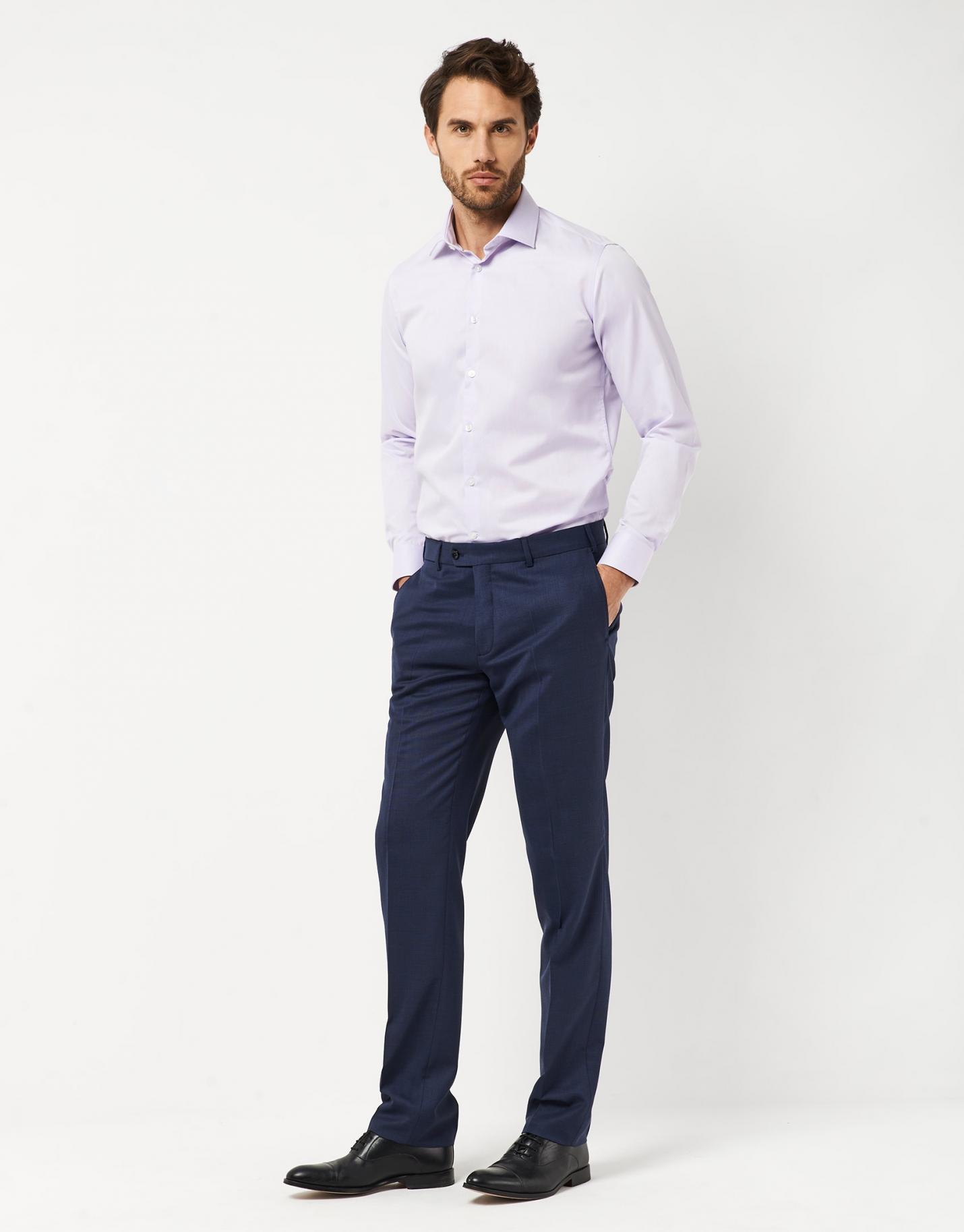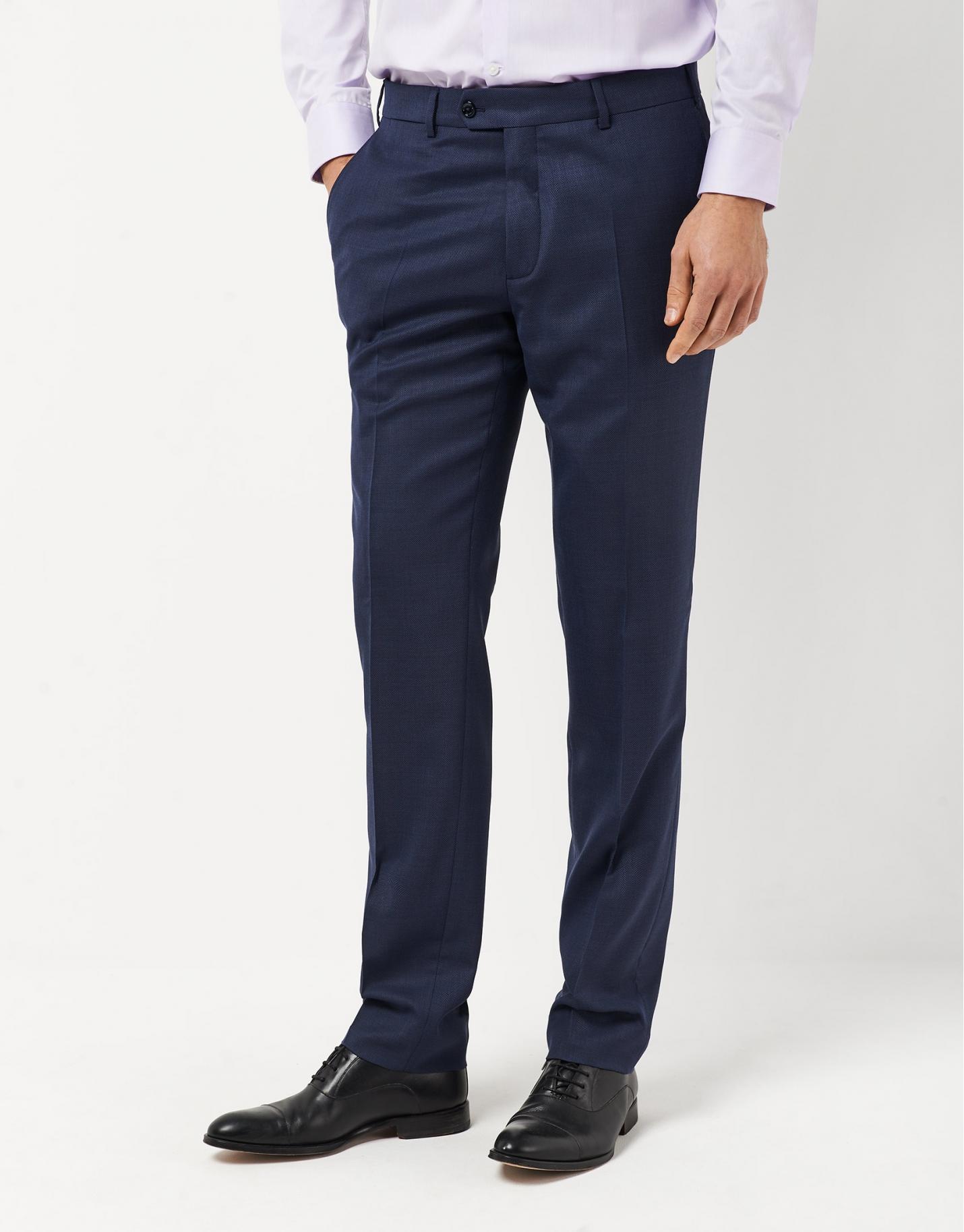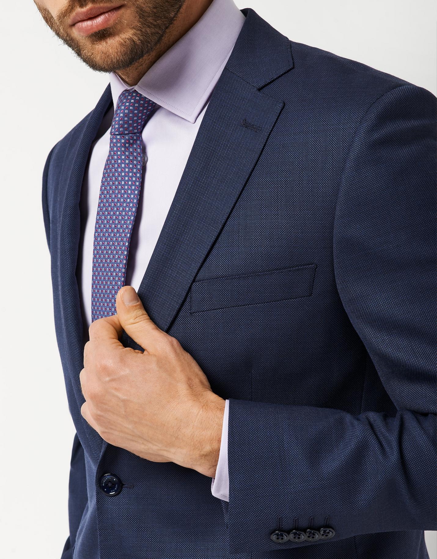 Traje de hombre half canvas regular fit, elaborado en un tejido de ojo de perdiz tonos azules. Este traje incluye unos pantalones de corte clásico y americana con 2 bolsillos con tapeta y uno insertado en pecho. Cierre de dos botones y doble abertura en espalda.