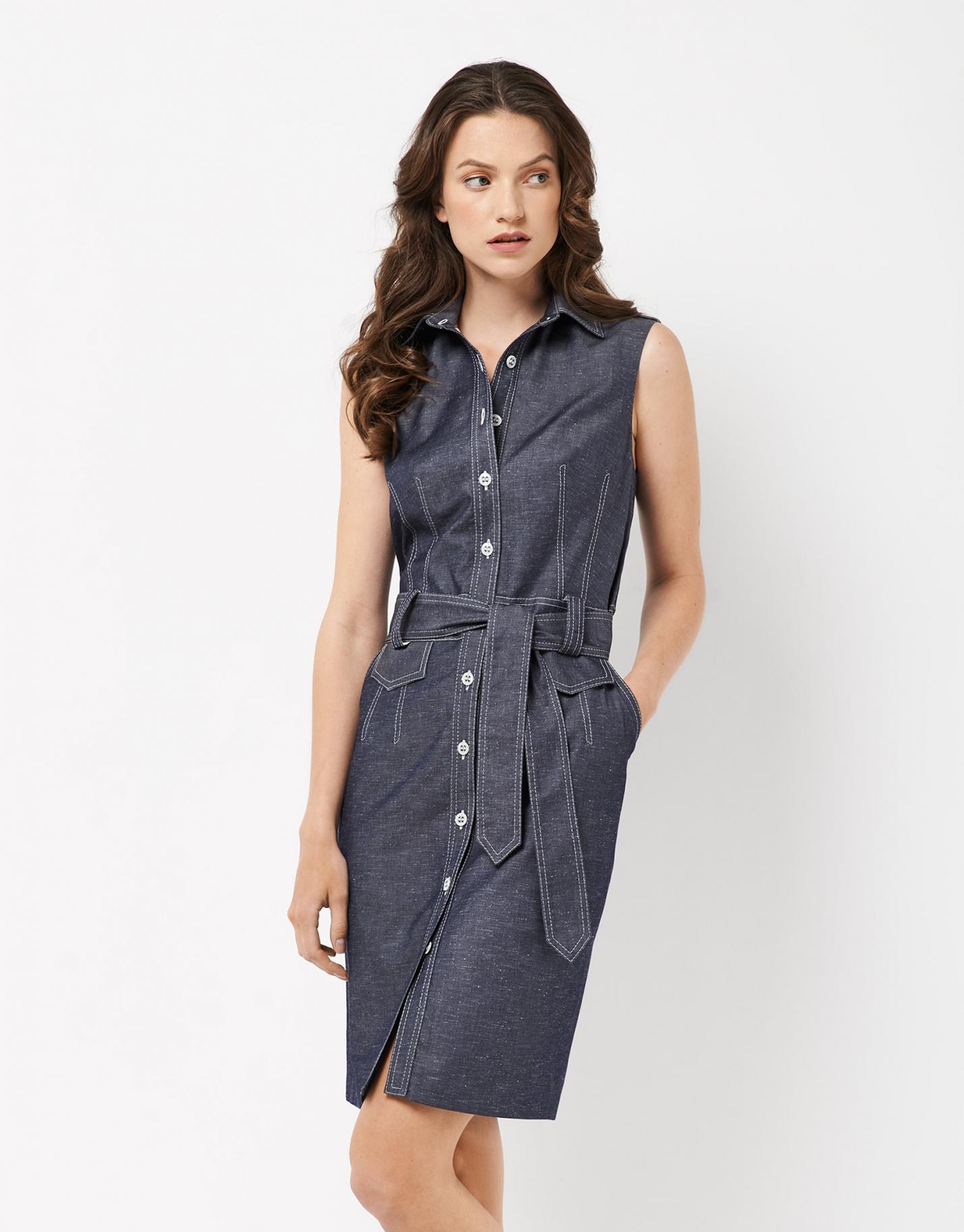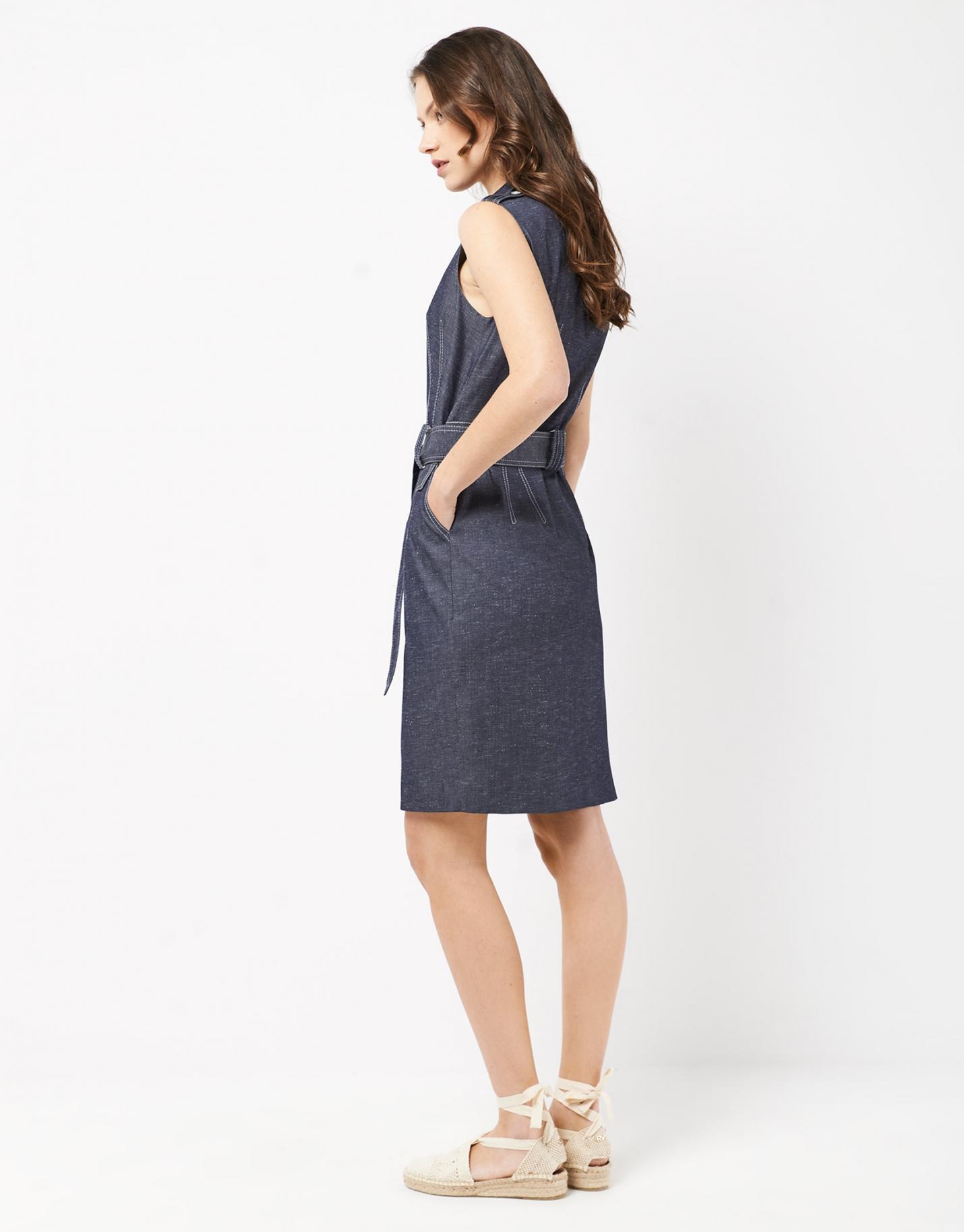 Vestido camisero sin mangas confeccionado en un tejido estilo jean azul jaspeado. Cuello camisero, manga sisa con trabillas en hombros, pinzas y trabillas en cintur…