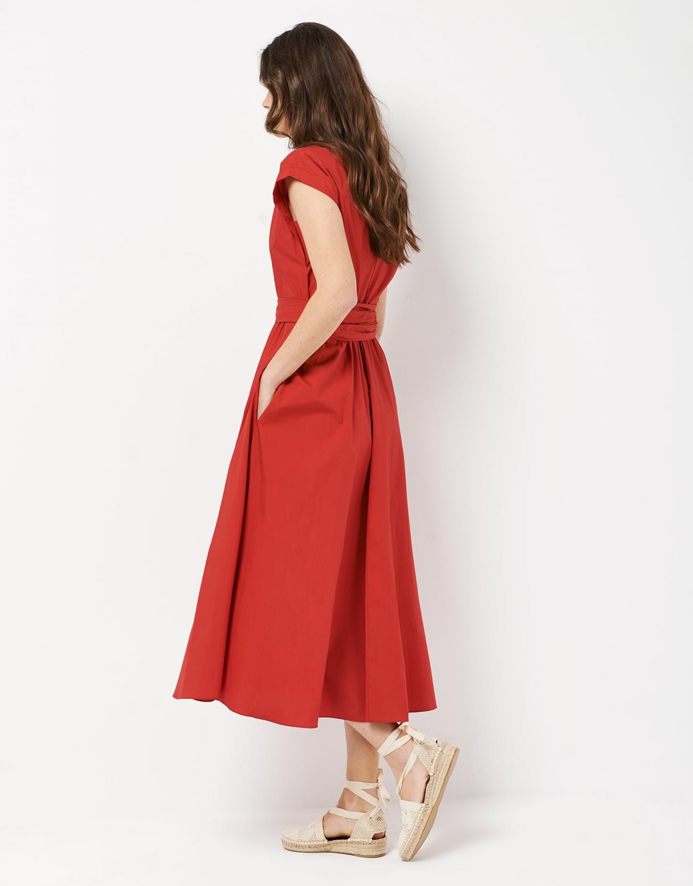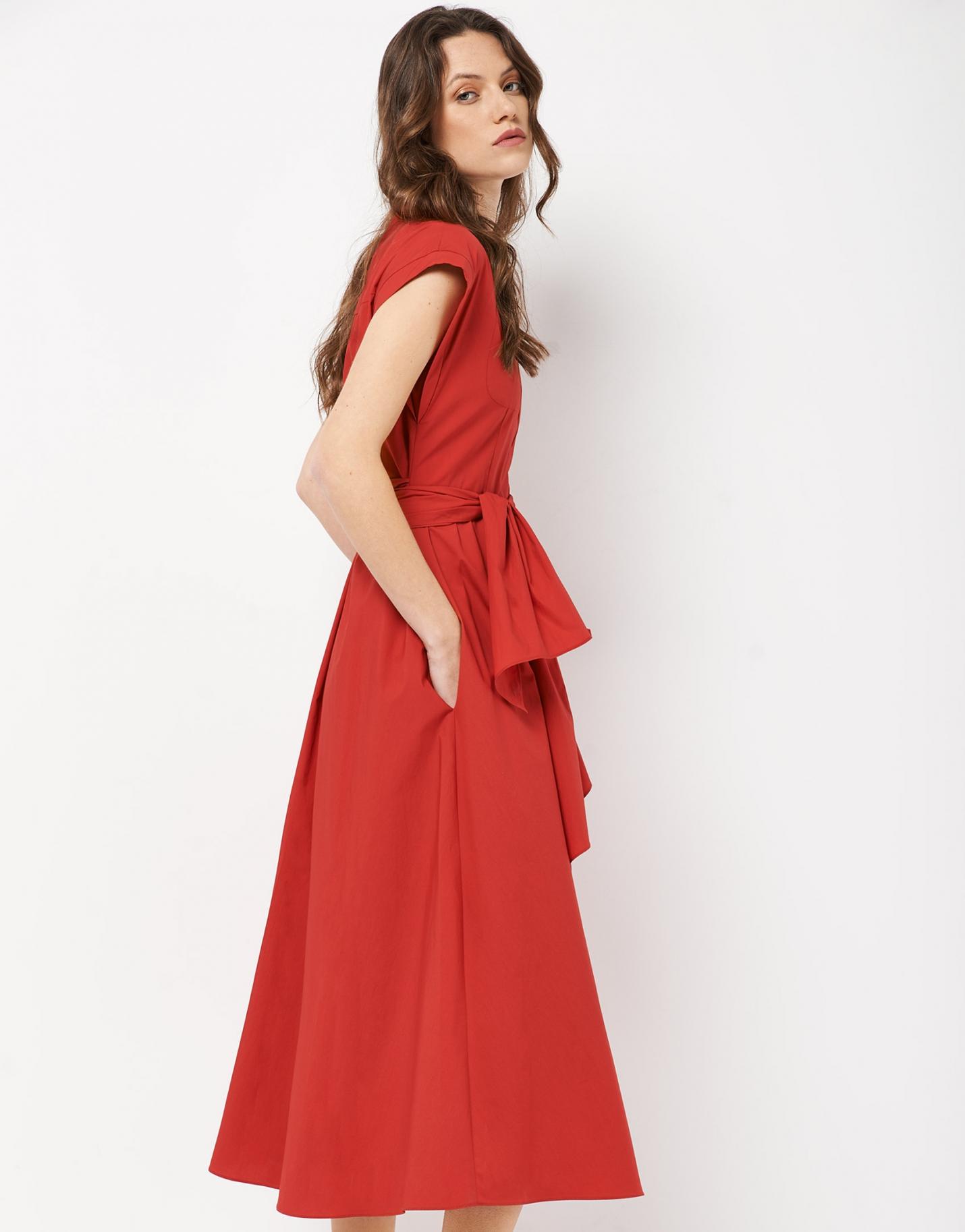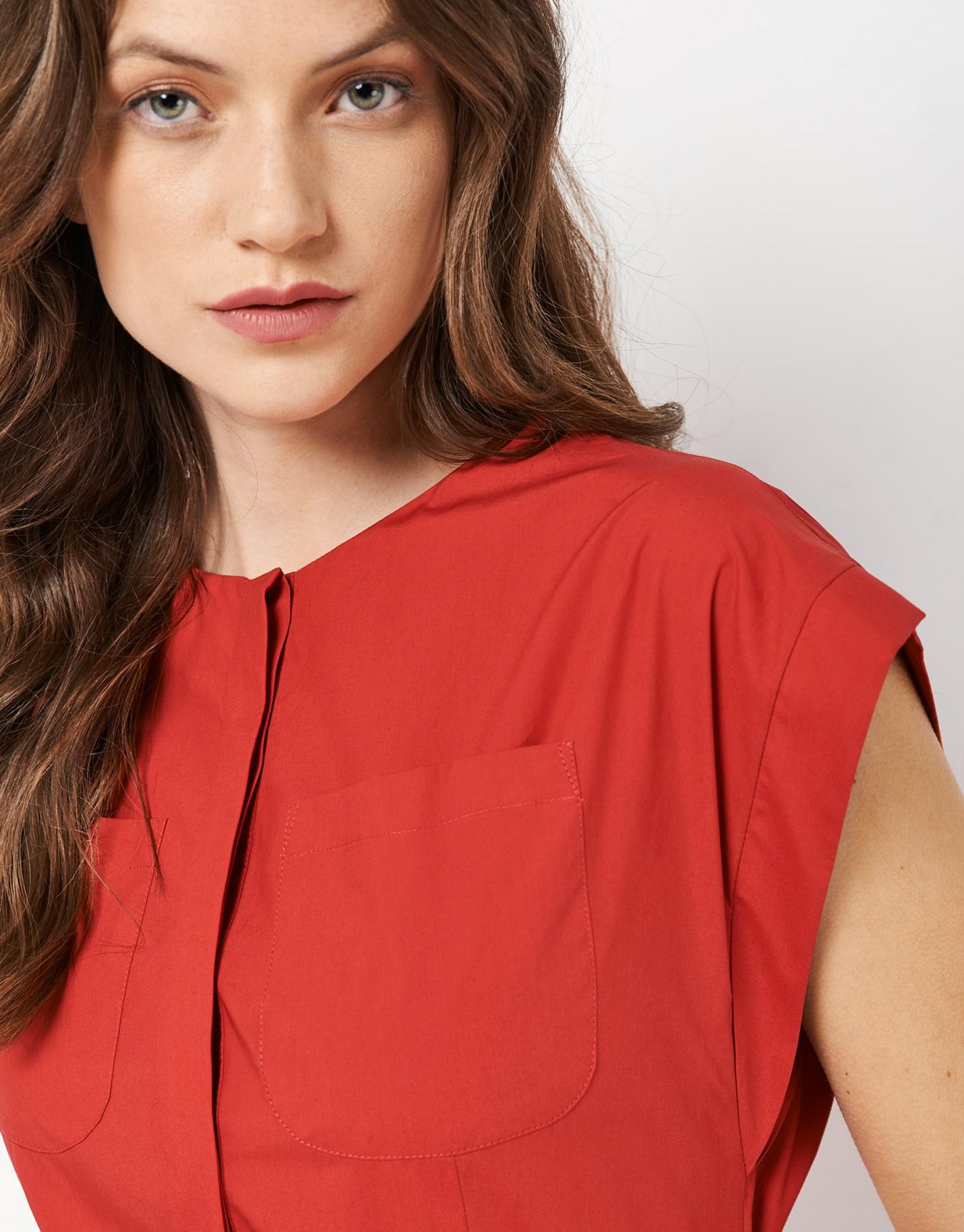 Vestido camisero sin mangas midi confeccionado en un tejido de algodón color rojo. Escote redondo, cierre en delantero con botonadura oculta bajo tapeta, dos bolsillos en pecho y dos laterales en cadera. Cintura ajustada con lazada del mismo tejido.