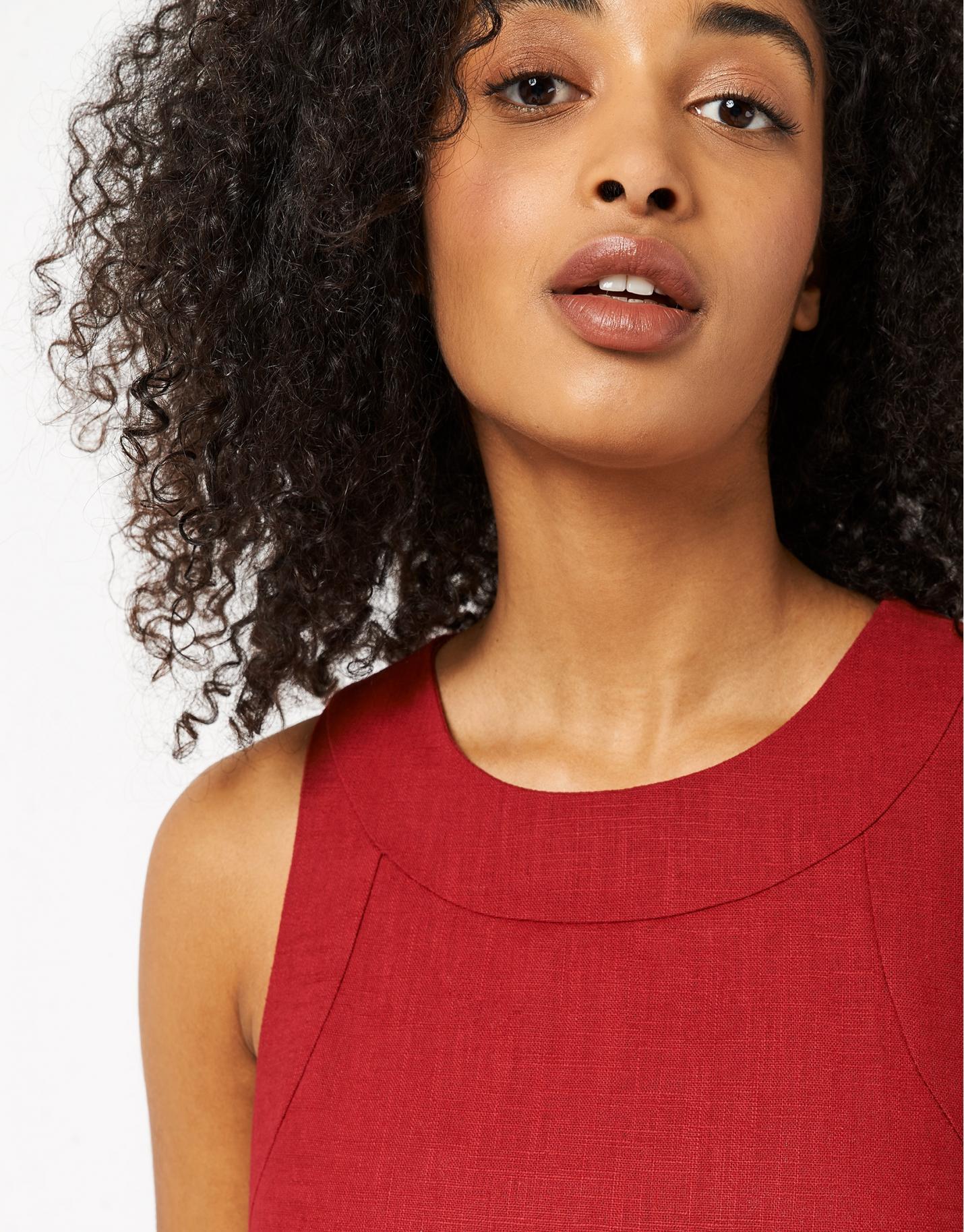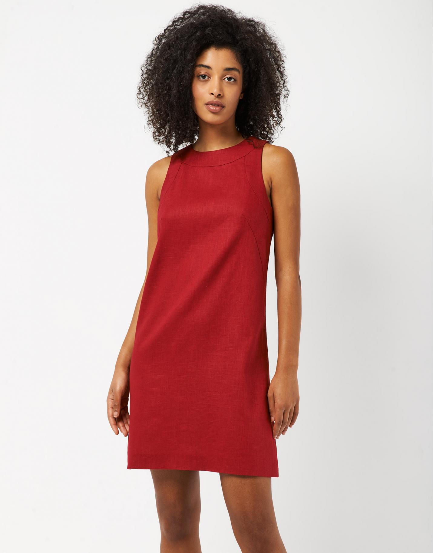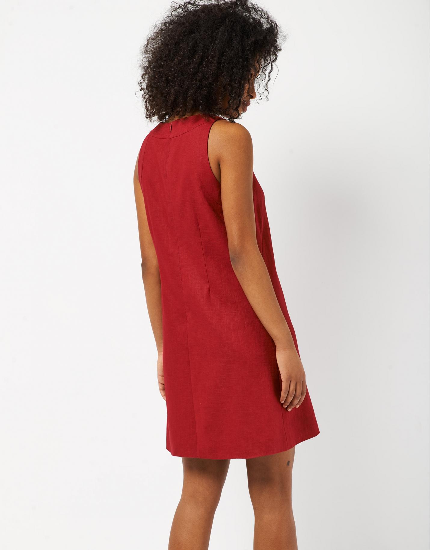Vestido corto sin mangas confeccionado en ramio color granate con escote halter y corte recto. Cierre con cremallera en centro espalda.