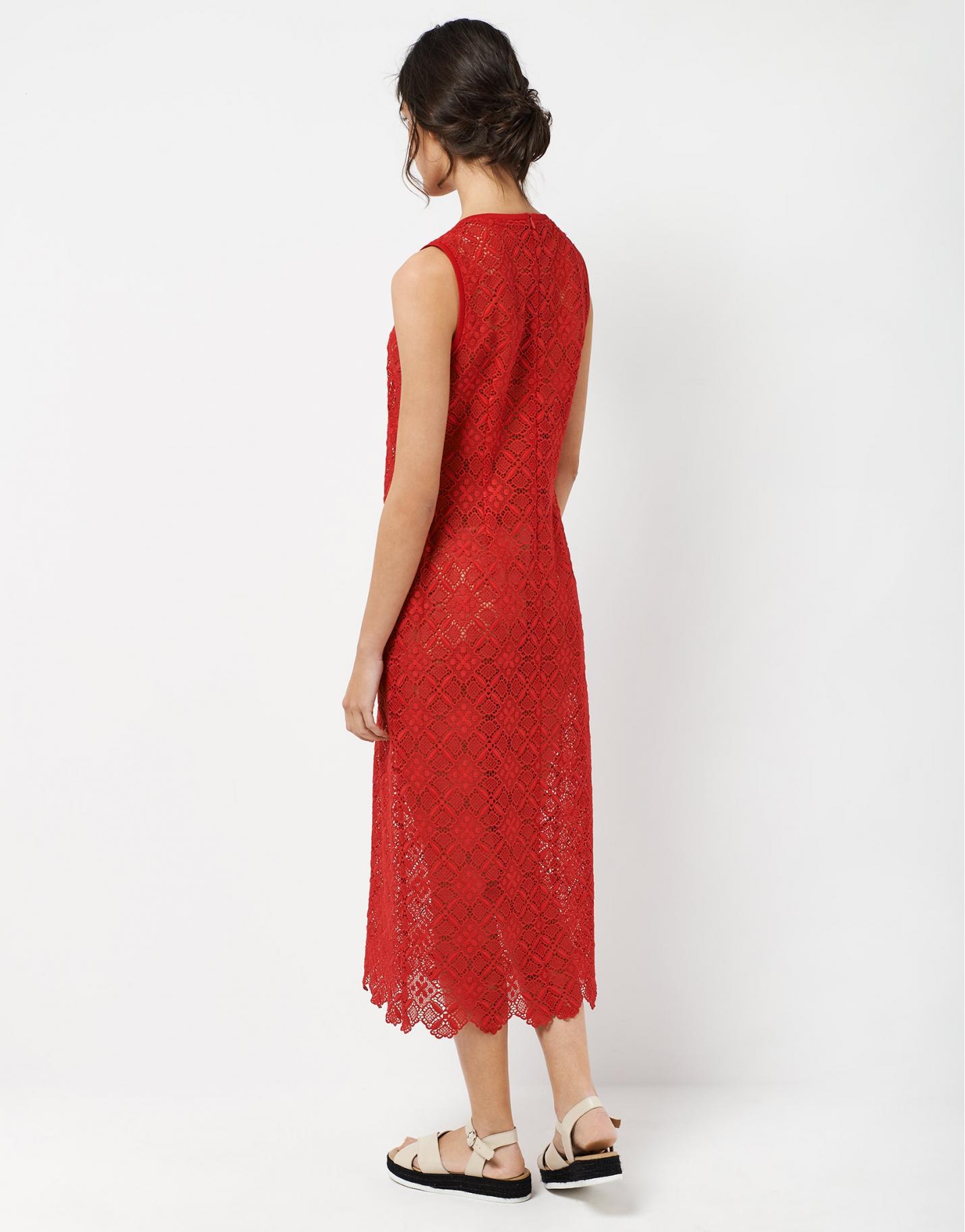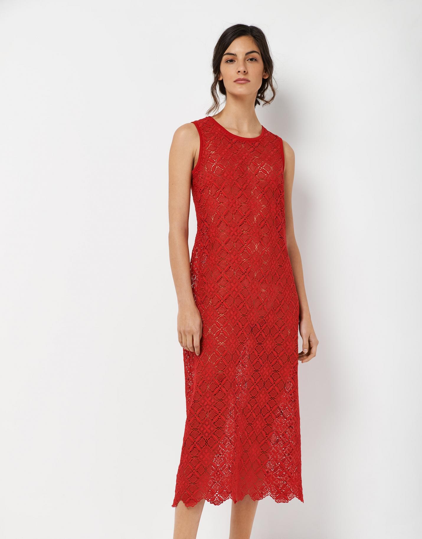 Vestido largo confeccionado en un tejido de encaje color rojo con escote redondo y manga sisa rematados con canalé.