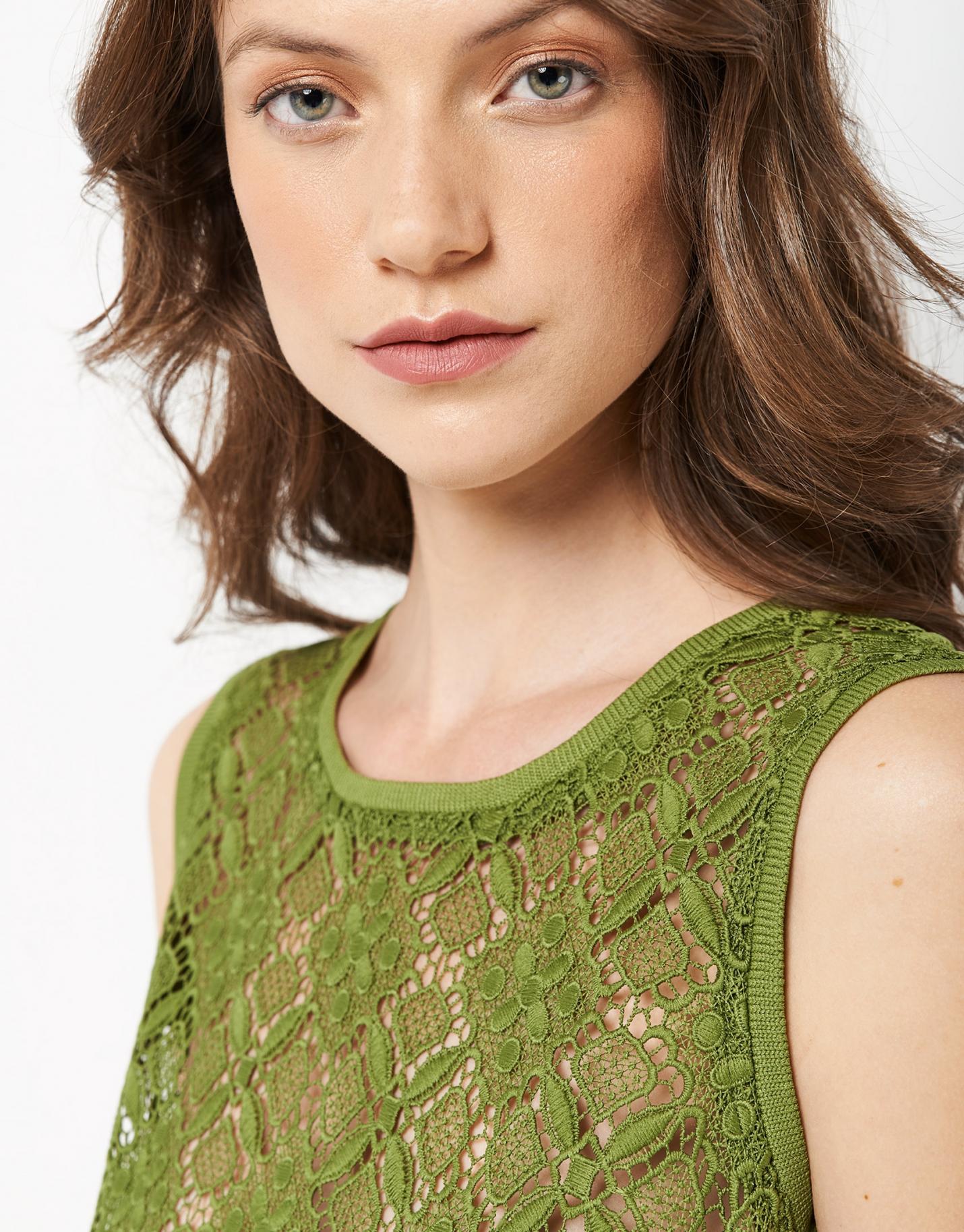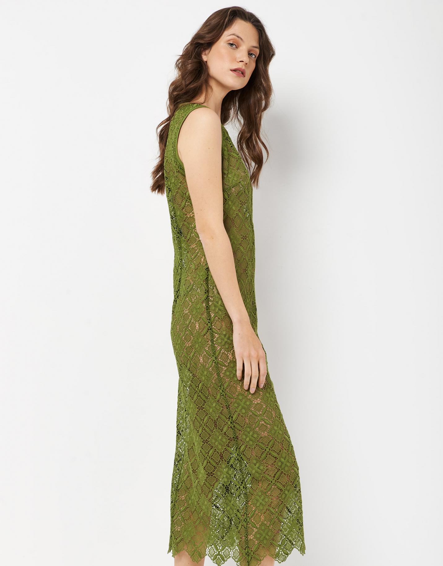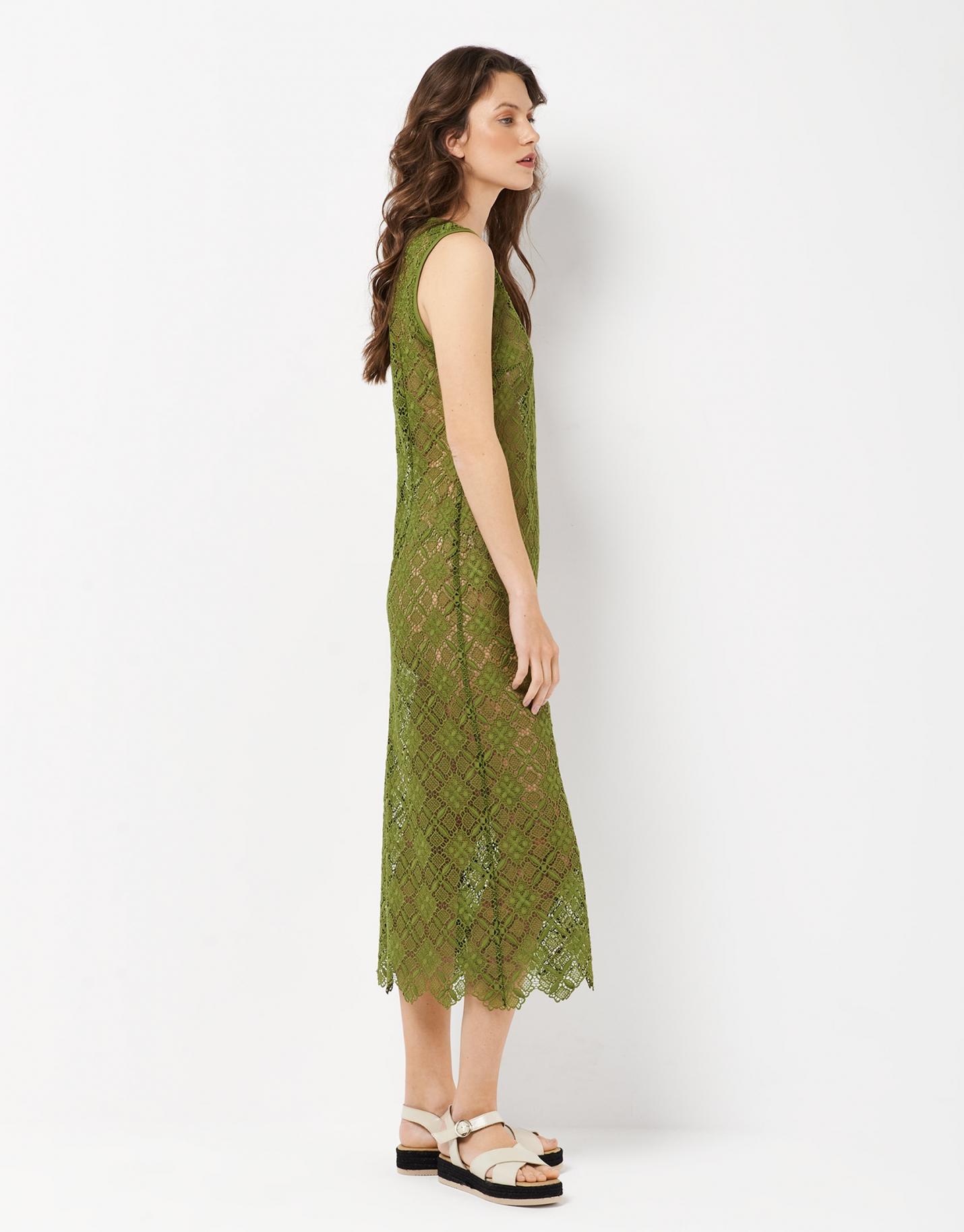 Vestido largo confeccionado en un tejido de encaje color verde con escote redondo y manga sisa rematados con canalé.