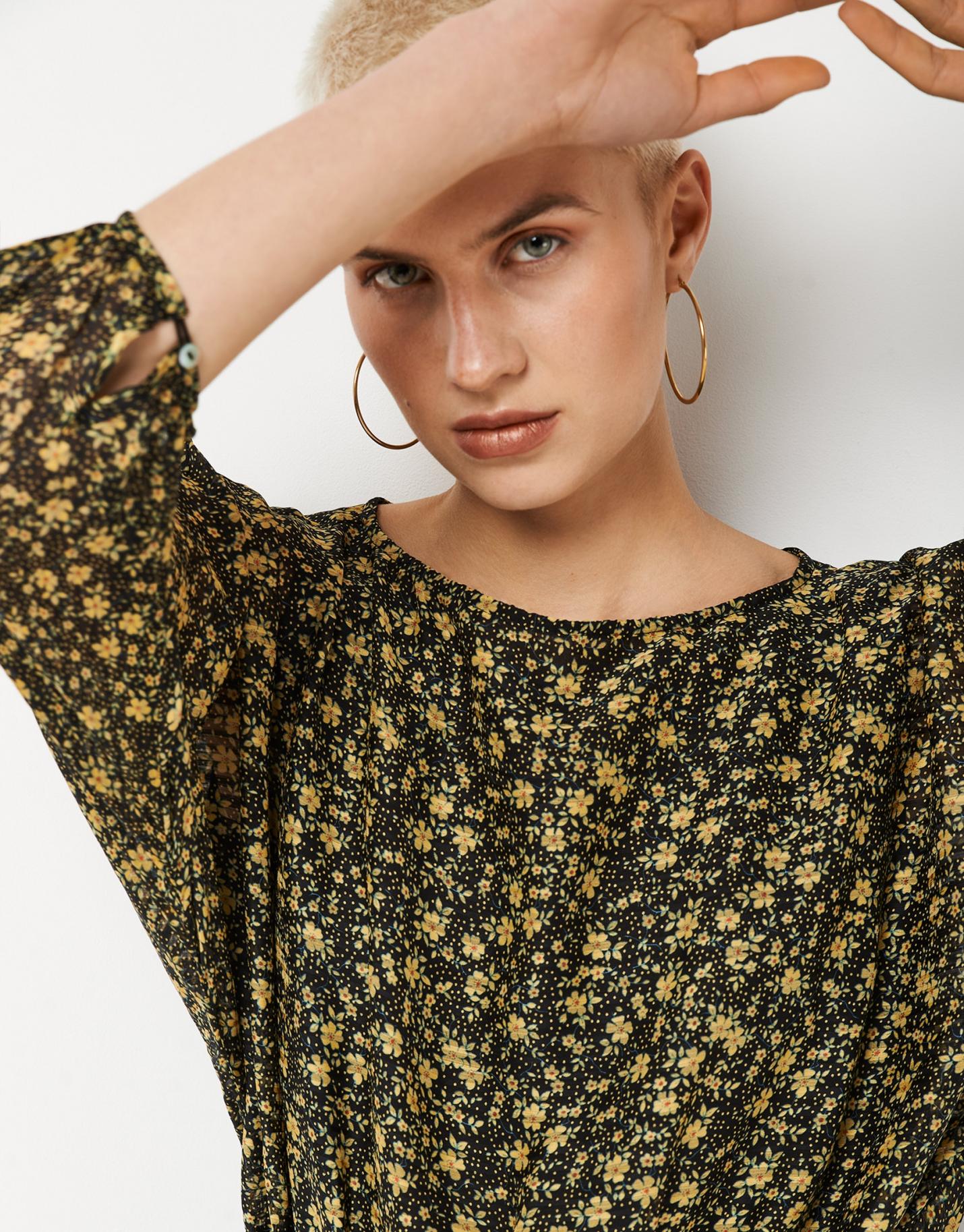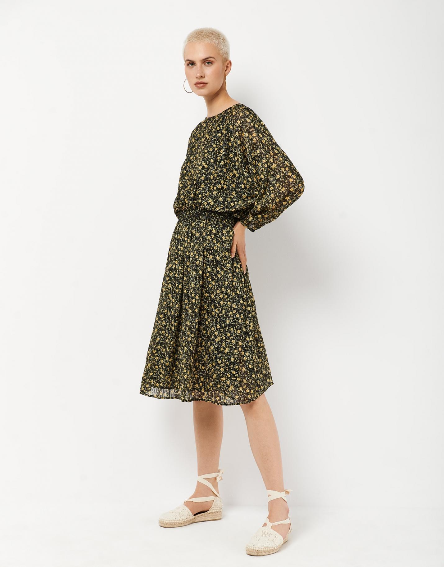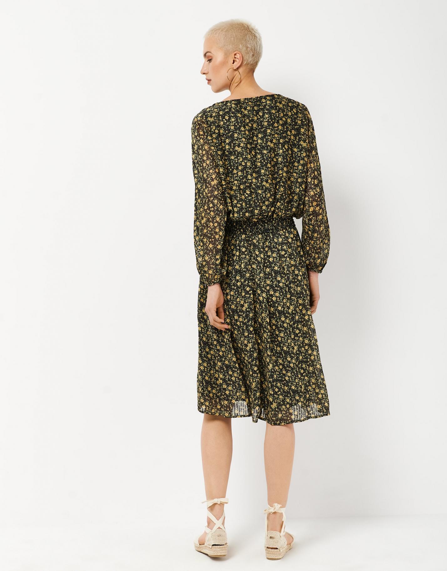 Vestido midi confeccionado en un tejido fluido con estampado de flores amarillas. Escote redondo, manga larga abullonada cerrada con botón, cuerpo abullonado y falda fruncida con cinturilla de goma.