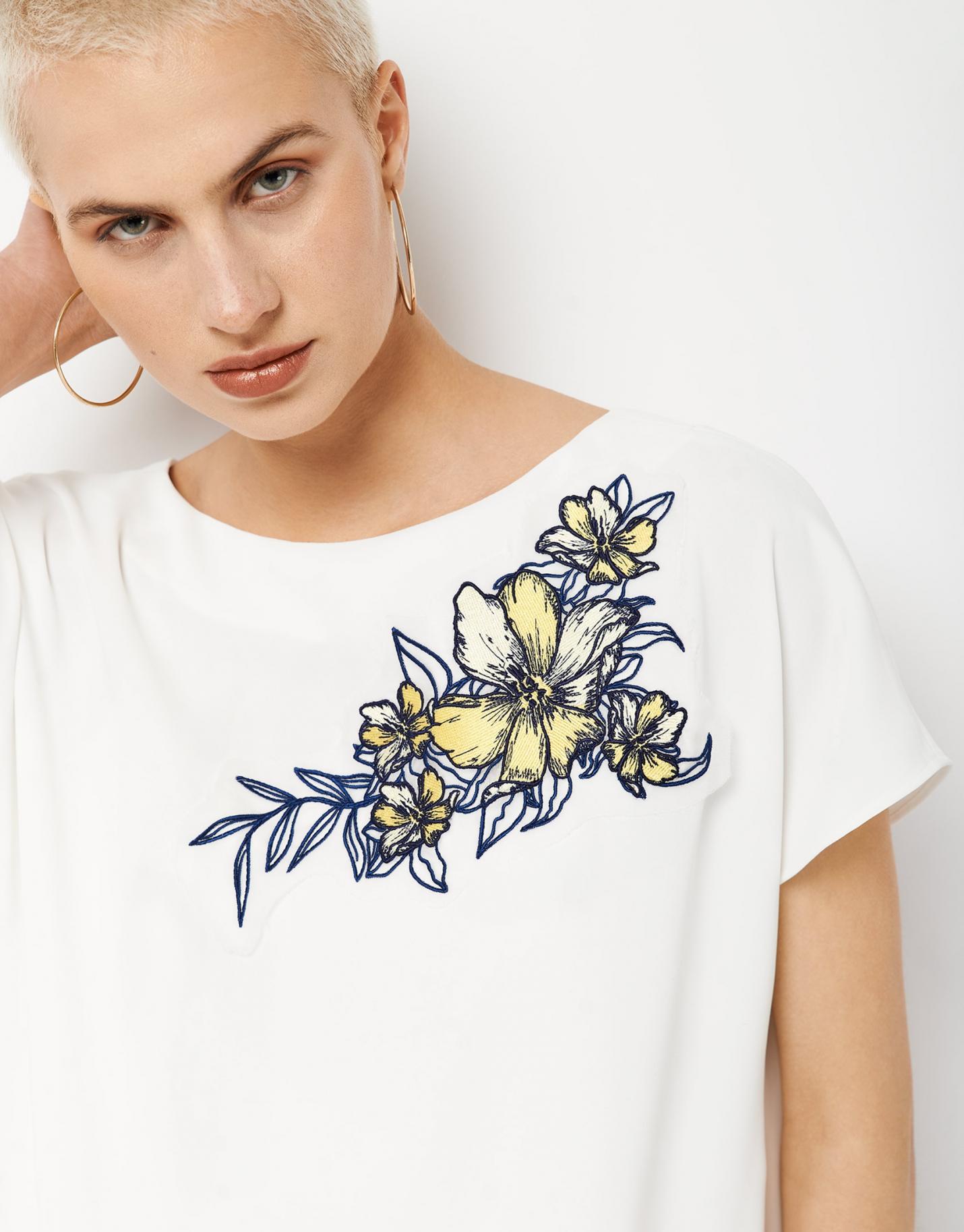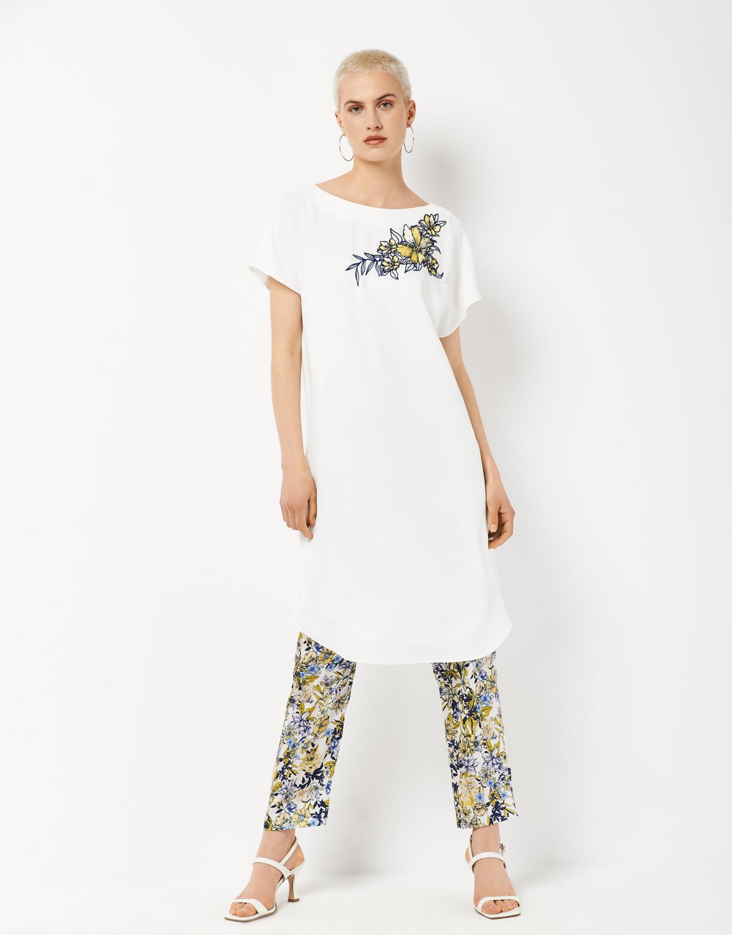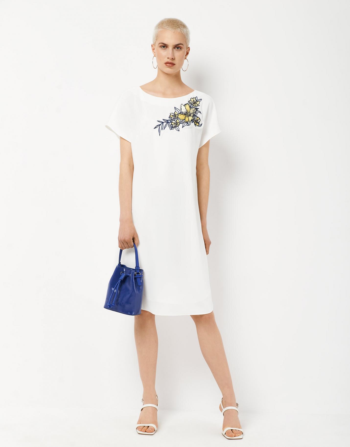 Vestido midi sin mangas confeccionado en un tejido blanco con aplicación bordada en pecho de motivo floral en tonos amarillos y azules. Escote barco en delantero y en pico en espalda con tiras horizontales. Bajo con pequeñas aberturas en laterales.