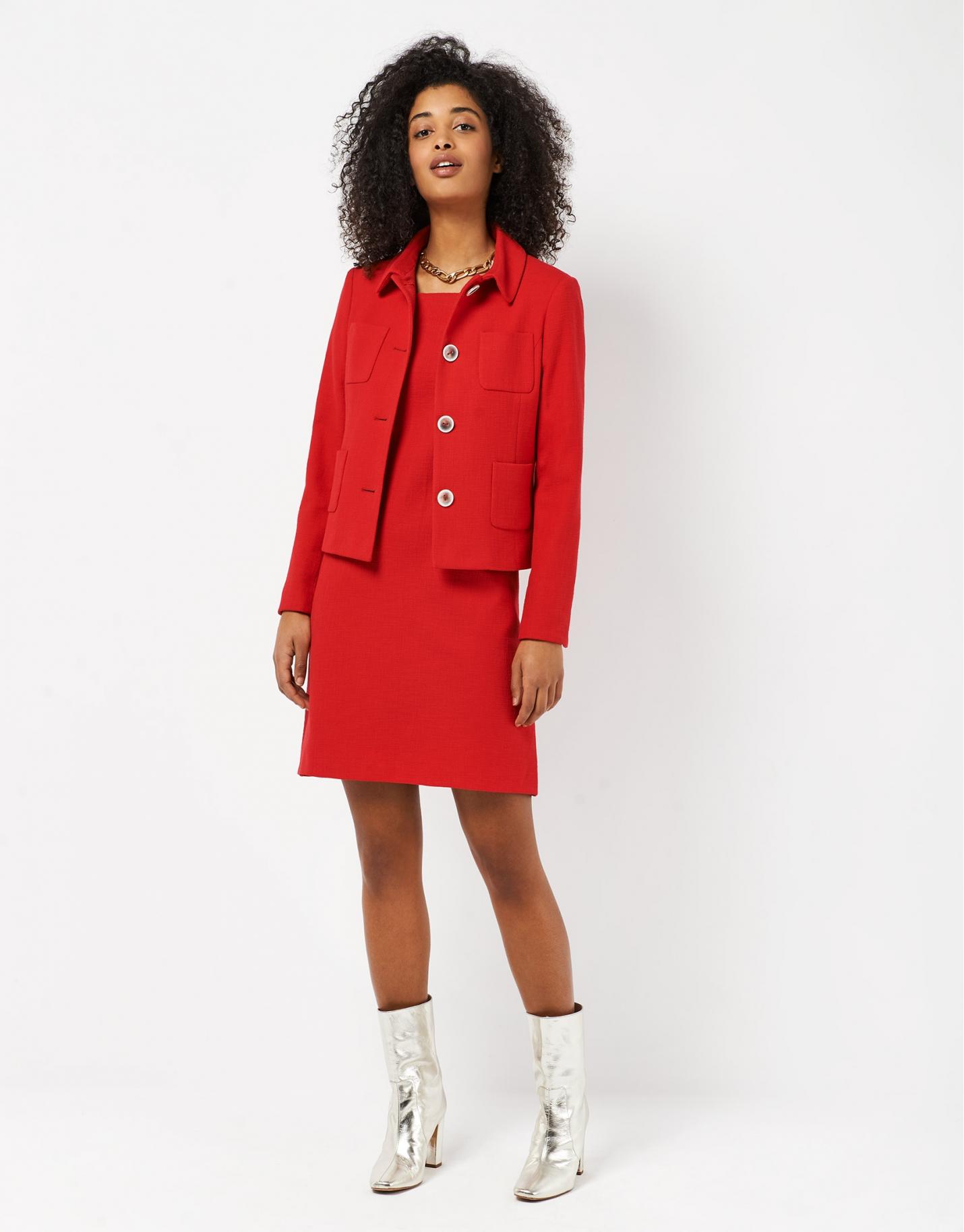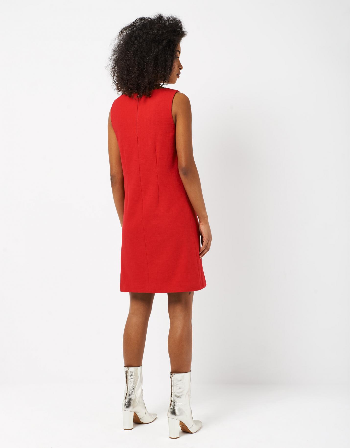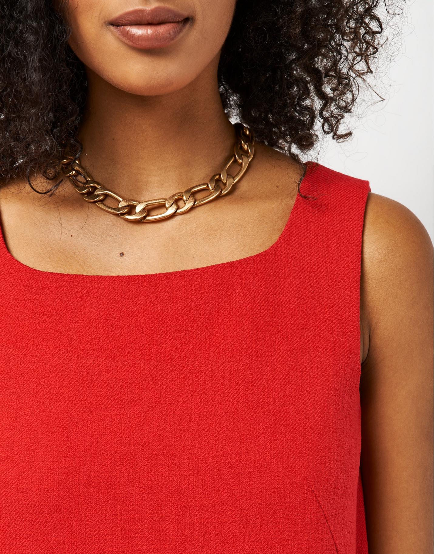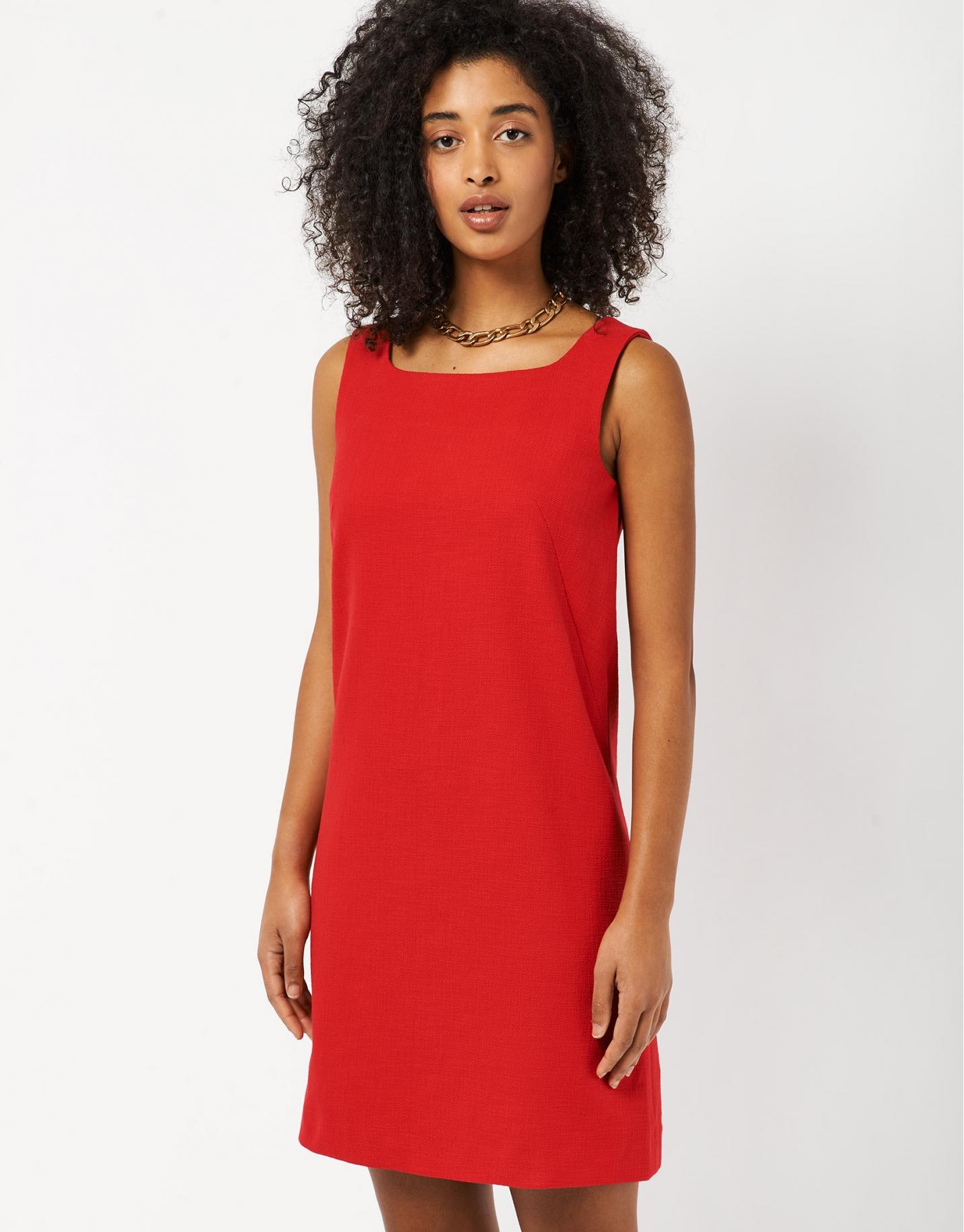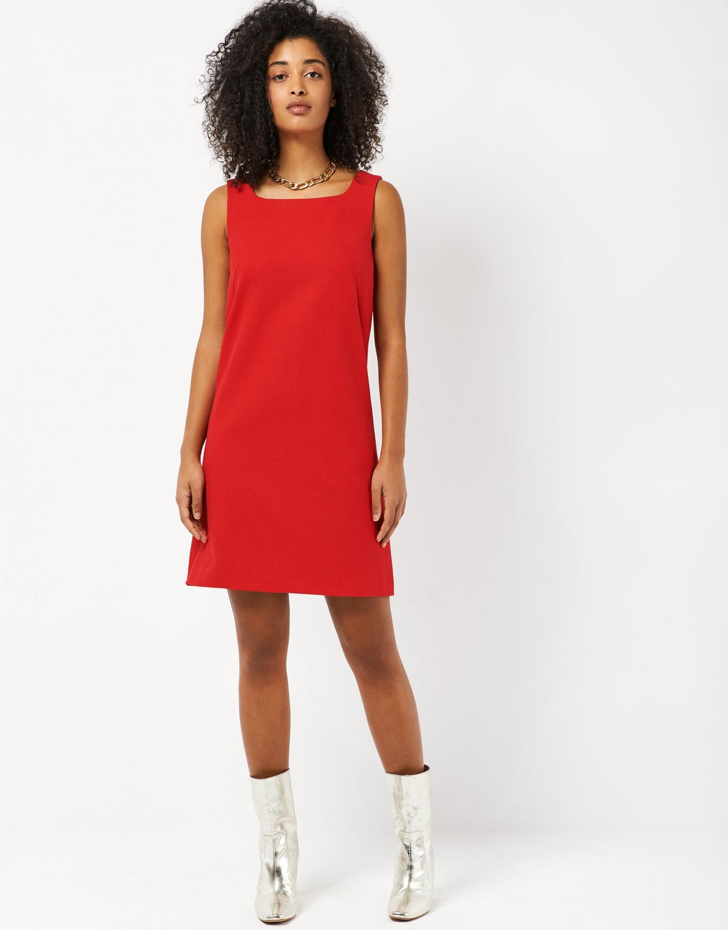 Vestido corto de sisas confeccionado en un tejido de algodón rojo. Escote cuadrado y corte recto. Cierre con cremallera en centro espalda.