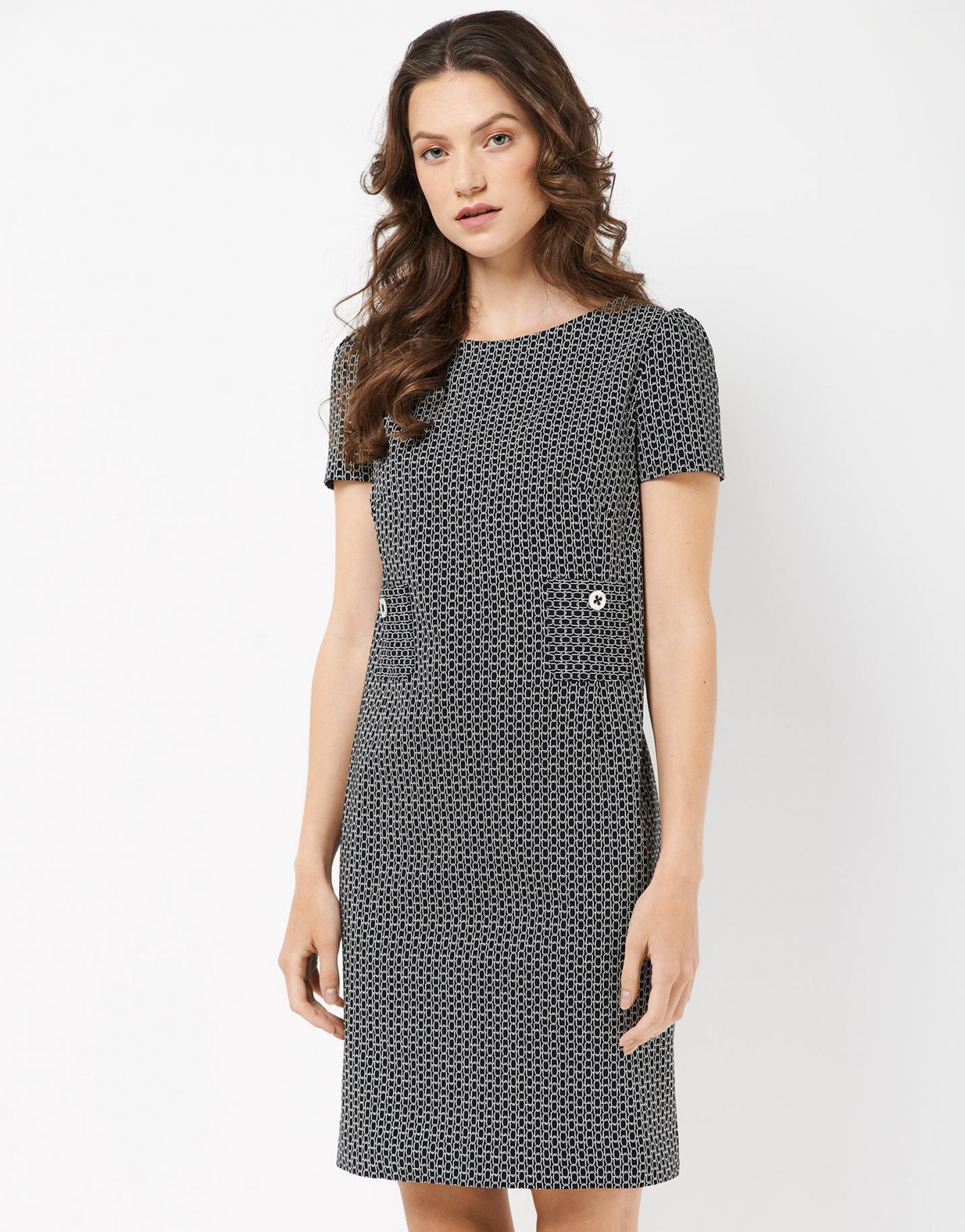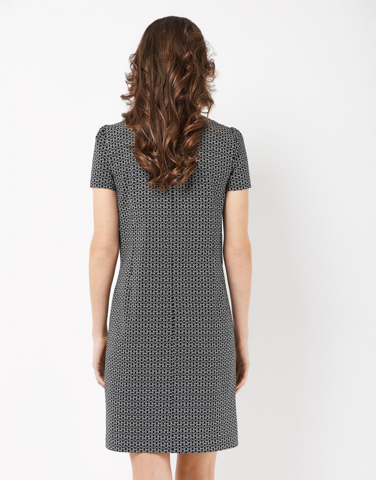 Vestido de manga corta confeccionado en un tejido de punto color negro con estampado de cadenas en blanco. Escote redondo, corte recto, pinzas en pecho y bolsillos de plastrón con botón en cintura. Cierre con cremallera oculta en costura centro espalda.