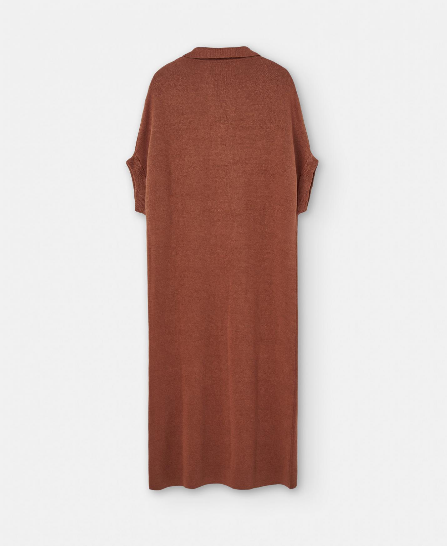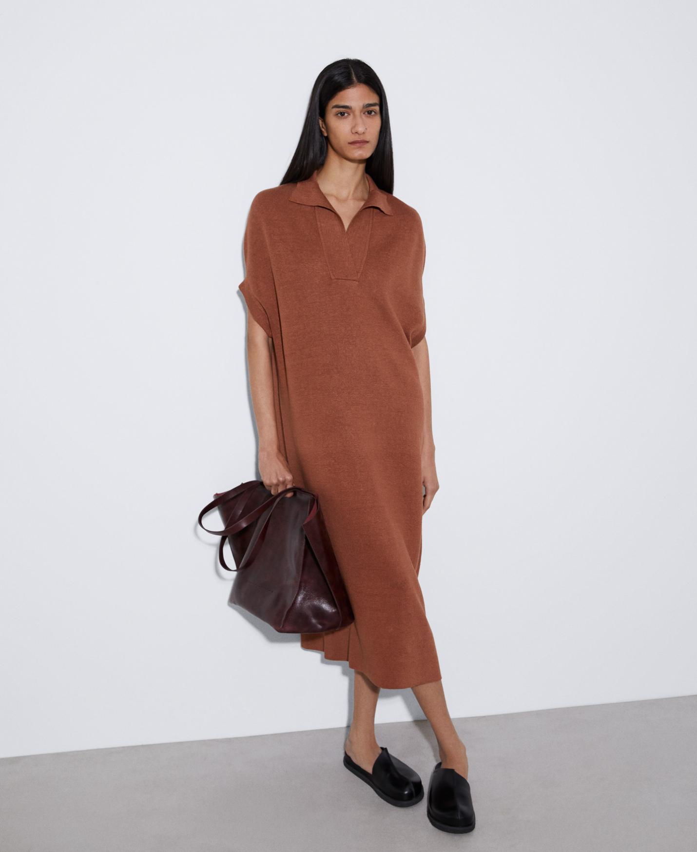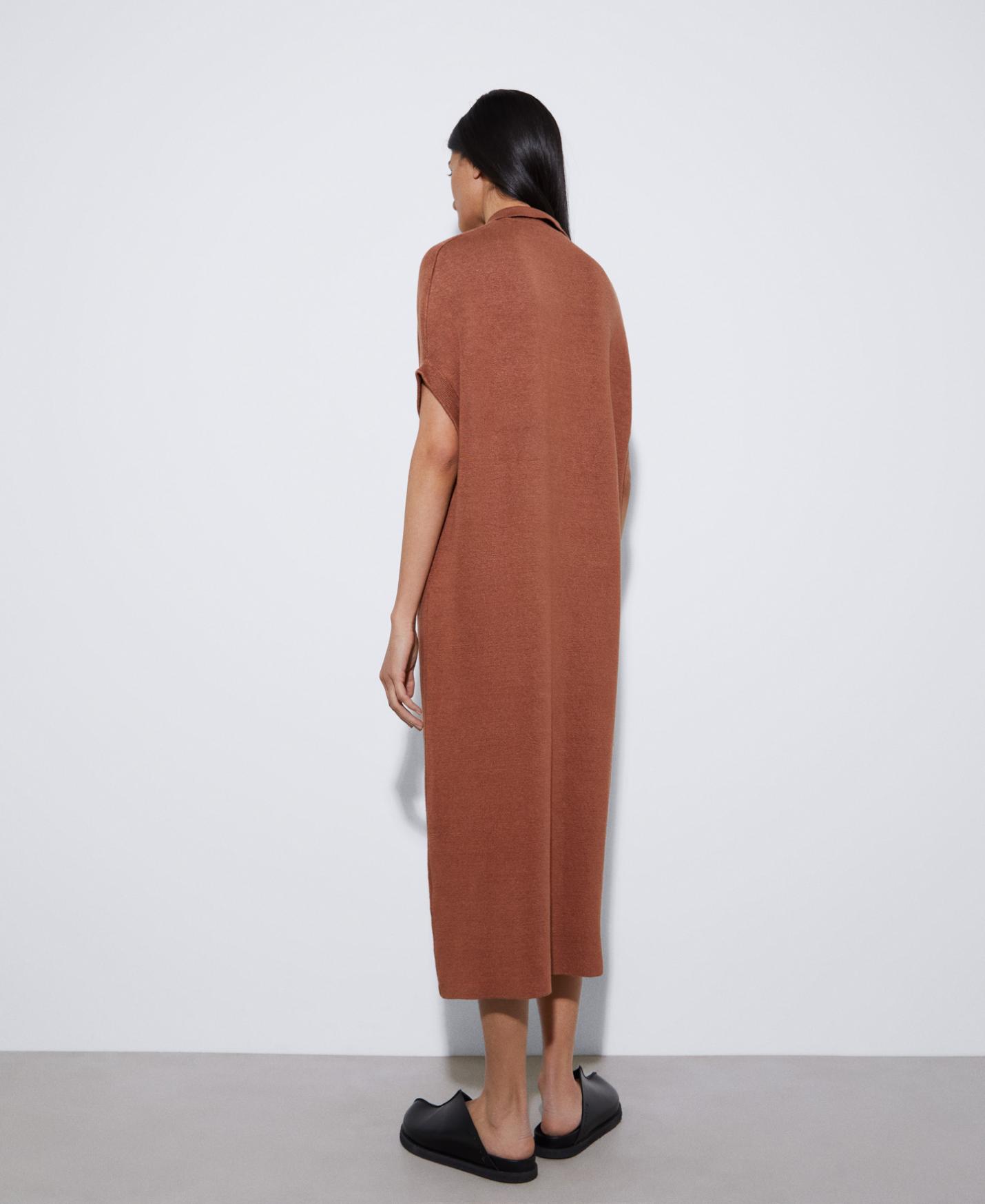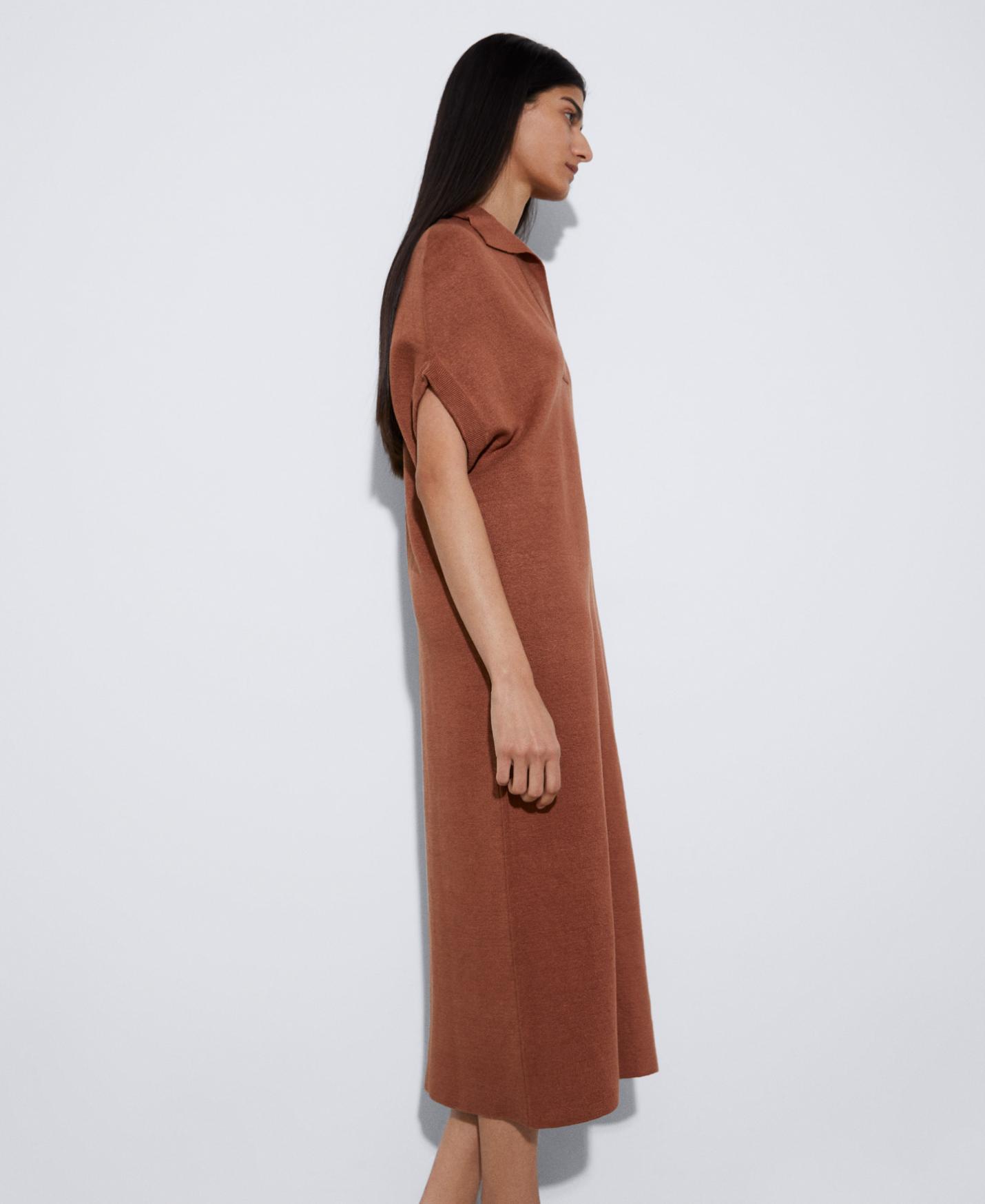 Vestido camisero doble frontura en punto de lino, viscosa y nylon. Largo 3/4, con cuello polo y manga japonesa.