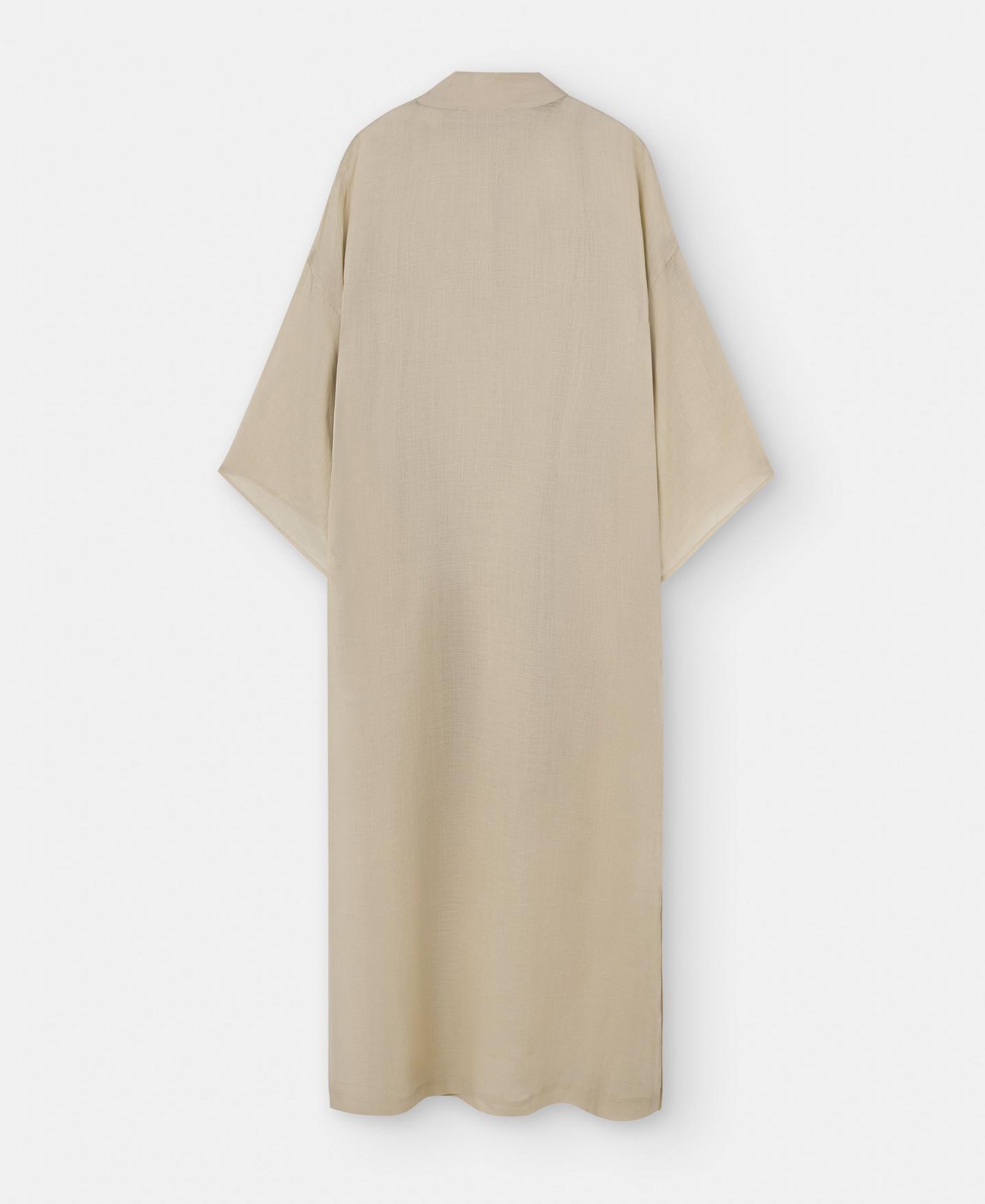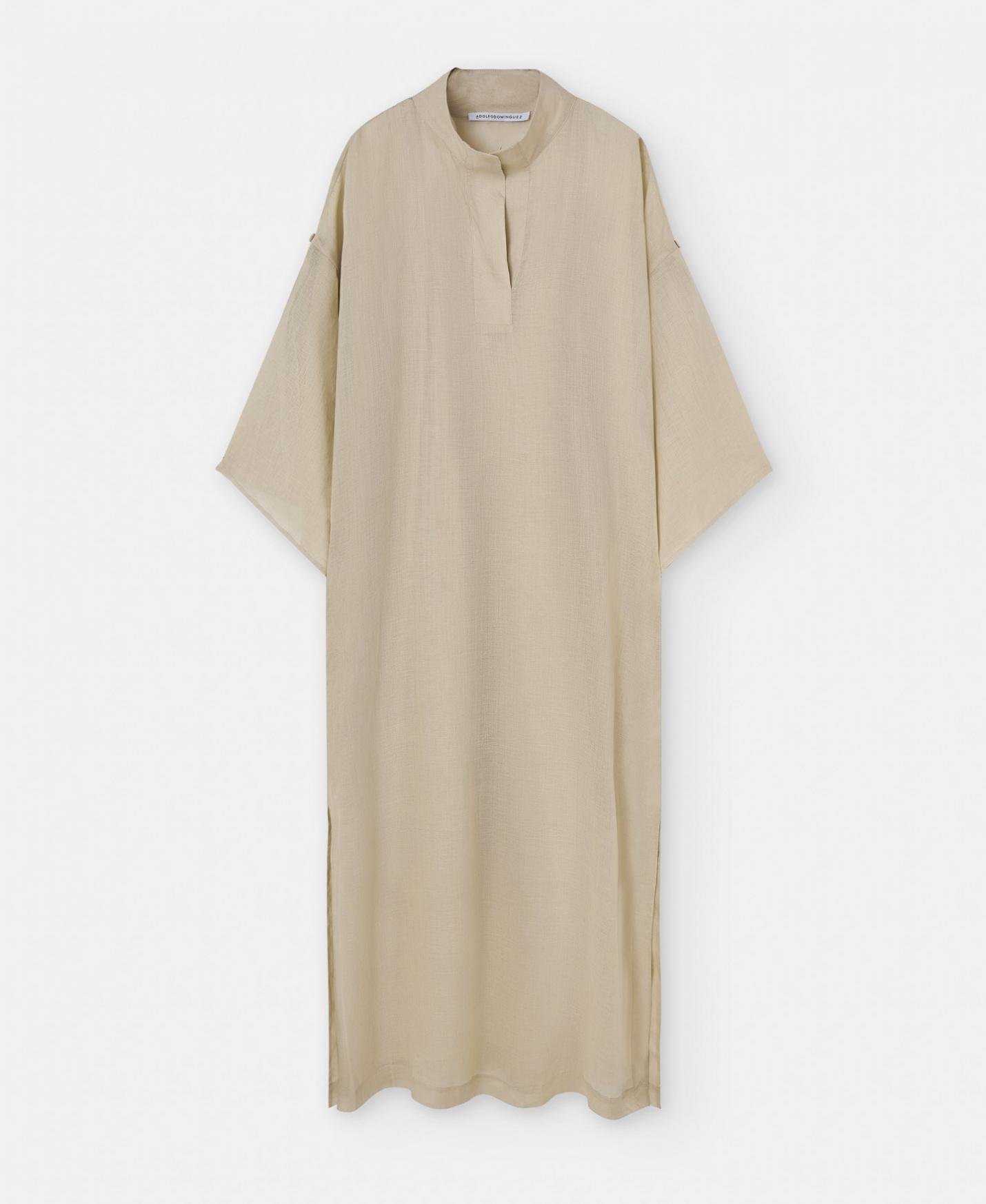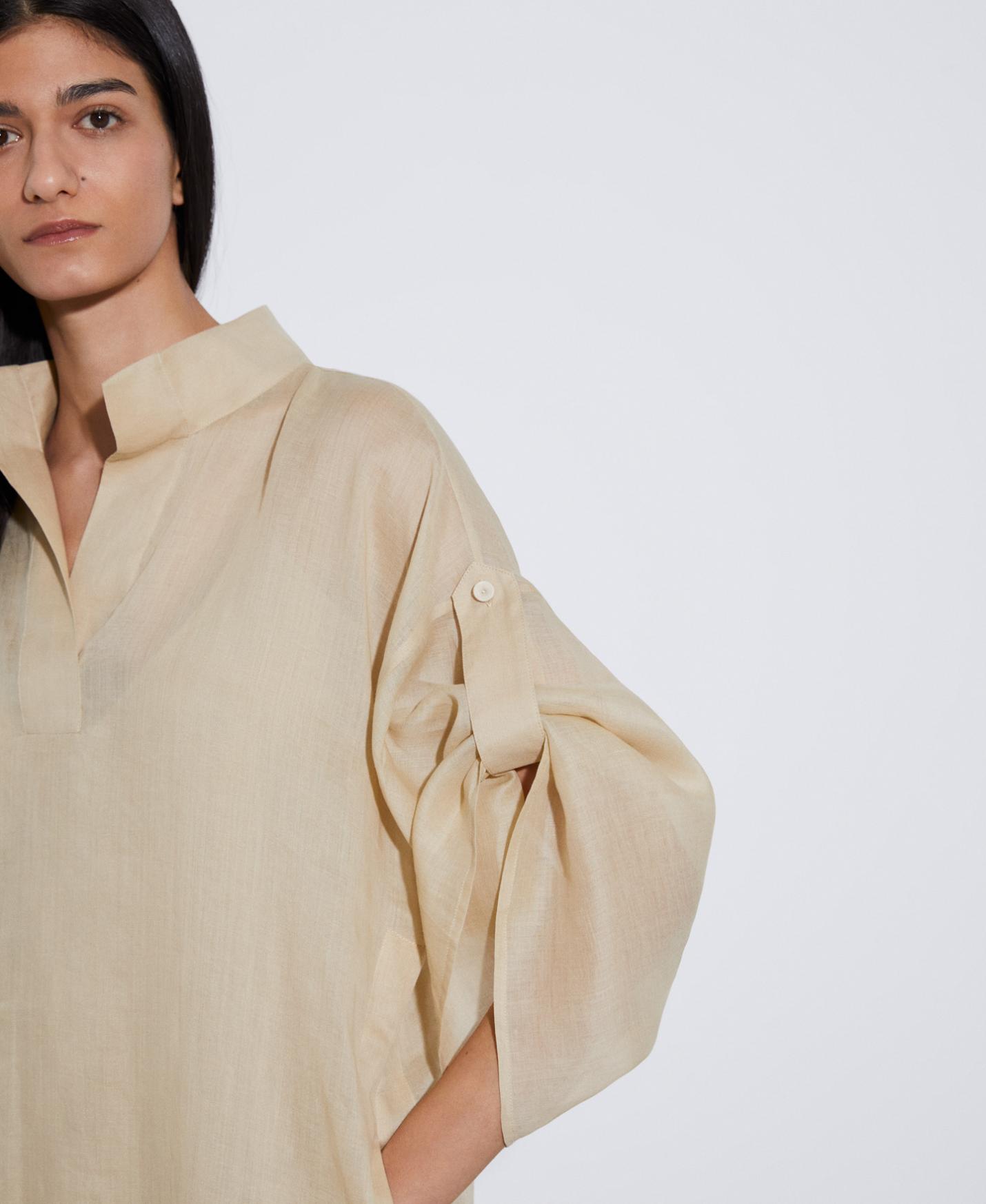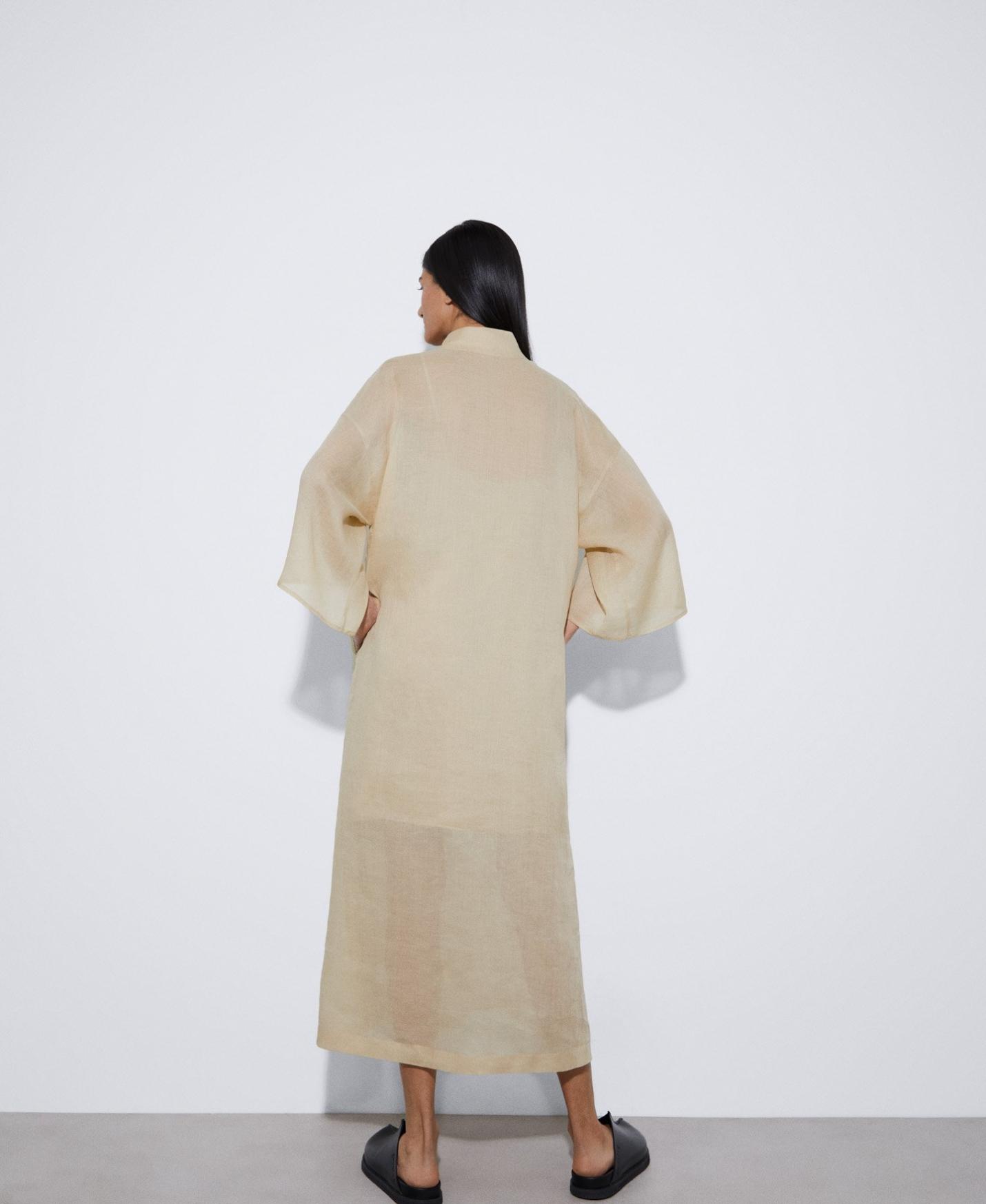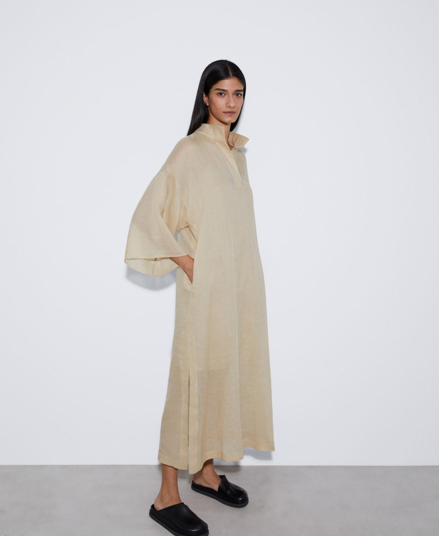 Vestido midi con cuello Mao en ramio. Tiene mangas amplias y botones forrados del mismo tejido.