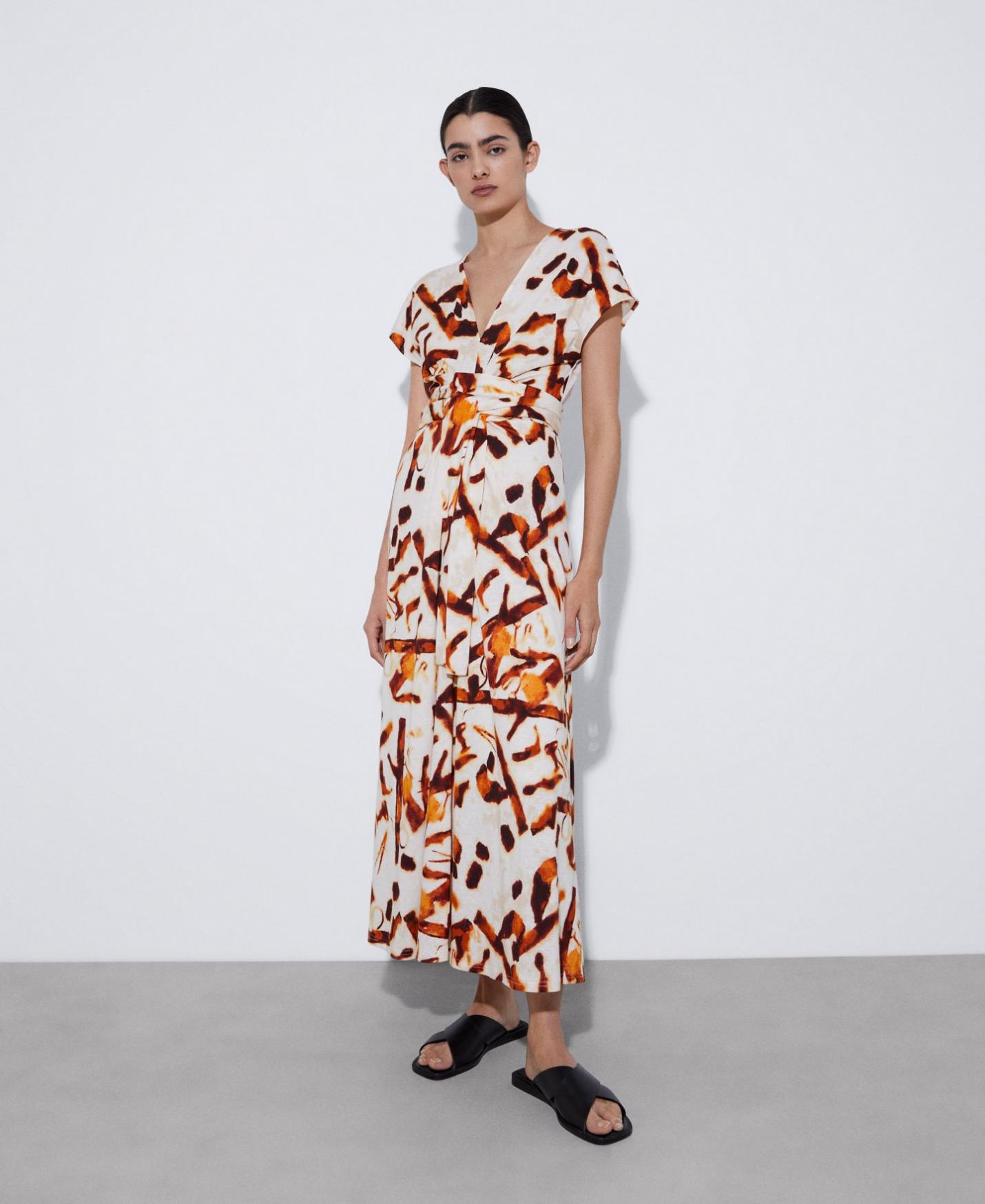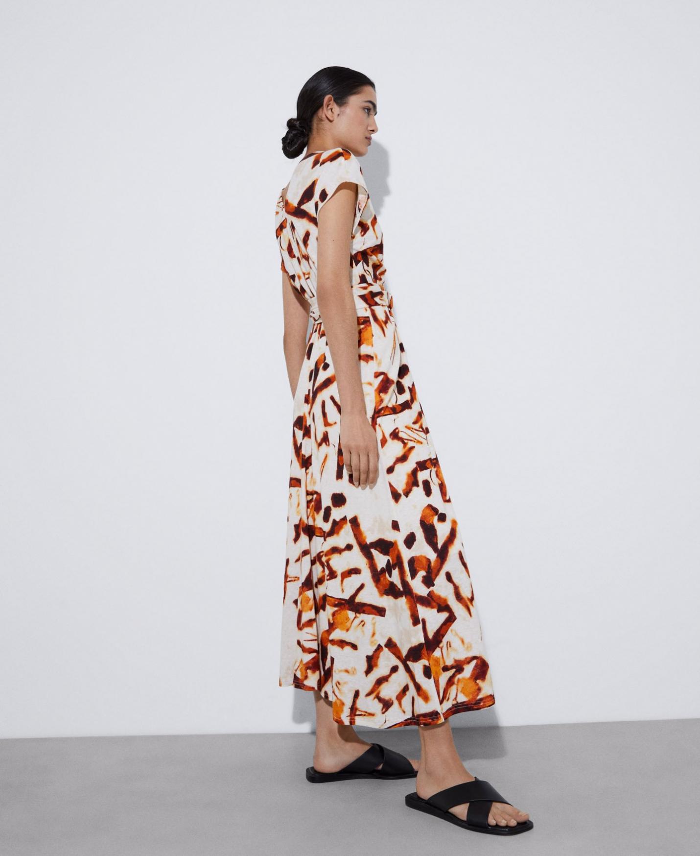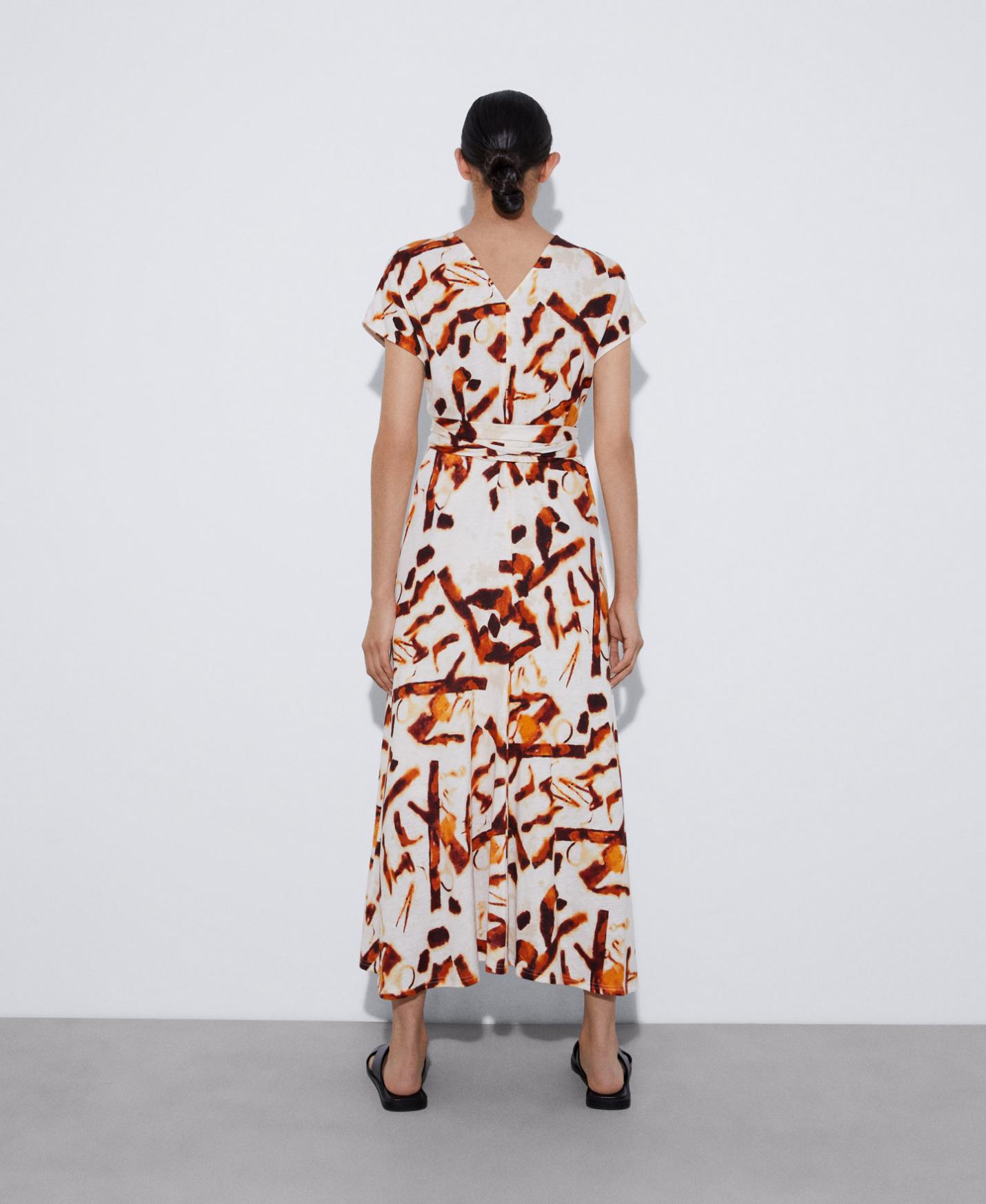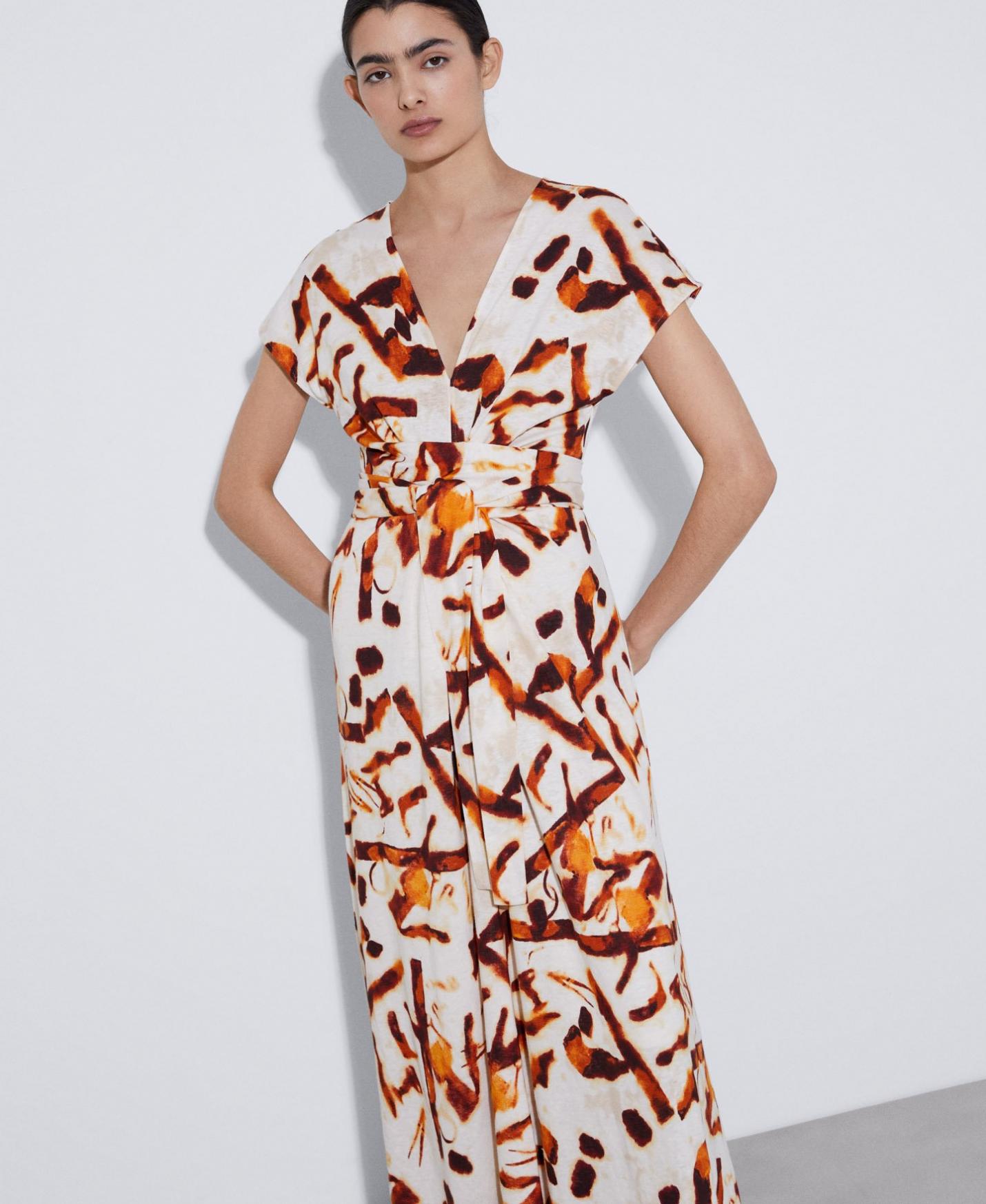 DescripciónRef.292302041121 Vestido estampado en punto de lino europeo. Escote cruzado anudado en la cintura, línea recta y largo sobre tobillo. lino europ…