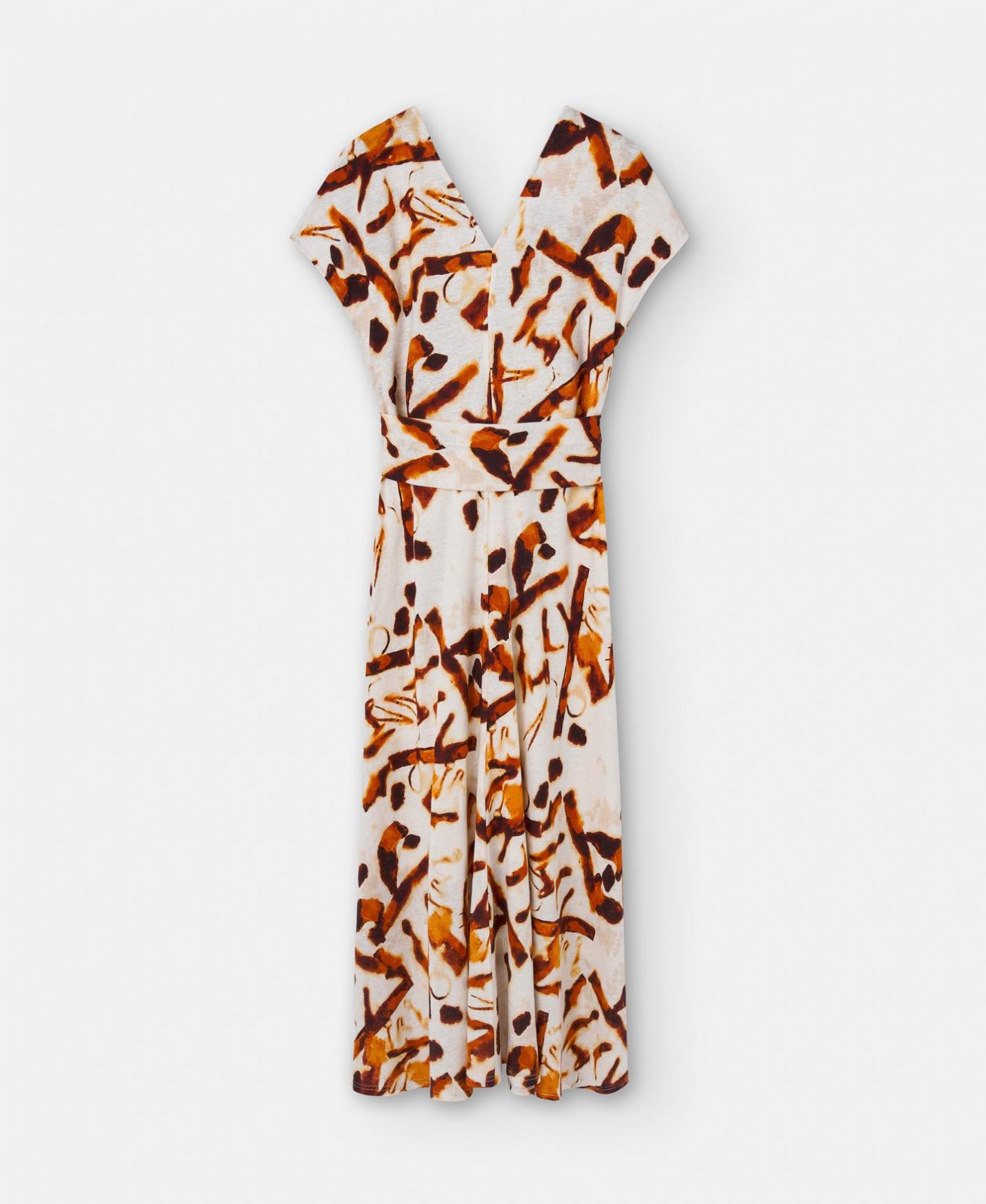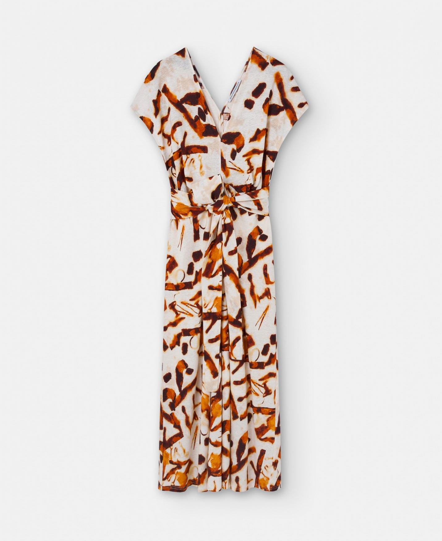 Vestido estampado en punto de lino europeo. Escote cruzado anudado en la cintura, línea recta y largo sobre tobillo.