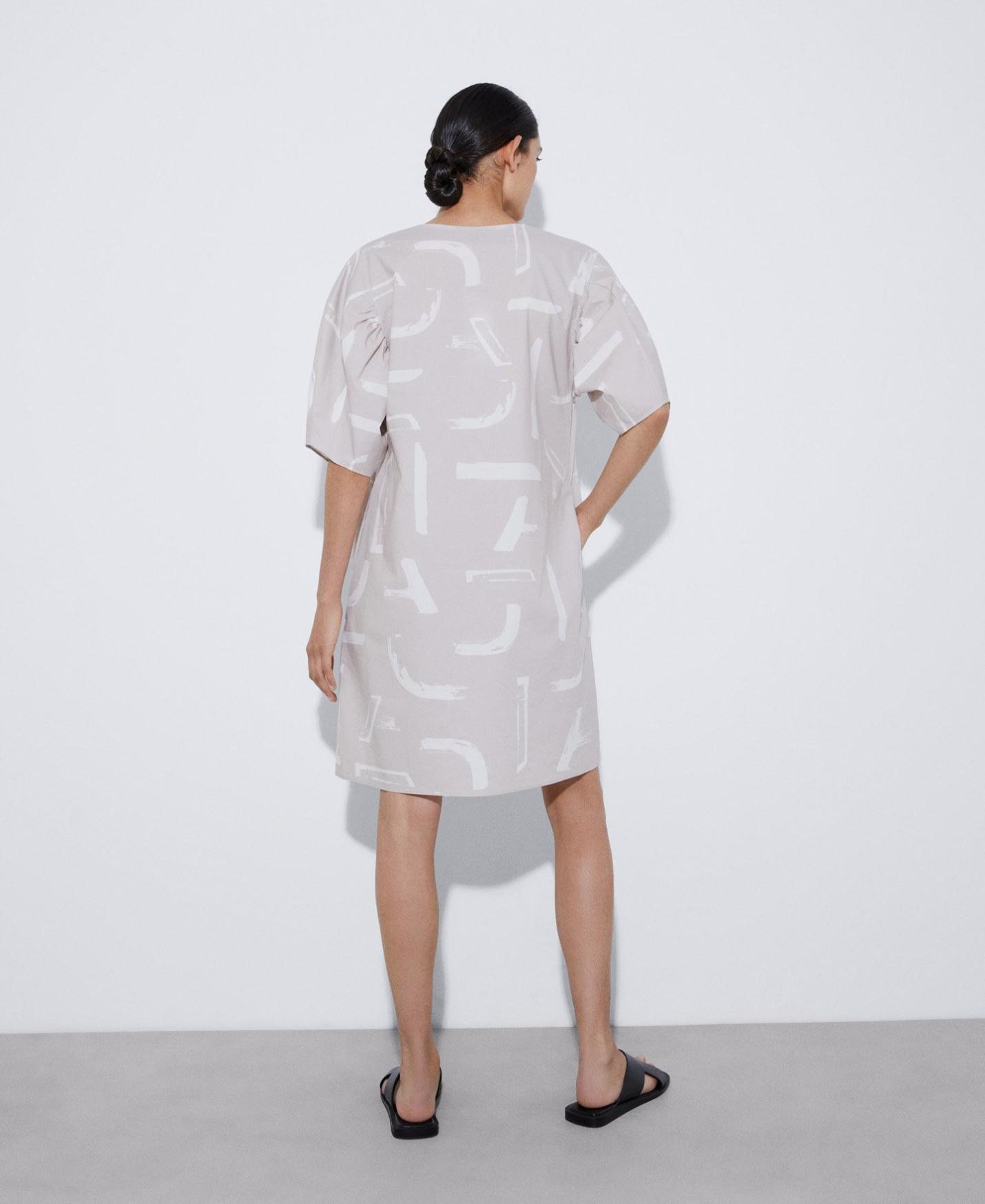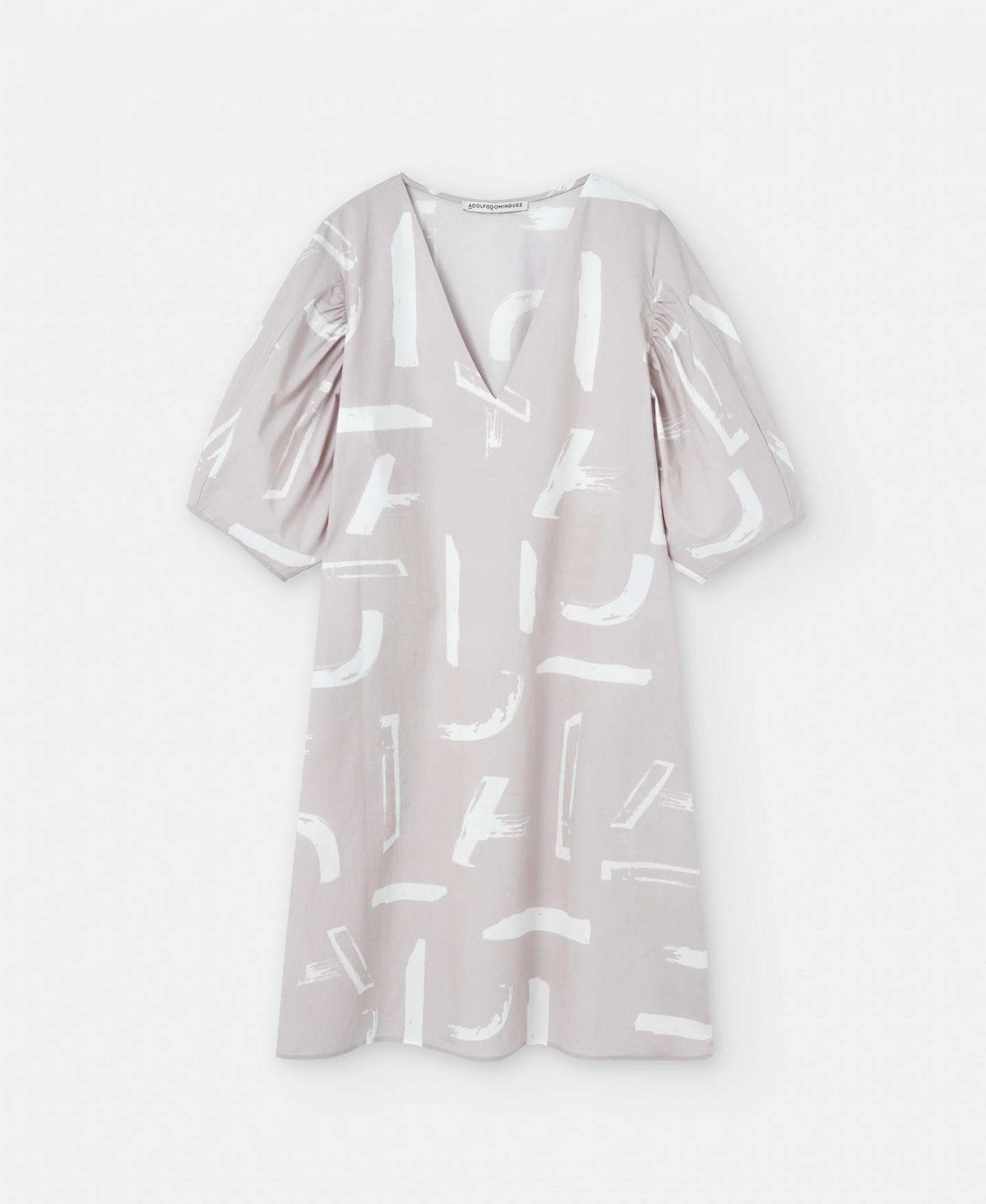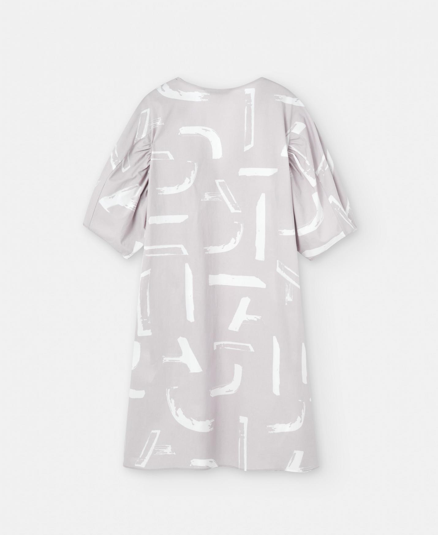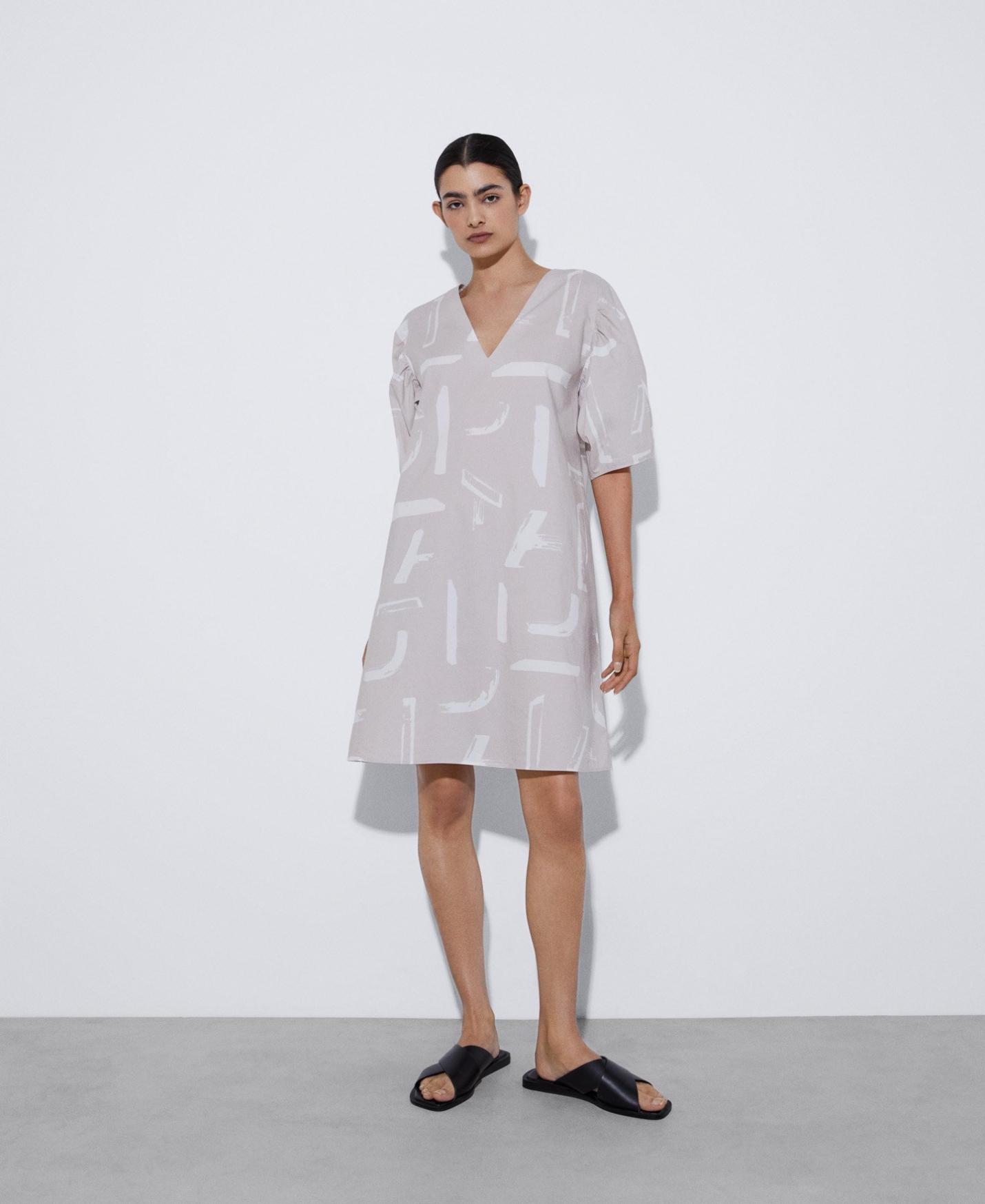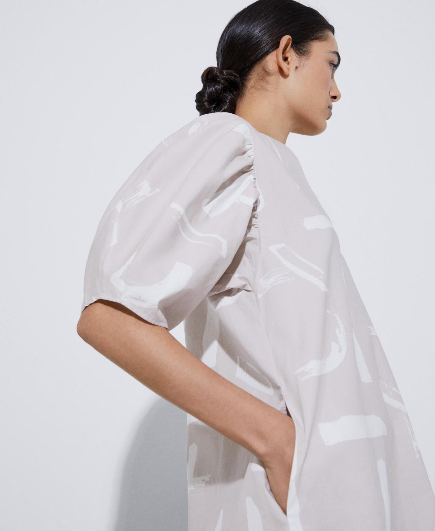 Vestido corto estampado de línea A en 100% algodón orgánico. Tiene escote pico y manga abullonada fruncida.