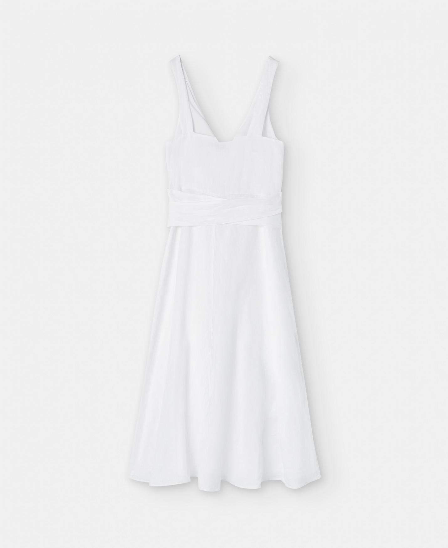 Vestido de tirantes ligeramente evasé en 100% lino europeo. Anudado en cintura, largo bajo rodilla.